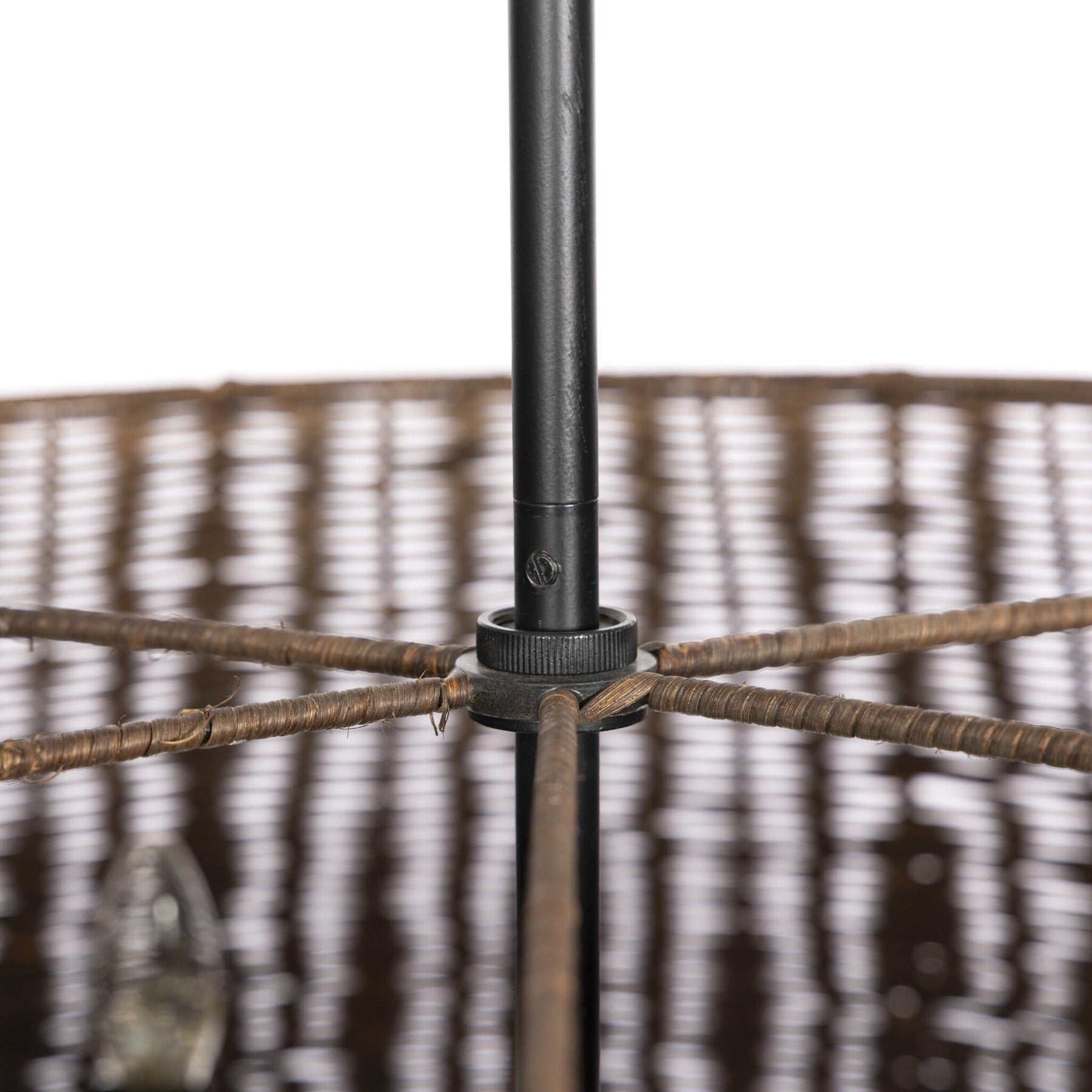 A texture-rich rattan shade covers four candlestick-inspired arms finished in a jet black, with vintage French-inspired ball and hook detailing. Adaptable to slanted ceilings, this fixture casts a warm, diffused glow perfect for dining spaces or entryways.