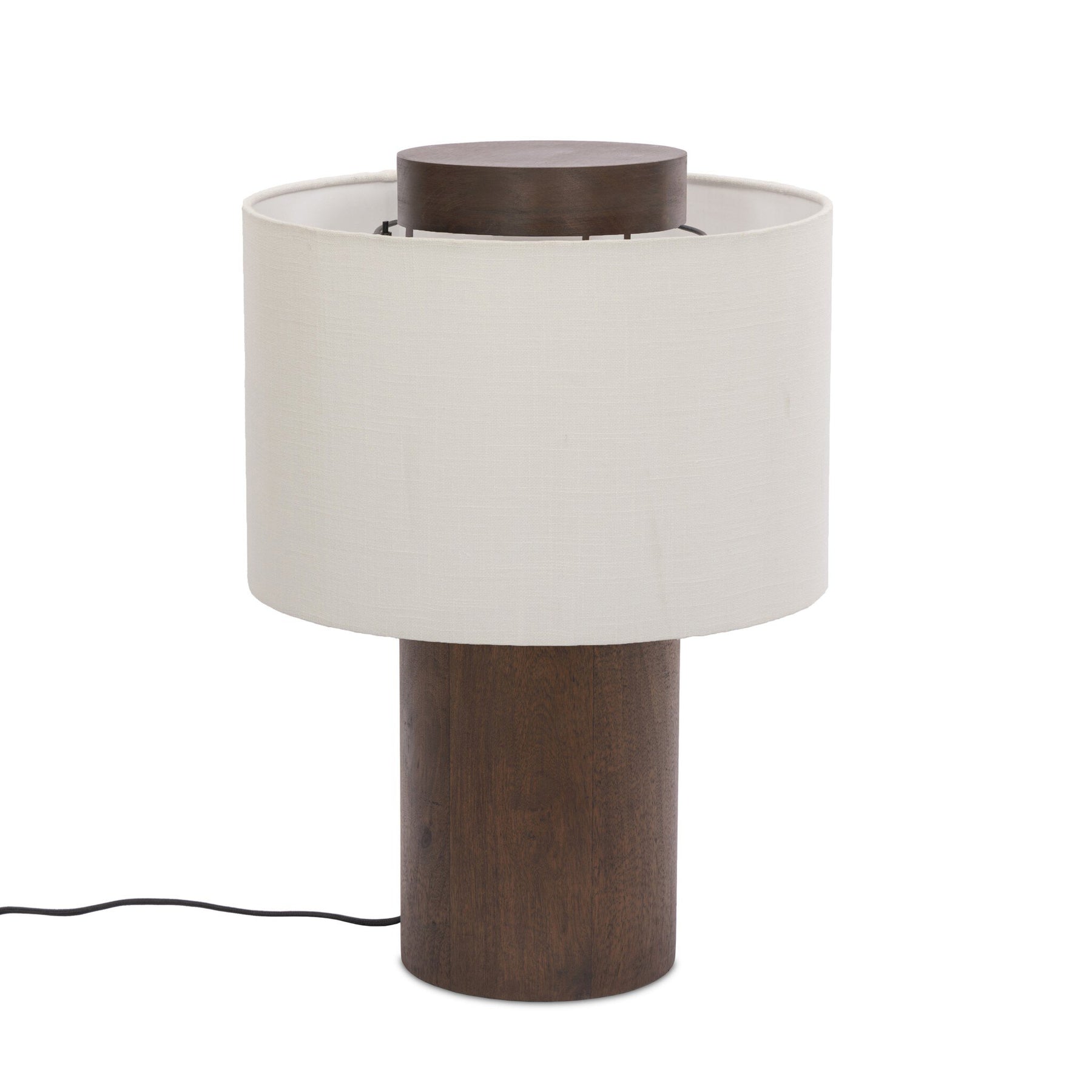 A clean silhouette of mango wood is complemented by the suspended shade of this table lamp.