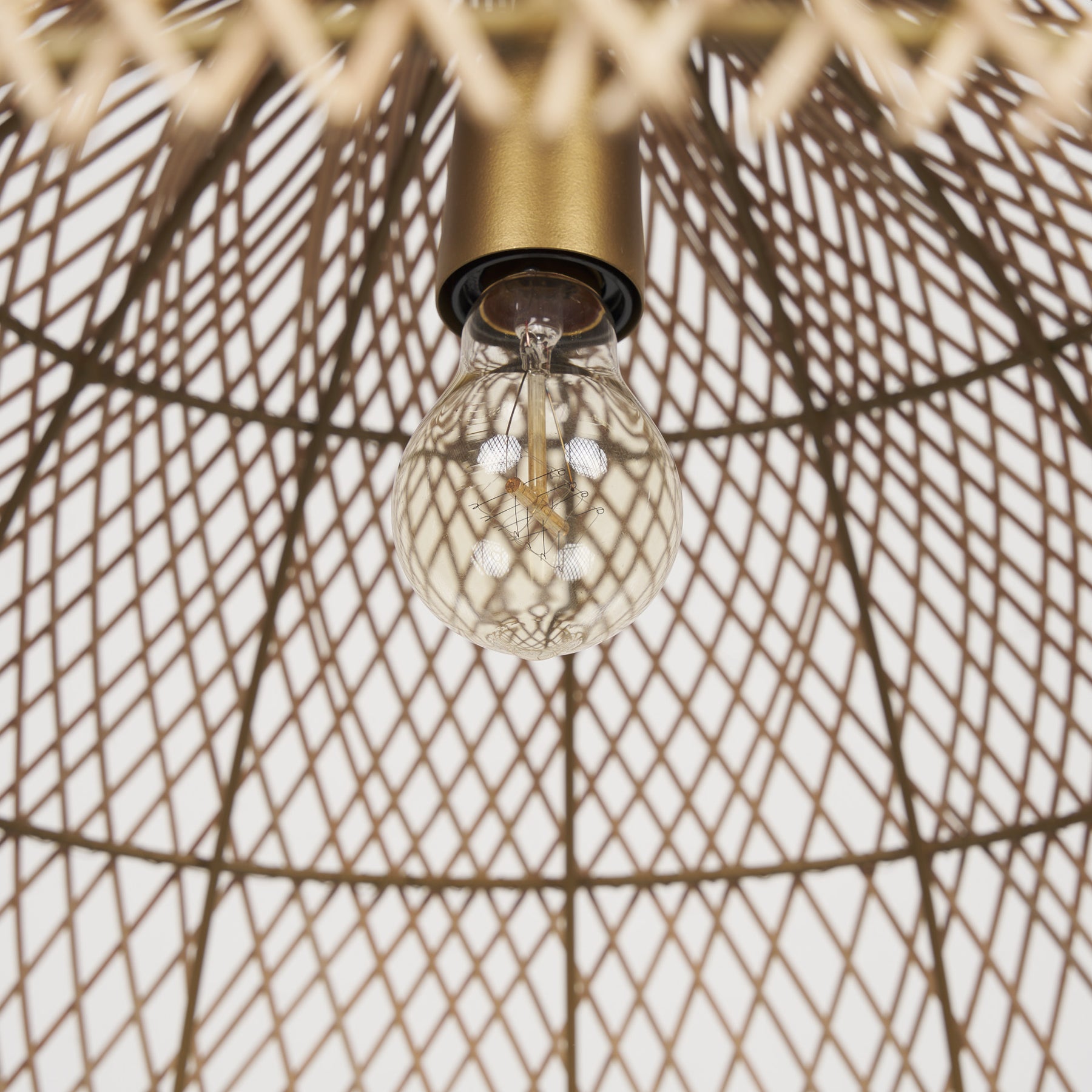 The Trisha Pendant features an intricately woven rattan dome shade with a dainty gold-finished metal frame. Woven in a diamond-shaped pattern and delicately tied onto the metal wire, the rattan extends below the rim, creating a fringe-like effect. With an adjustable chain that has maximum hanging height of 84" and a capacity for up to 100 watts, the Trisha Pendant Light offers both versatility and style to illuminate any space with ease.
