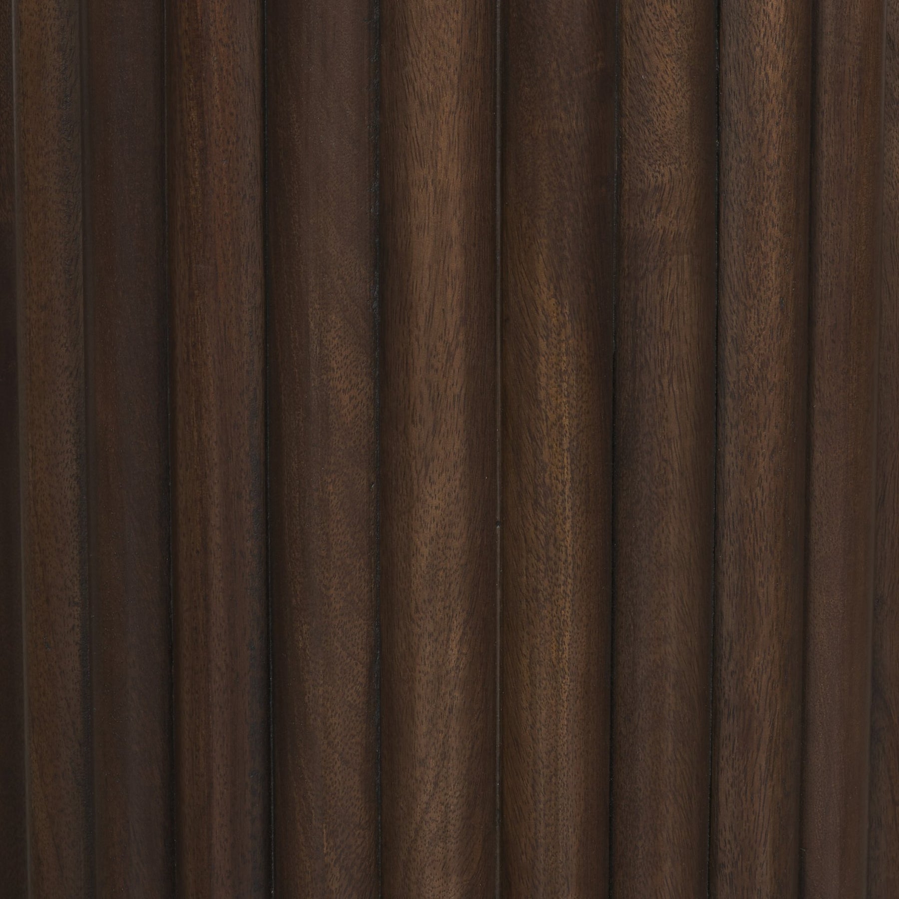 The Arabella Side Table features a round solid pink marble top set on a fluted espresso base with a recessed bottom.