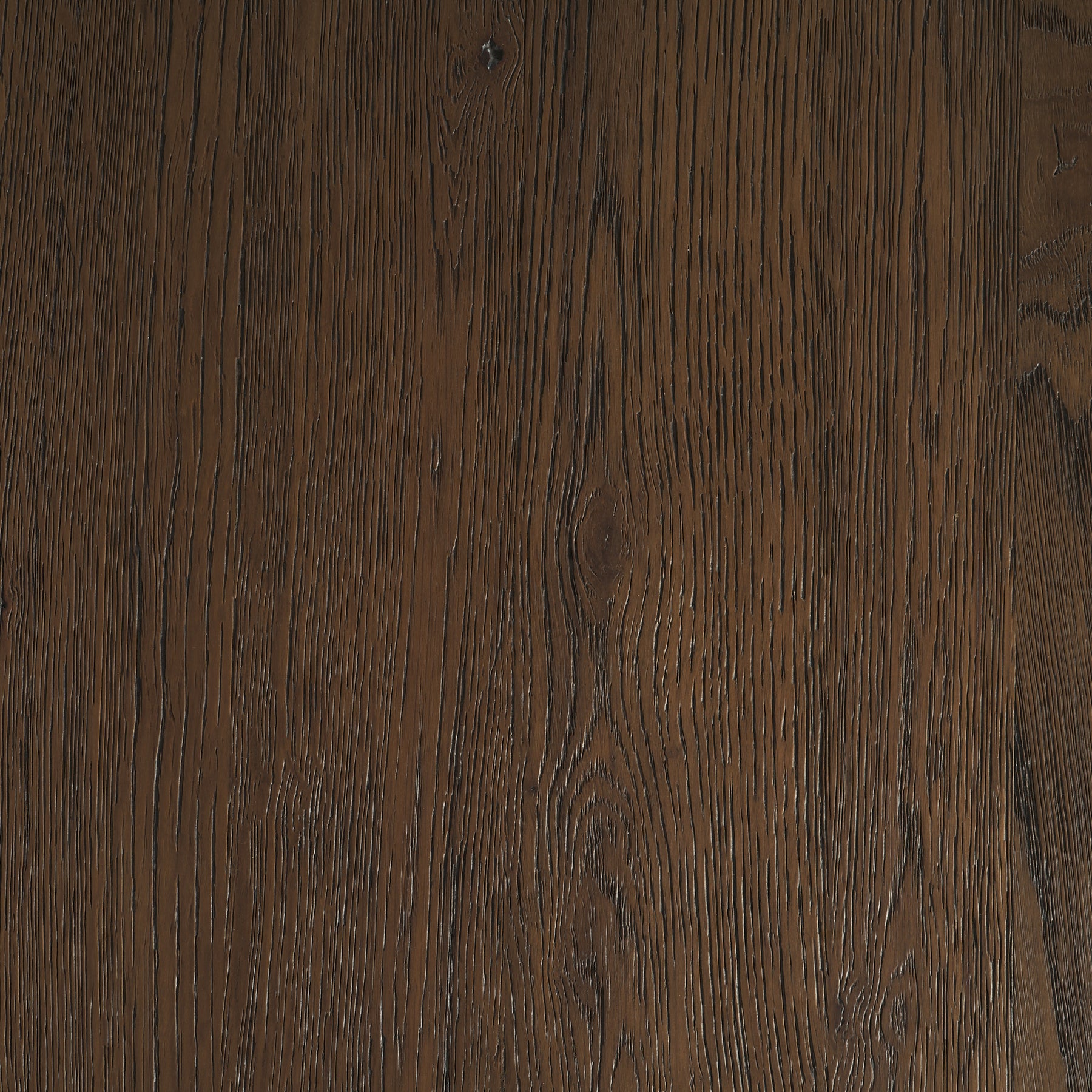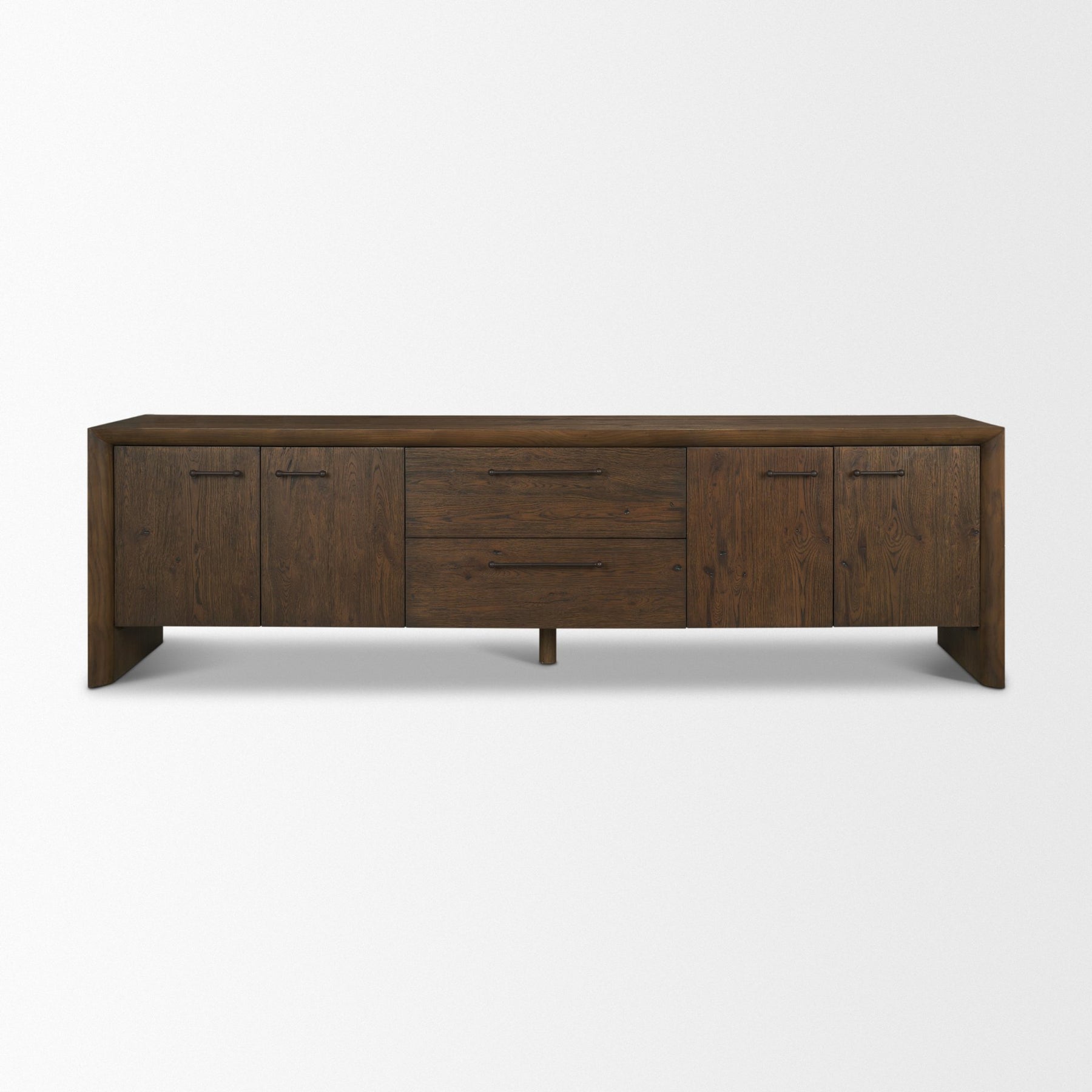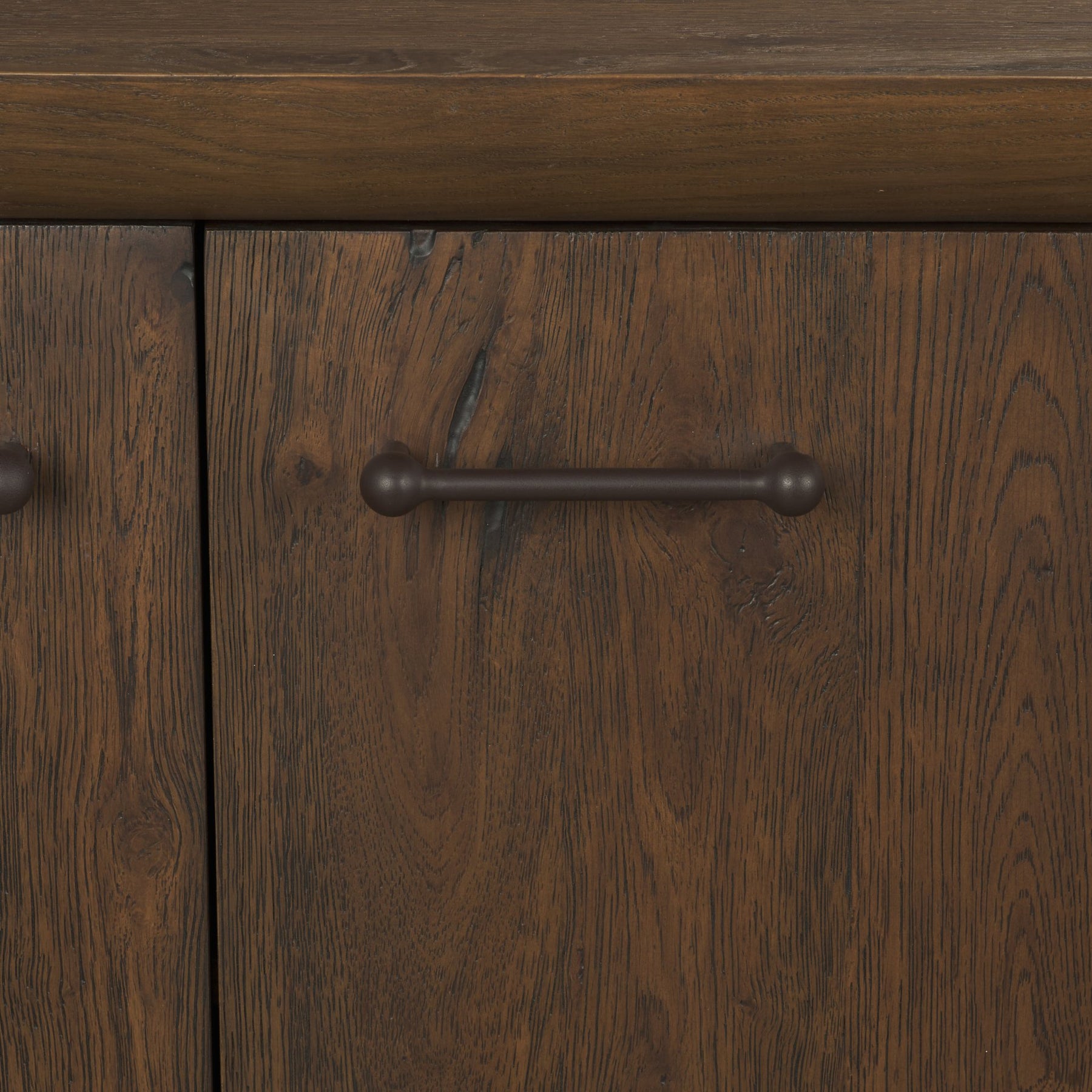 The Baylor 94" Media Console is crafted from solid oak and grain-matched oak veneer, finished in a dark brown rough wire-brushed texture that enhances the natural character of the wood.