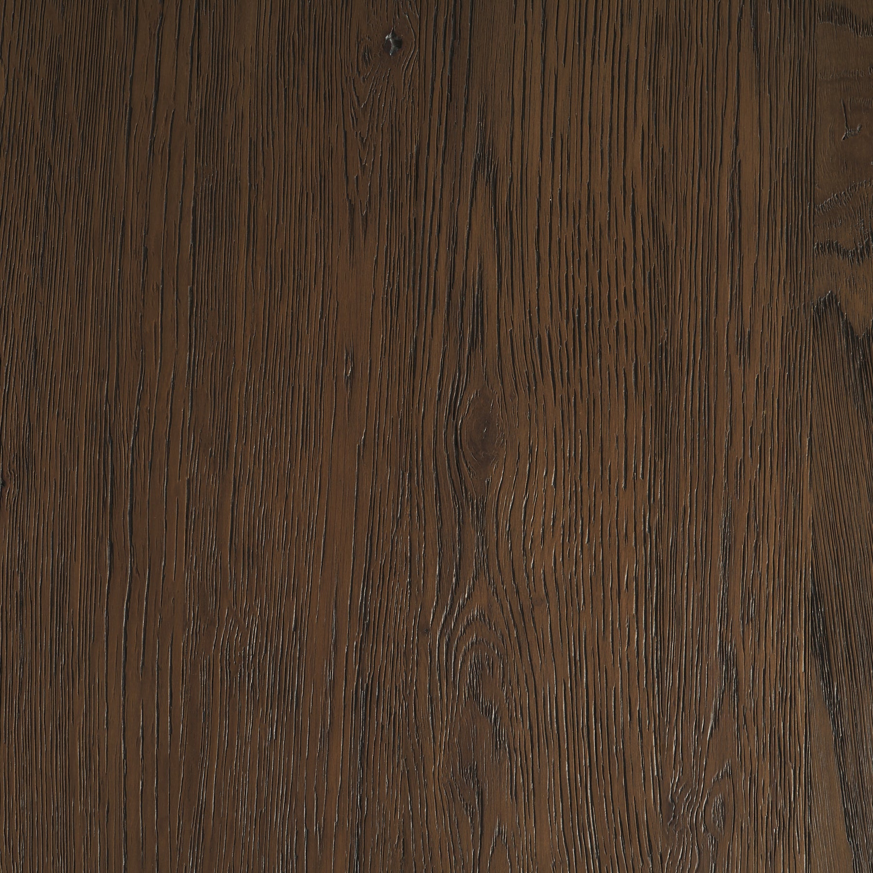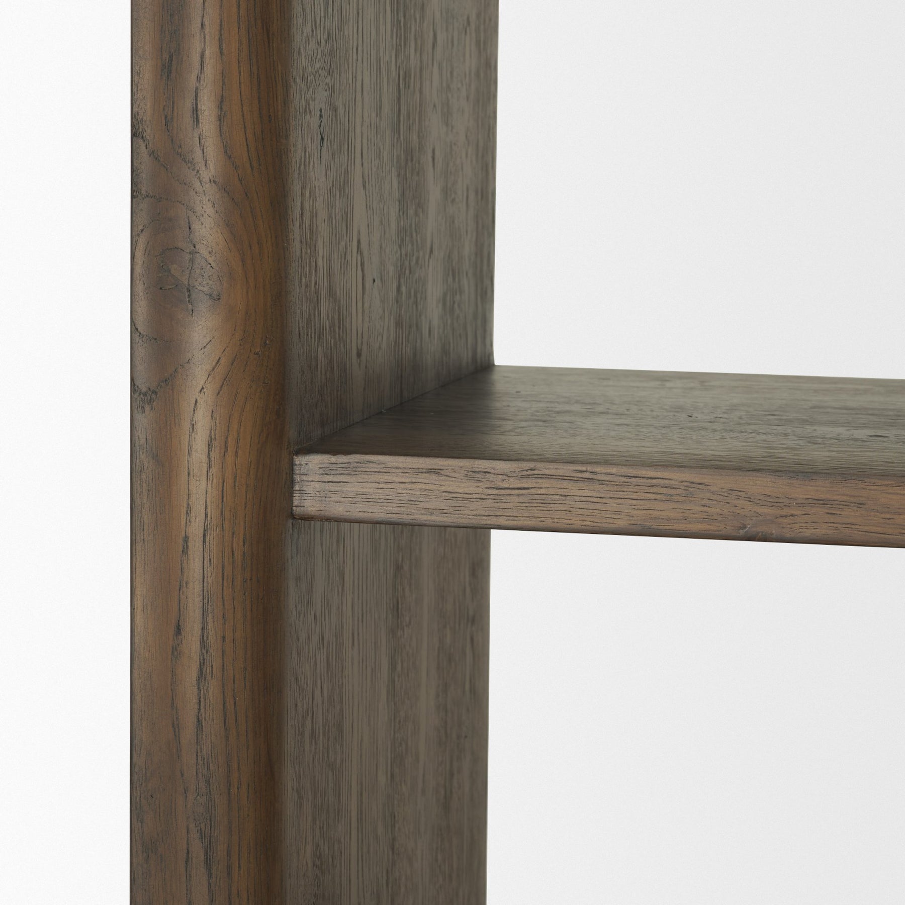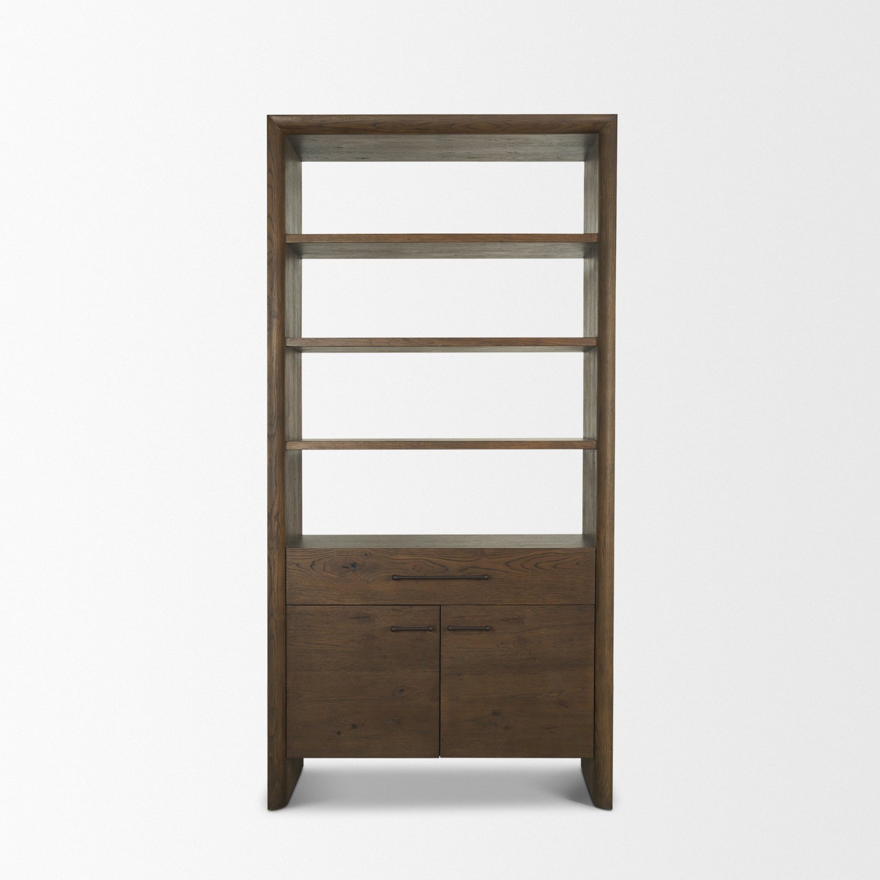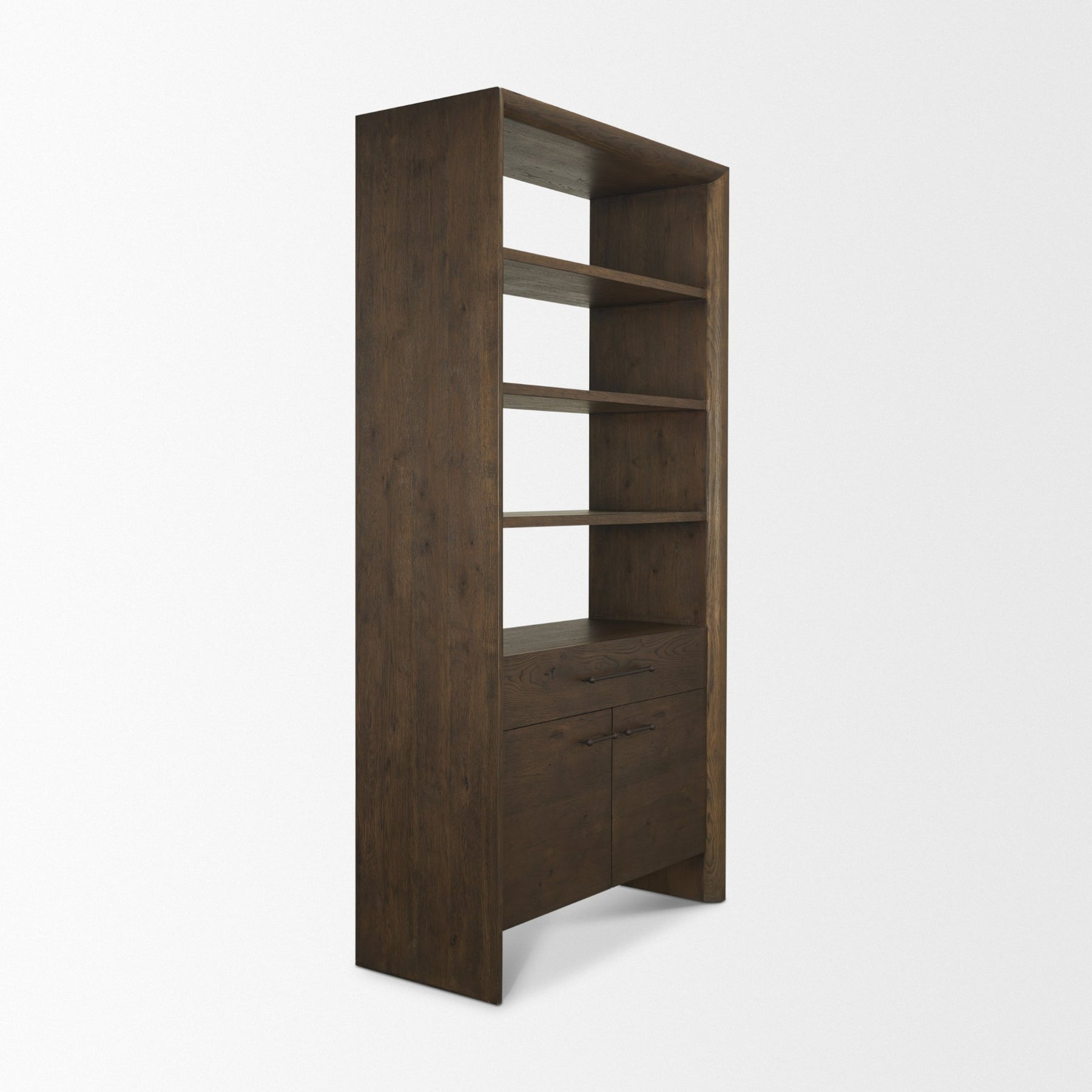 The Baylor two-door open shelving unit is crafted from solid oak and grain-matched oak veneer, finished in a dark brown rough wire-brushed texture that enhances the natural character of the wood.