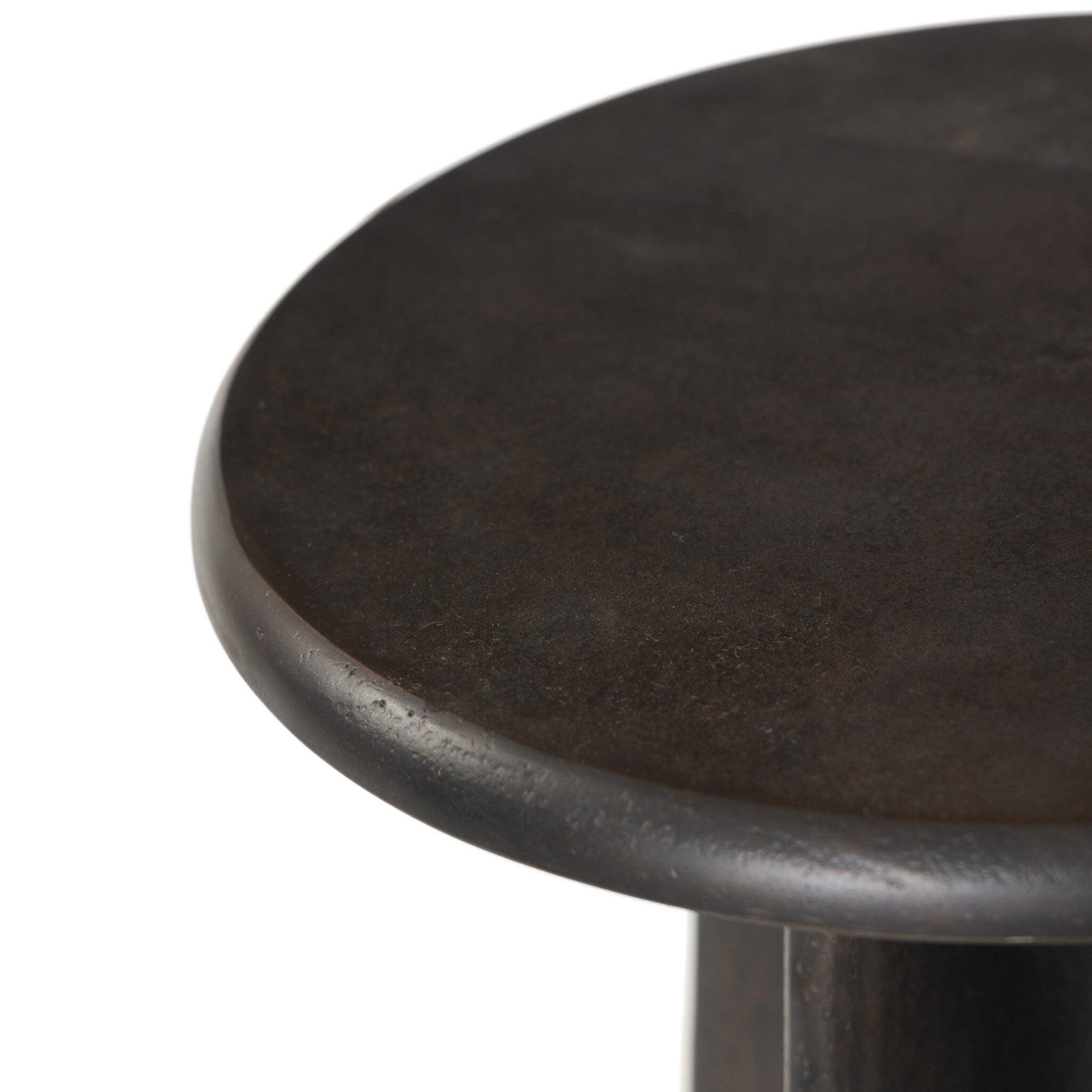An aluminum end table features a softened X-shaped base, finished in distressed bronze. Perfectly sized for your morning coffee or evening nightcap.
