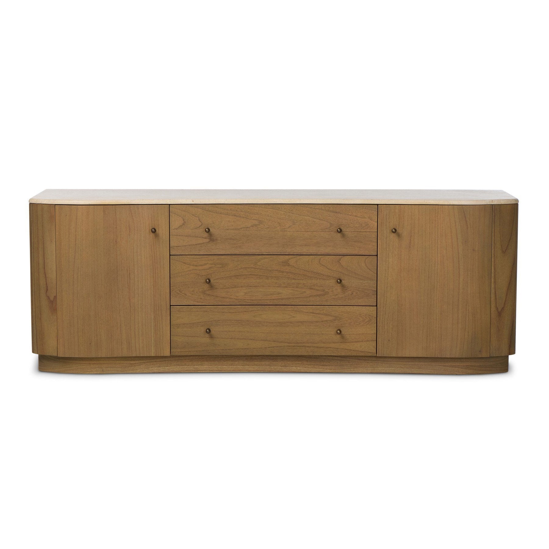 Fluid contours give shape to this solid mindi media console, topped with a creamy marbled top. Two doors with knobbed pulls and three drawers open to spacious storage.