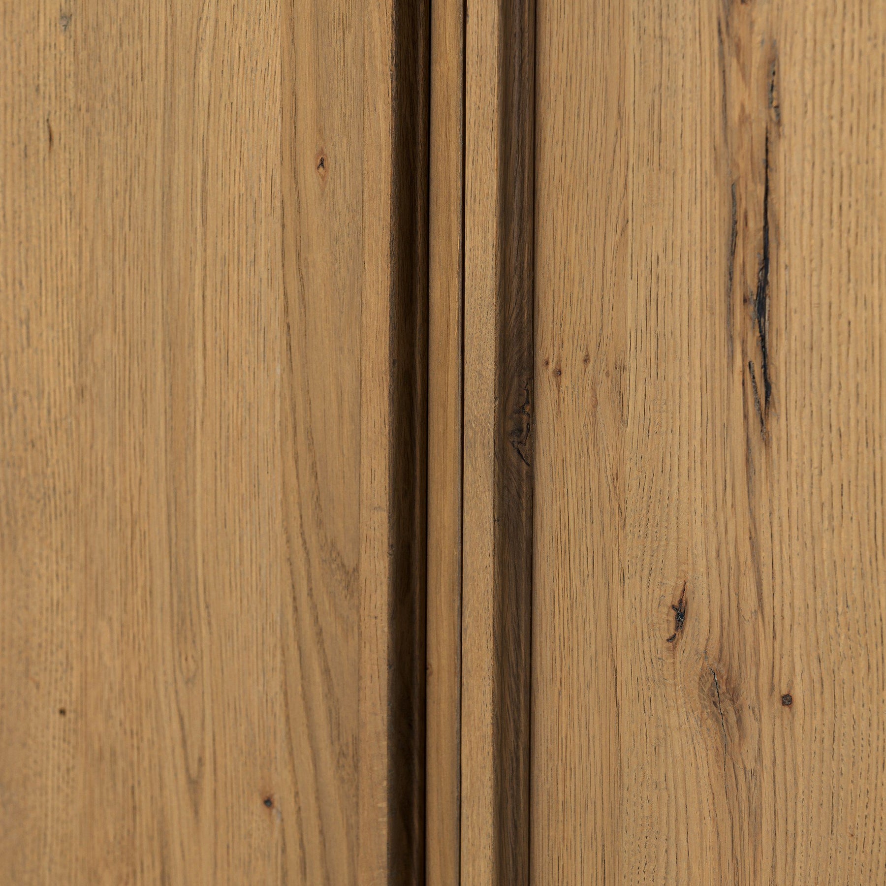A light, clean storage look inspired by Japanese tea houses. Crafted of aged natural oak with cross lap joinery, lower shelving brings even more storage to the whole piece.
