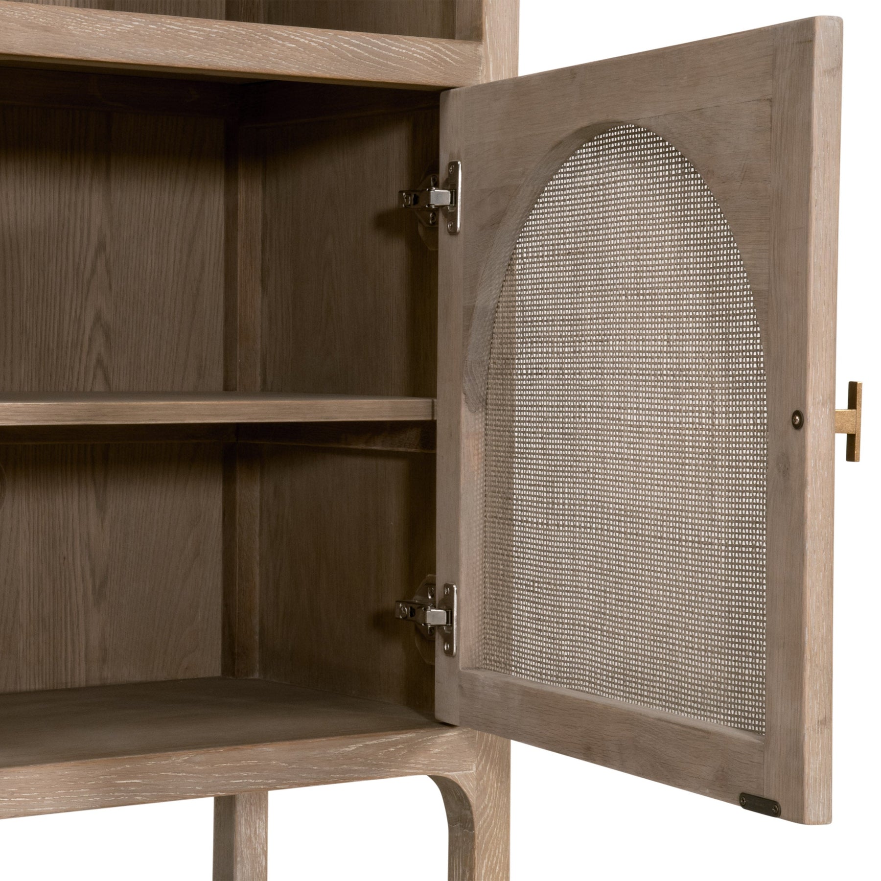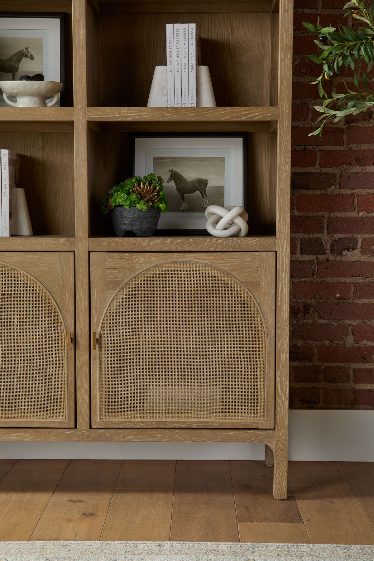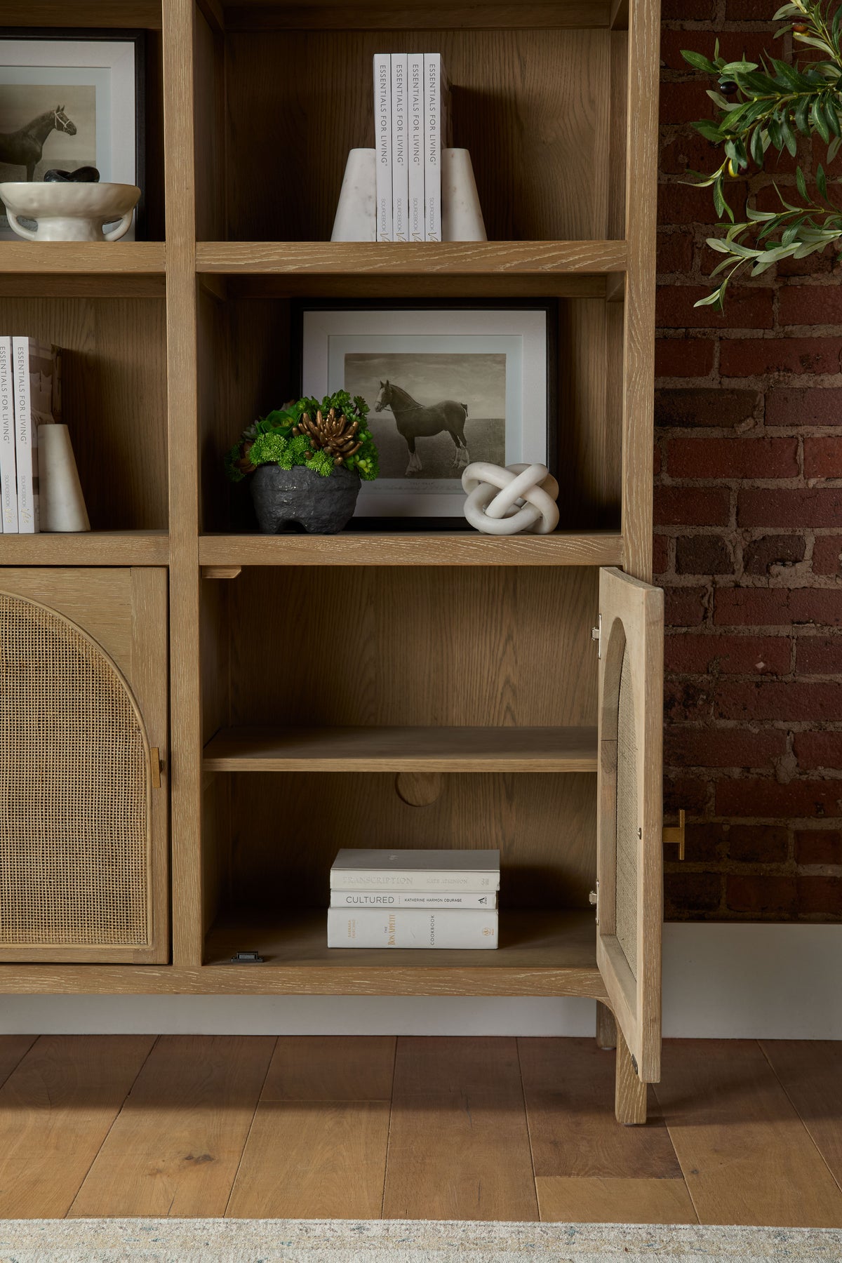 The Claude Storage Bookcase blends solid oak craftsmanship with elegant cane inlay and brushed gold accents. It offers spacious cabinets with magnetic doors, adjustable shelves, and open display areas, all designed to keep your space organized and stylish.