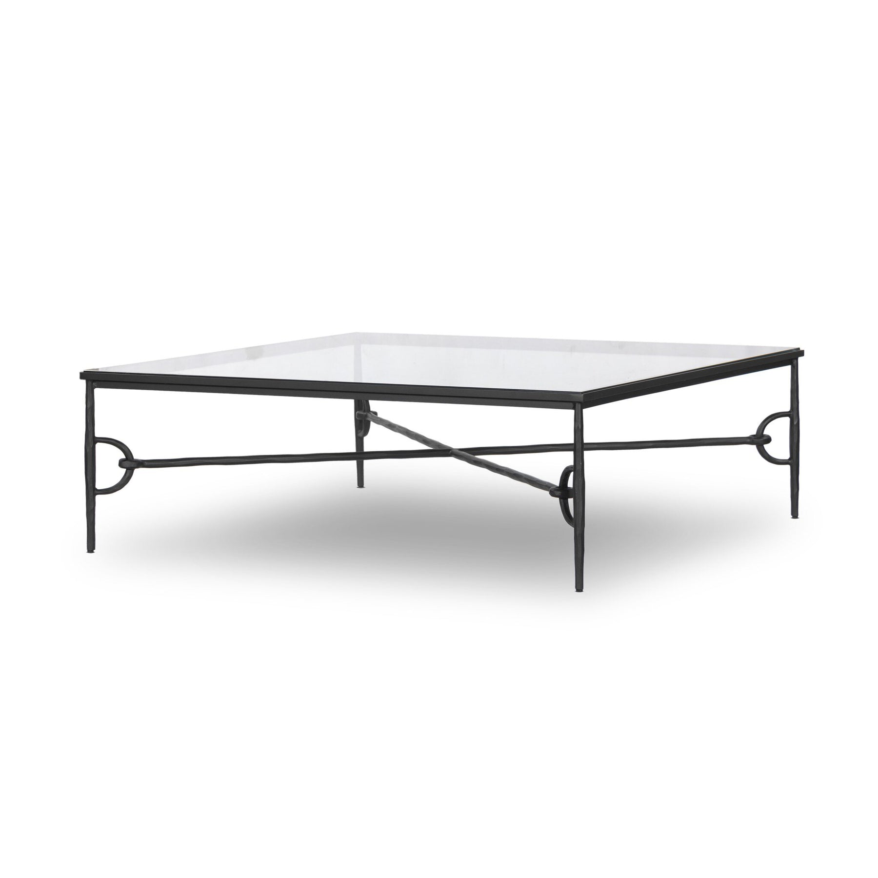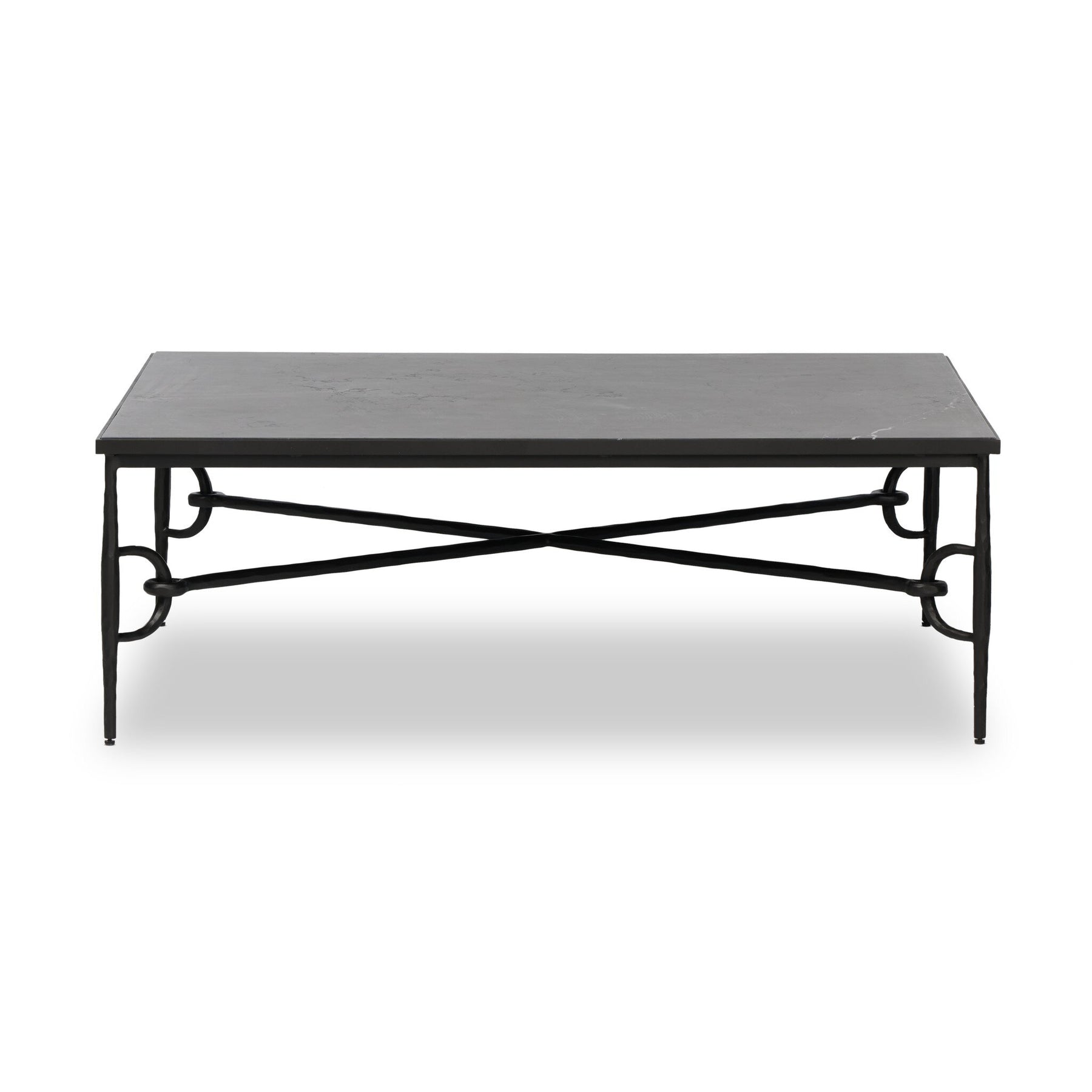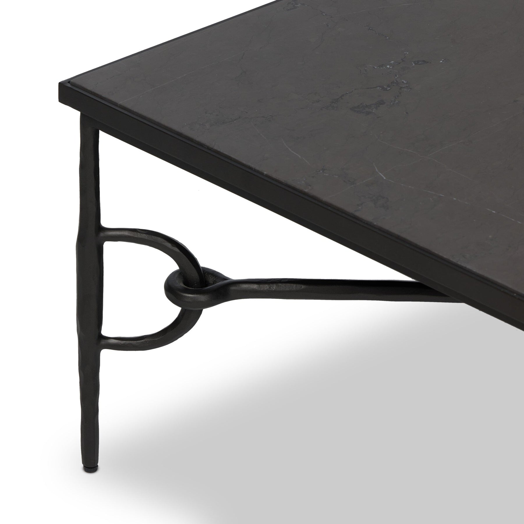 A slim, spare frame of hammered gunmetal pairs beautifully with your choice of tempered glass or marble — including elegant Italian marble — to create a clean and timeless coffee table look. Stretchers attach to metal loops, adding an elevated design detail that enhances its refined simplicity.