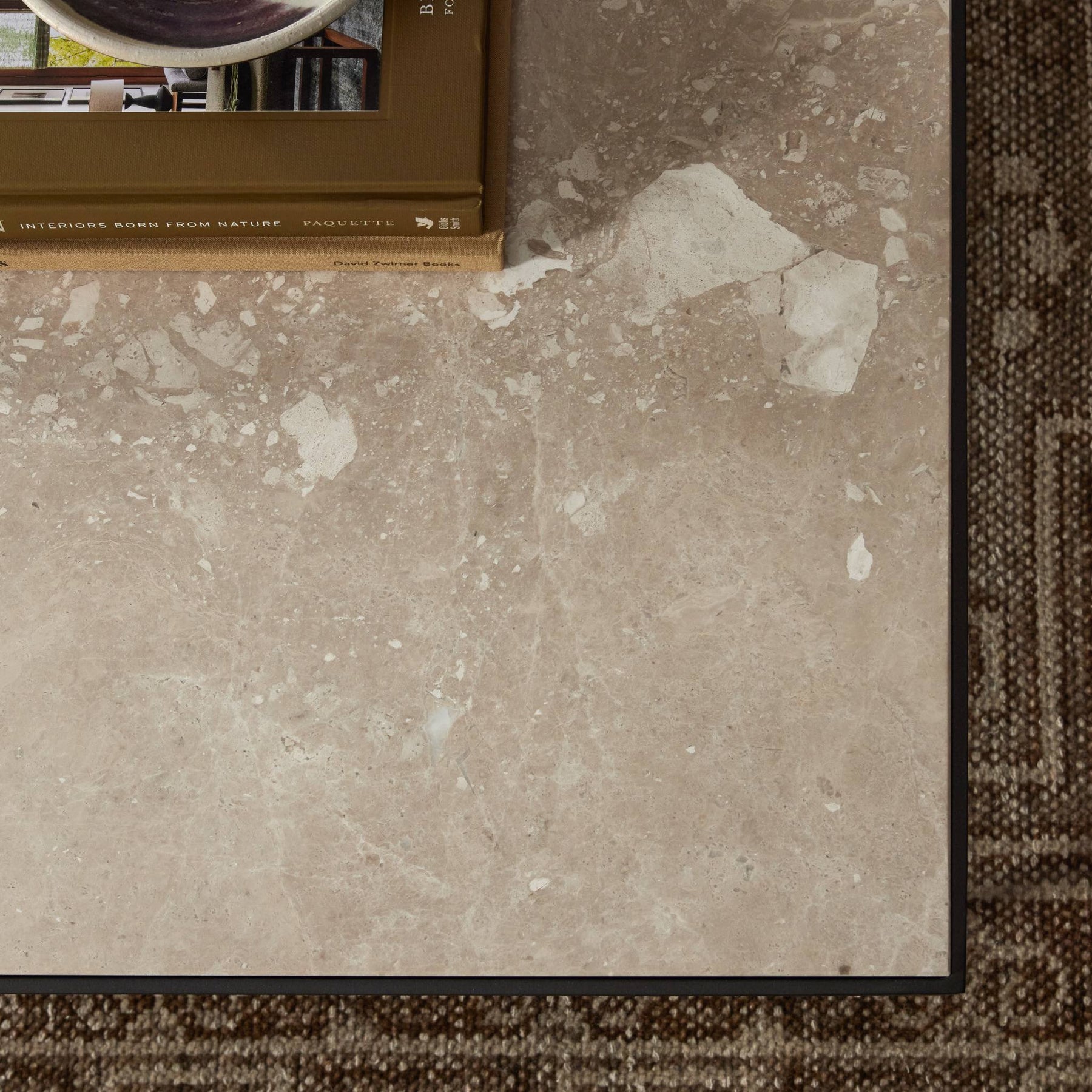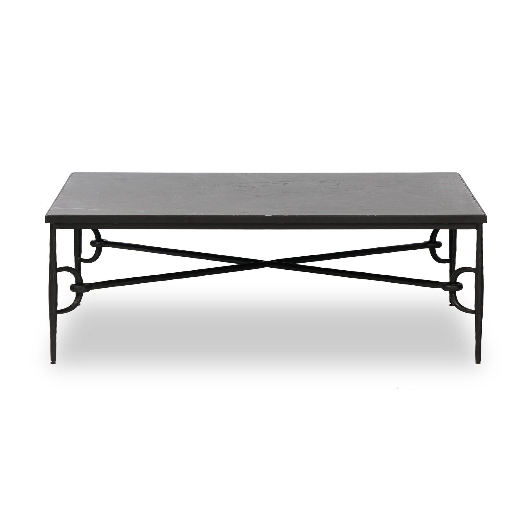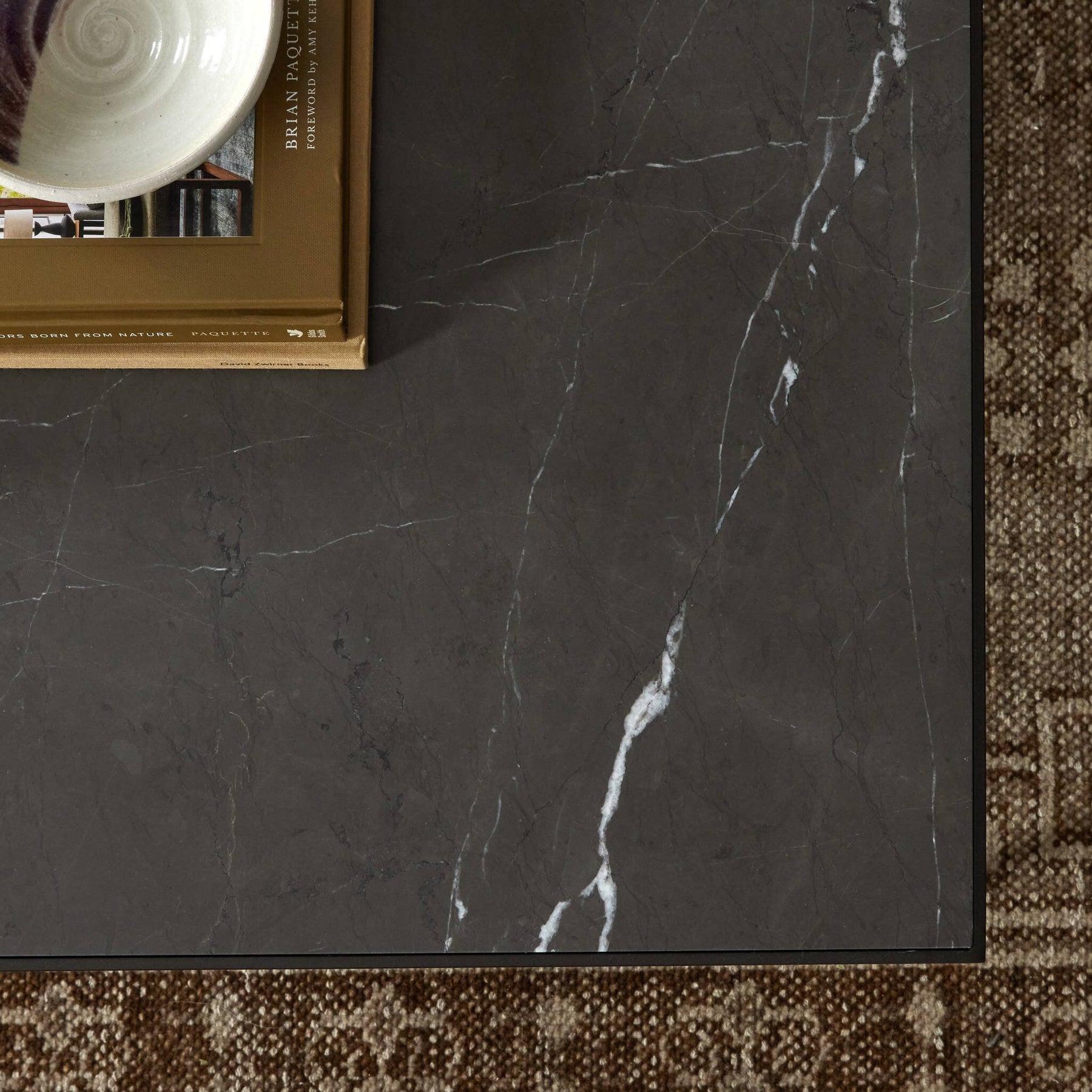 A slim, spare frame of hammered gunmetal pairs beautifully with your choice of tempered glass or marble — including elegant Italian marble — to create a clean and timeless coffee table look. Stretchers attach to metal loops, adding an elevated design detail that enhances its refined simplicity.
