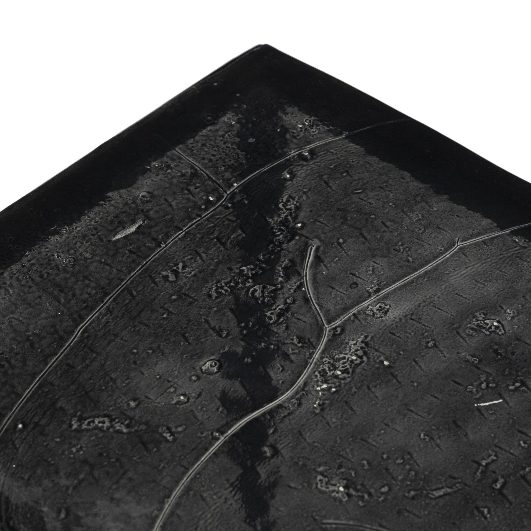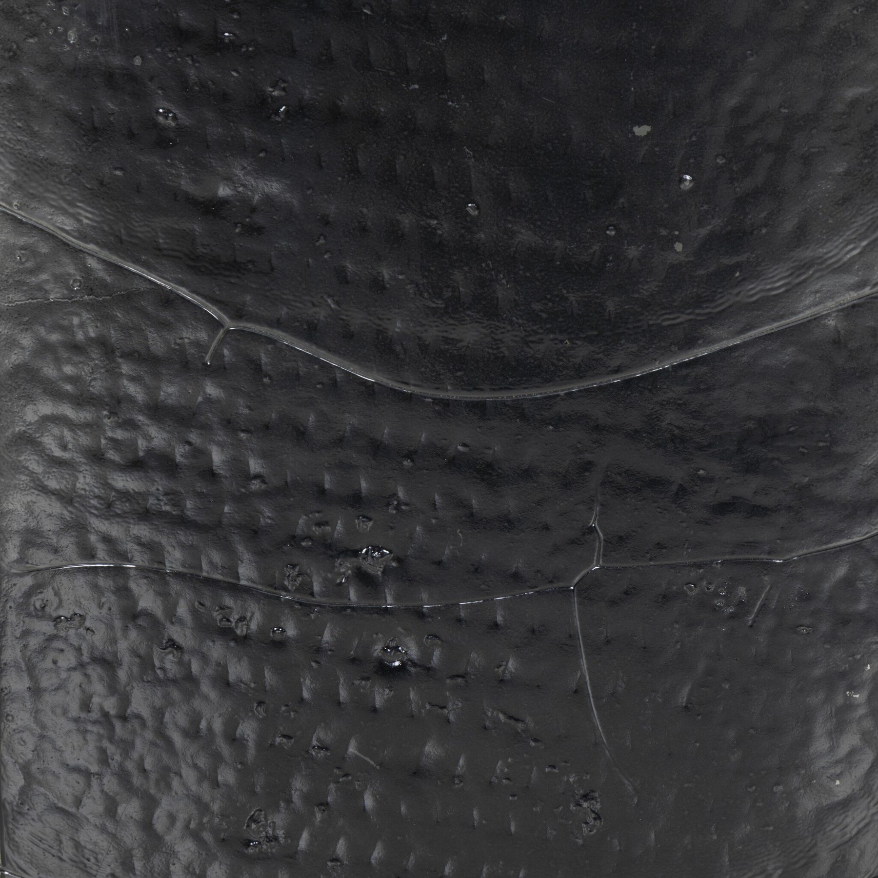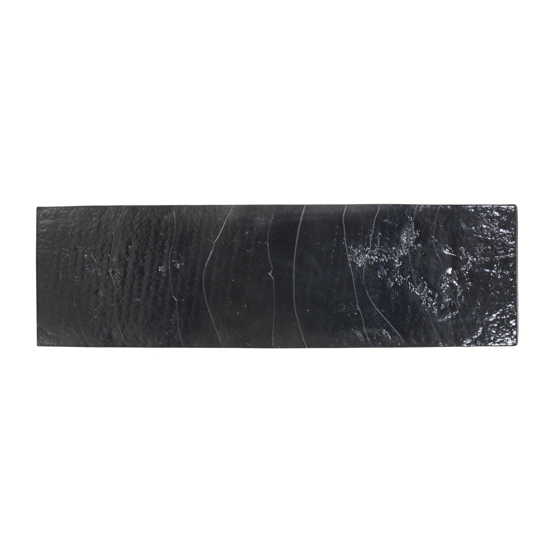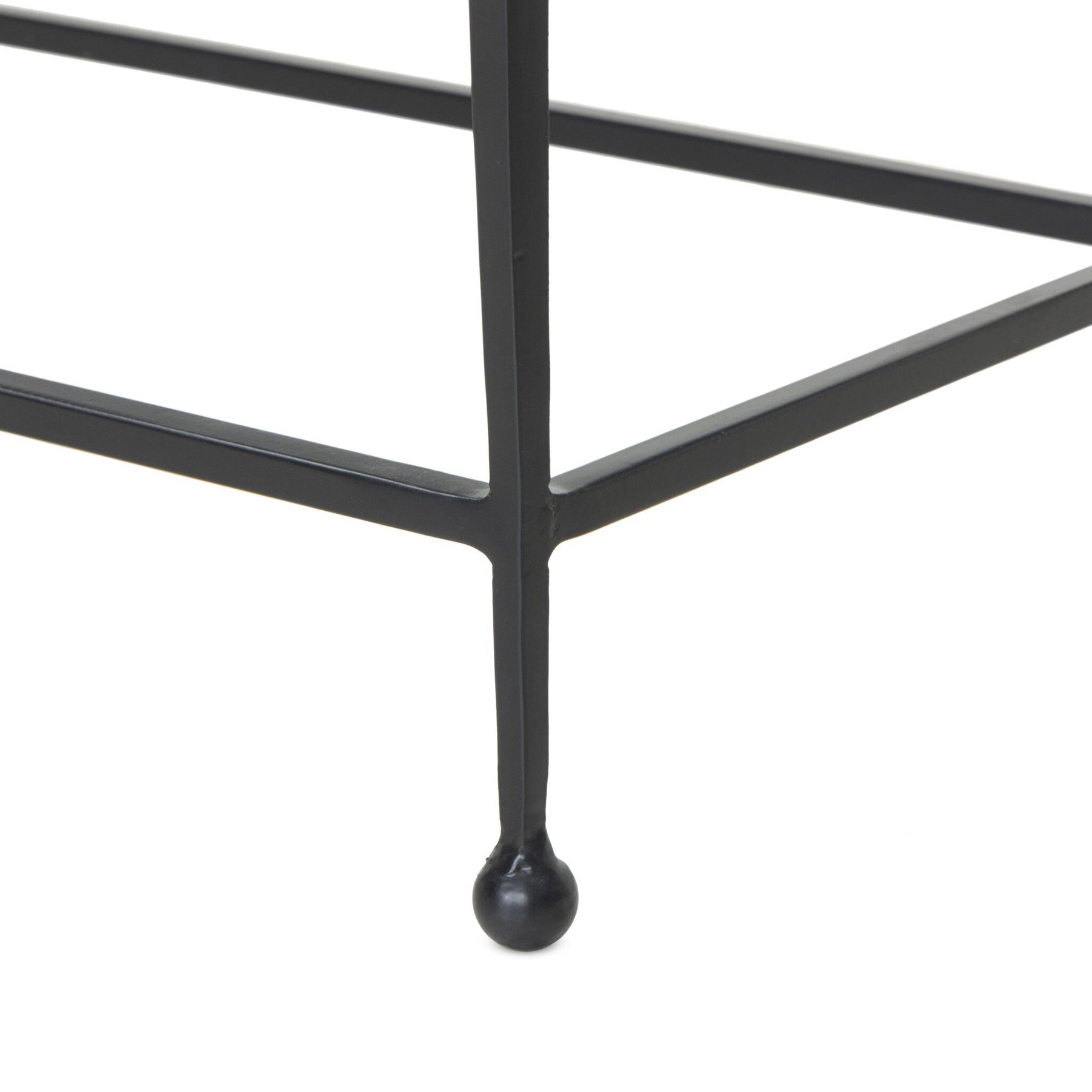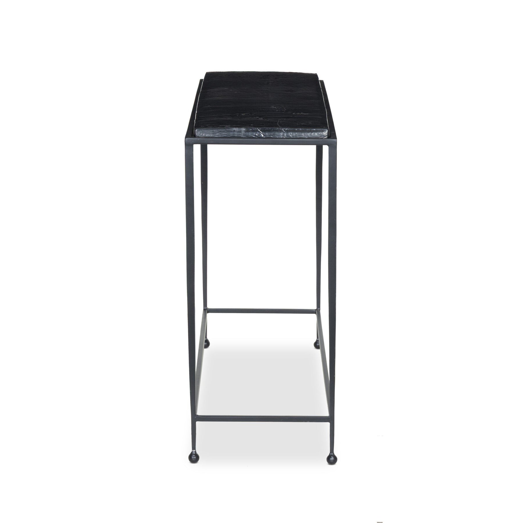 A slim, airy base of black-finished iron supports this console table of smoked black glass.