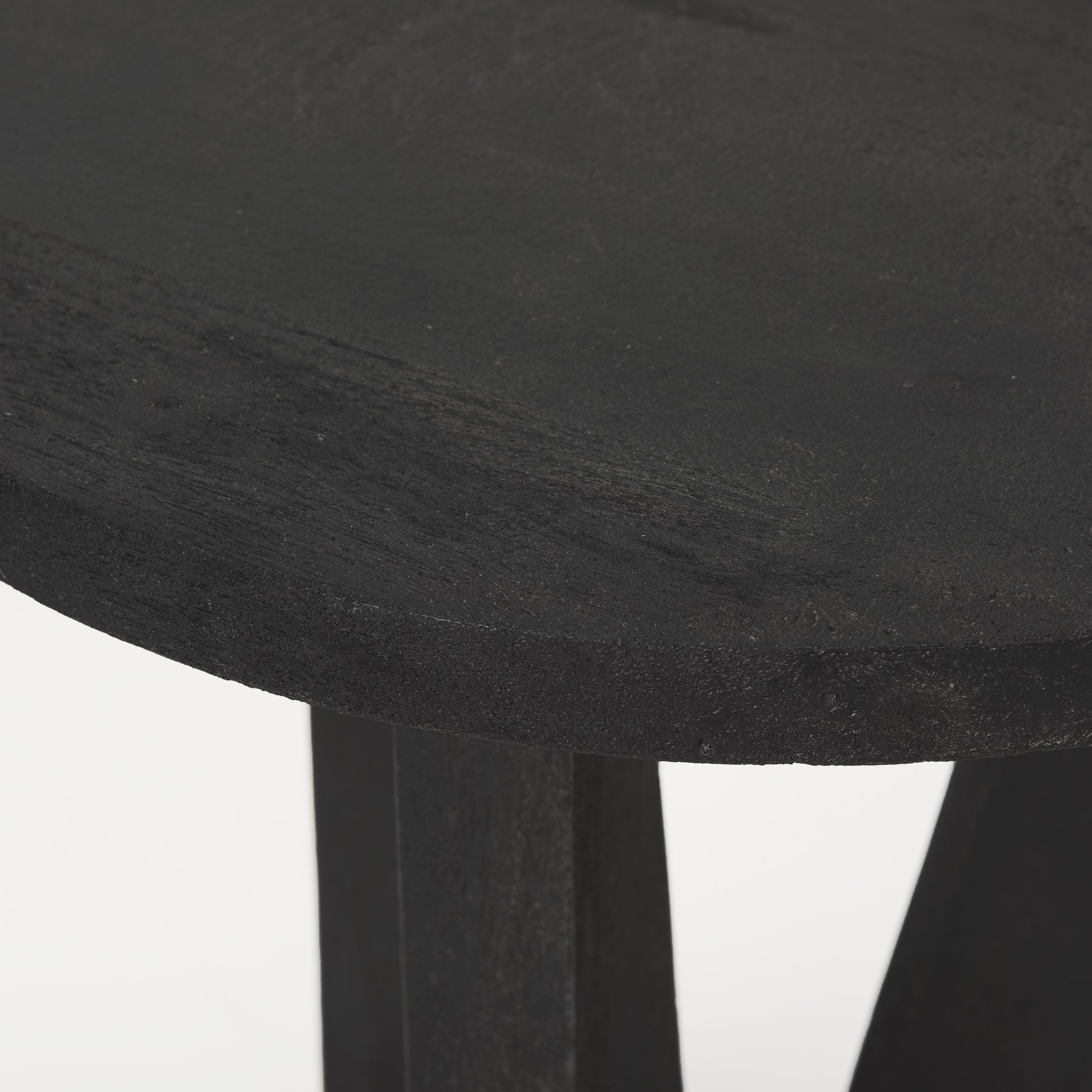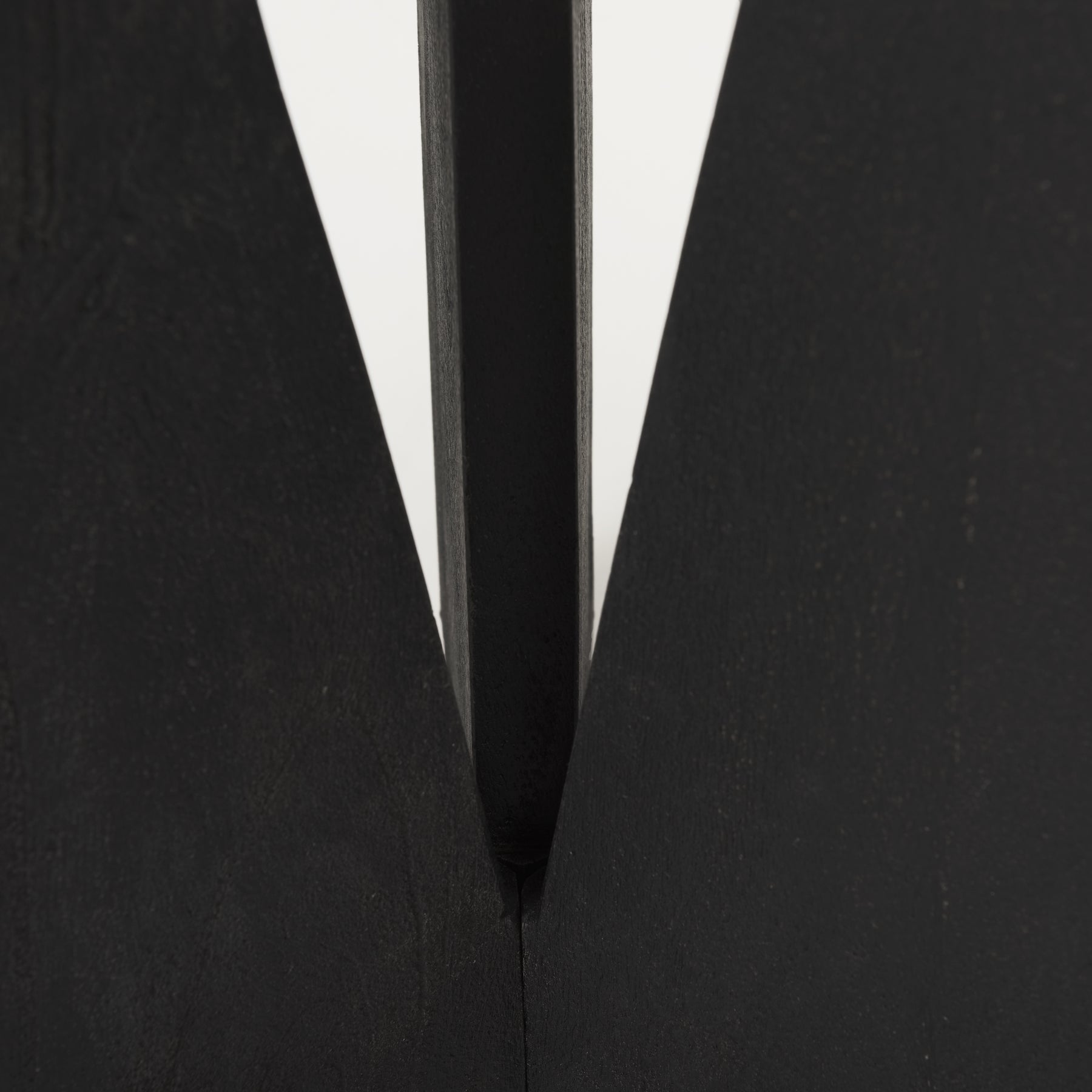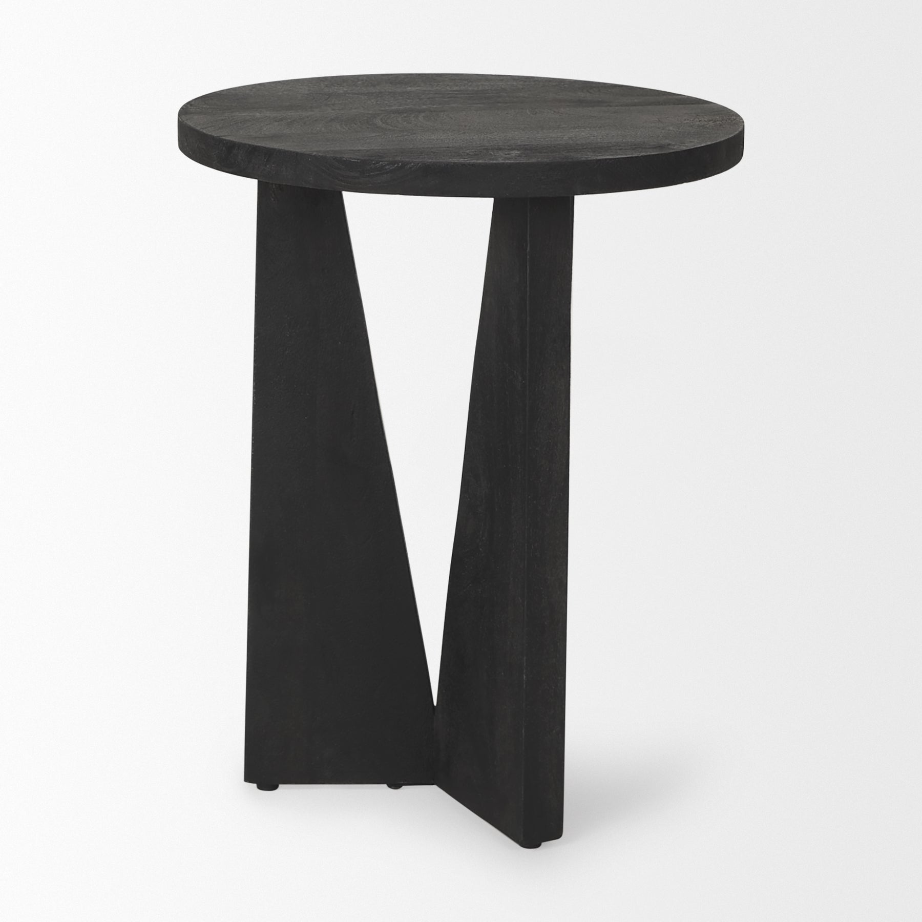 The Debra Accent Table is a modern solid wood piece featuring three geometric, angled legs that create a beautiful, slender silhouette. Its light brown finish highlights the natural wood grain, while the unique black tabletop adds a striking contrast and contemporary touch.