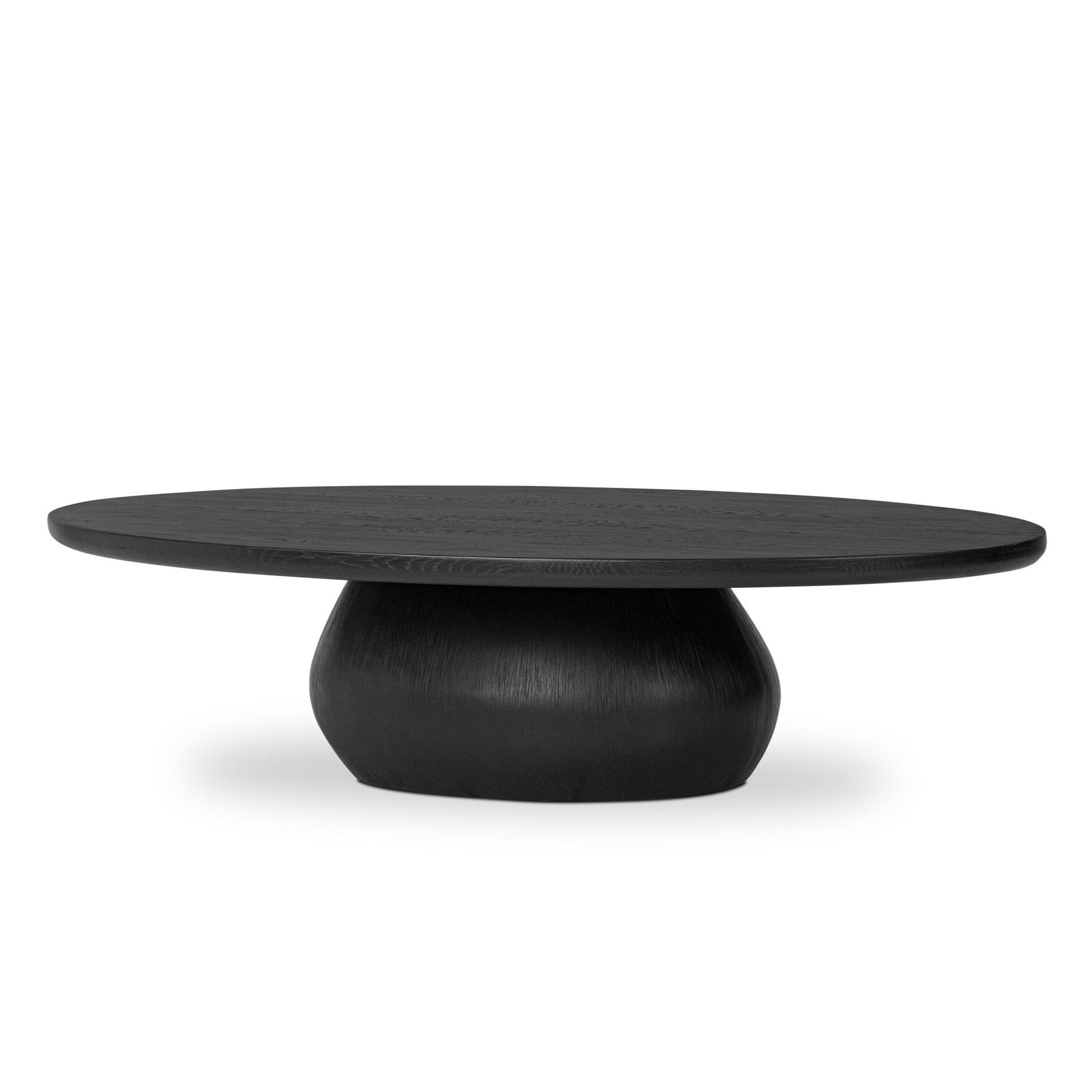 Anchor your space in shape with a beautifully contoured coffee table of worn black resin designed to mimic oak. Rounded oval top features reverse bullnose edging for a design-forward touch.