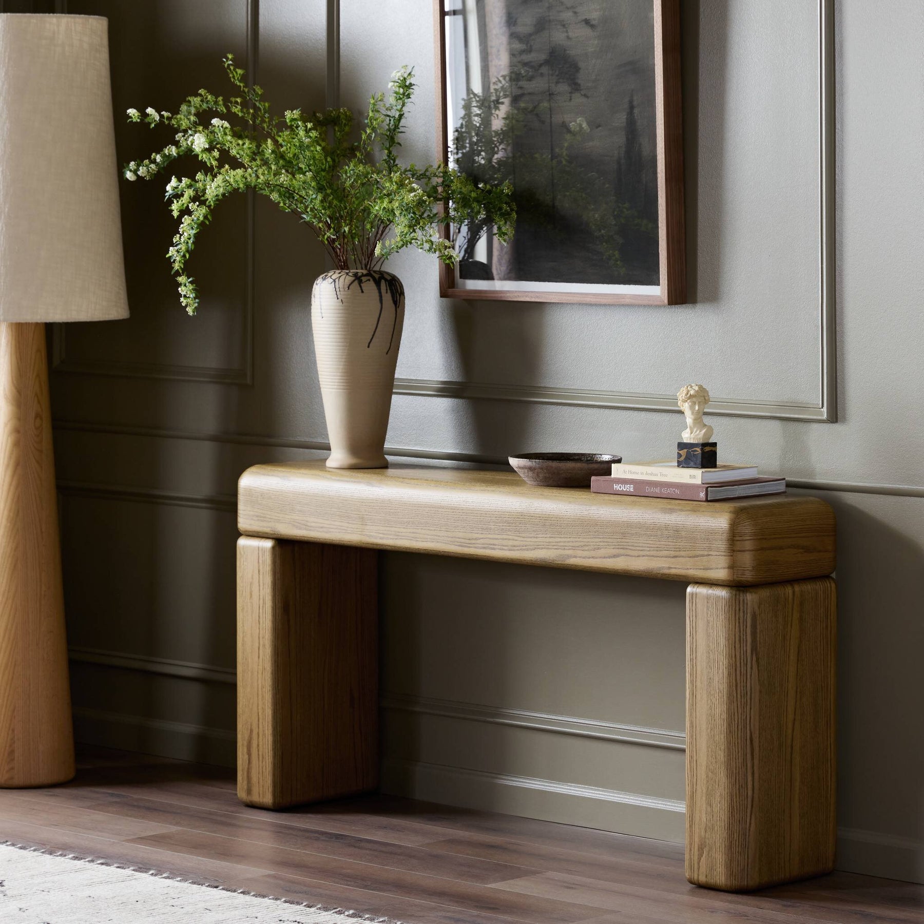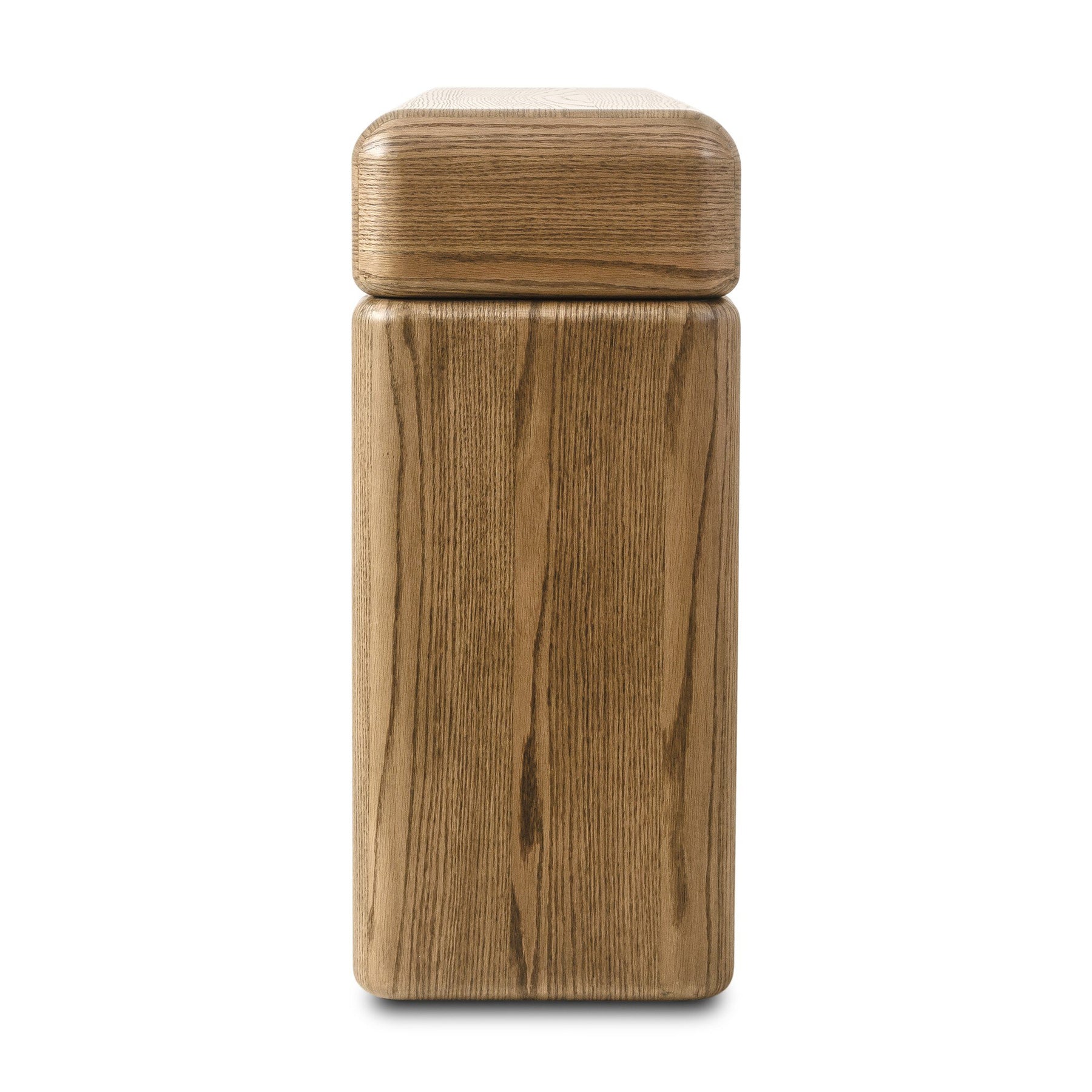 Crafted of warm oak veneer, dramatic proportions balance a streamlined waterfall shape in this contour-driven console. Exaggerated round corners soften the whole look.