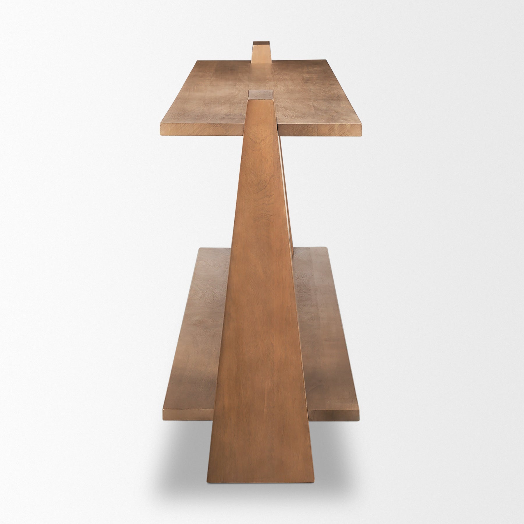 The Ella Console Table has a rectangular top and two solid angular legs, with a smooth, medium brown finish.