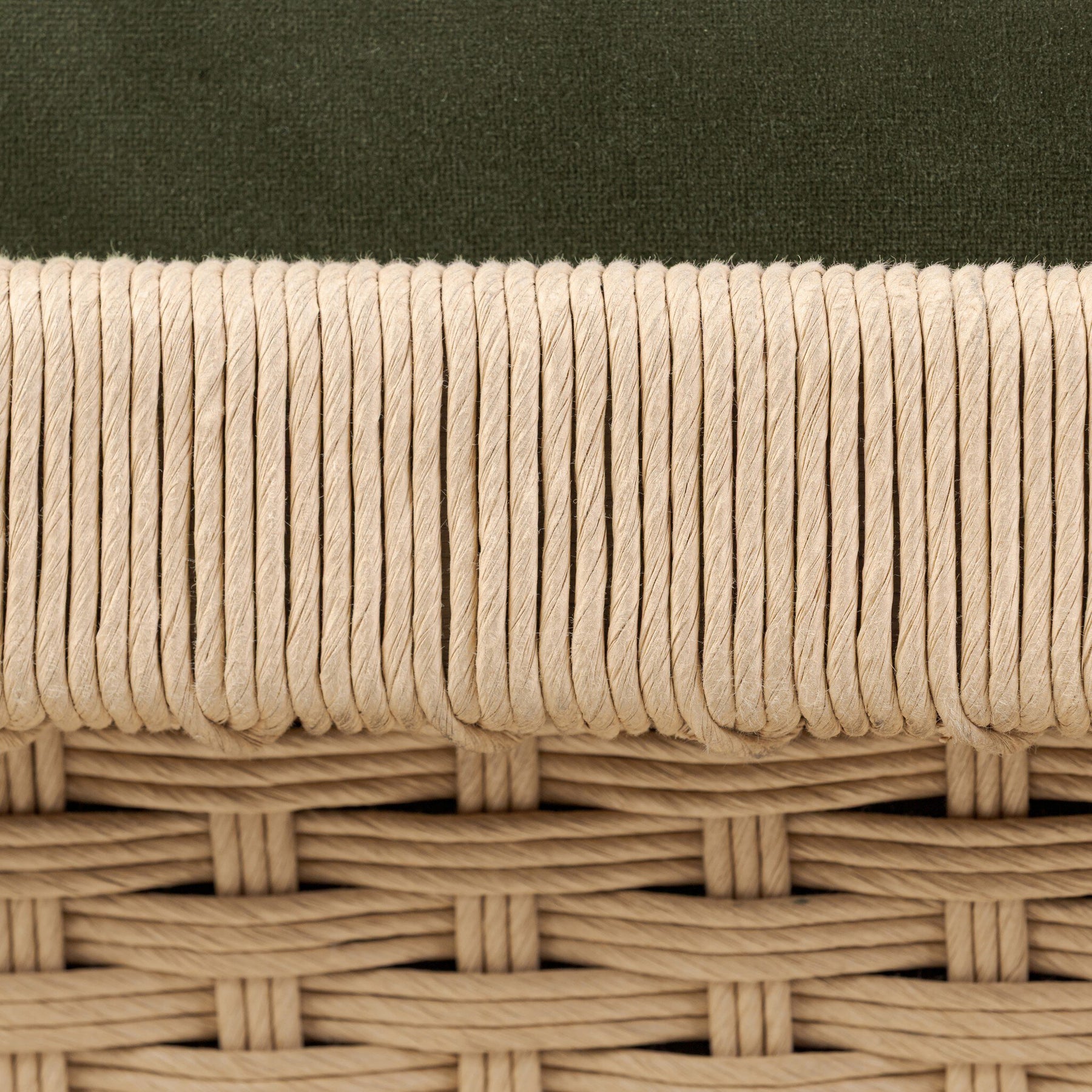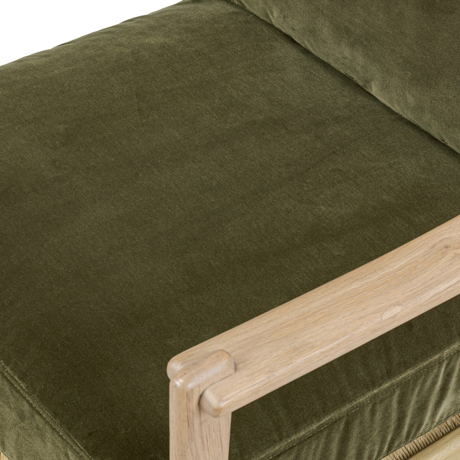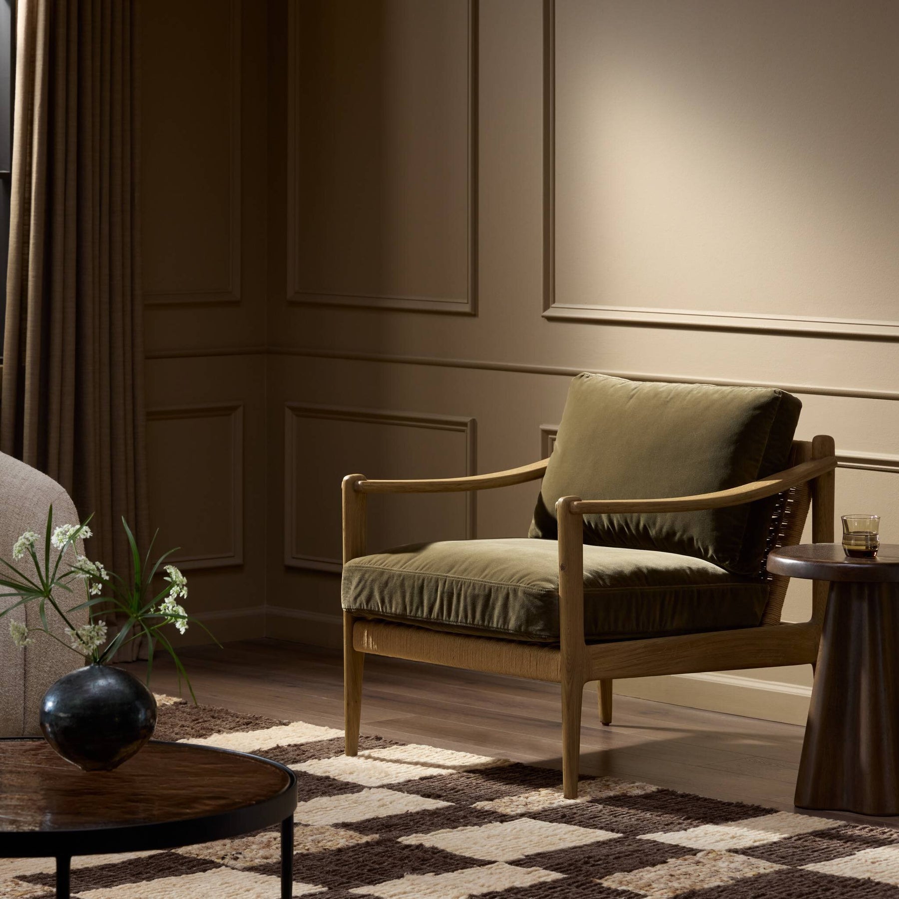Tapered legs and sloped paddle arms frame the visible joinery and handwoven rope details of this accent chair, for a monochromatic yet visually intriguing frame. Finished with loose, velvet-upholstered seat and back cushions in a rich olive hue — for a subtle color contrast that celebrates the natural beauty of each material.