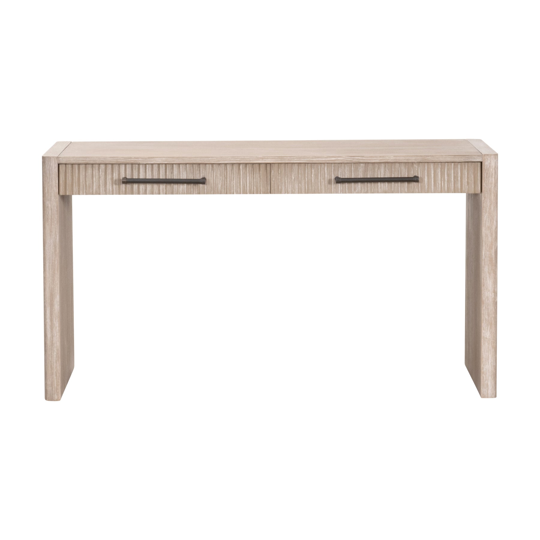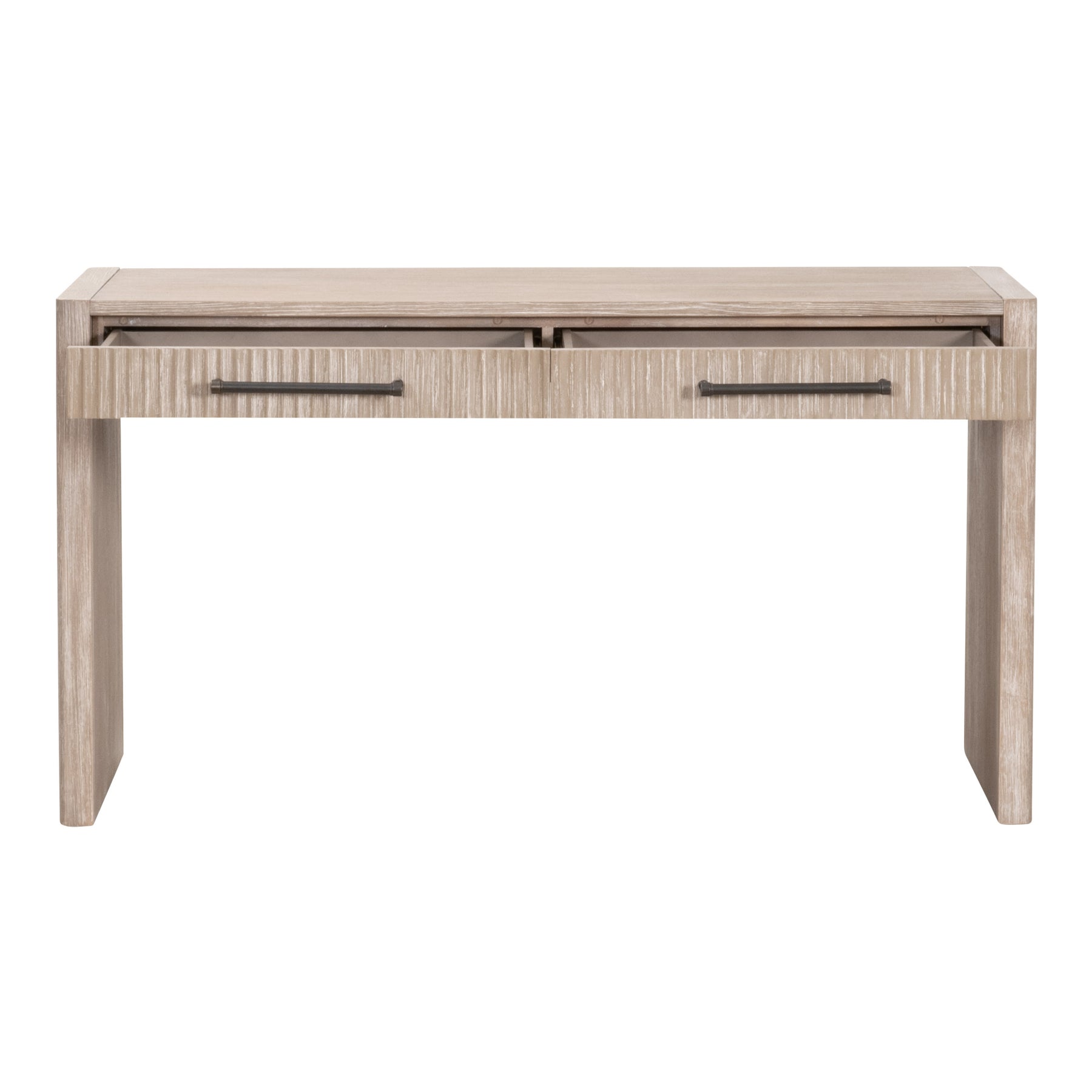 The Helena 2-Drawer Console Table combines clean design with a natural gray acacia wood finish. Its textured drawer fronts with antique bronze handles add subtle elegance. Offering two drawers for essential storage, it suits entryways, living rooms, or behind sofas as a refined and practical accent.