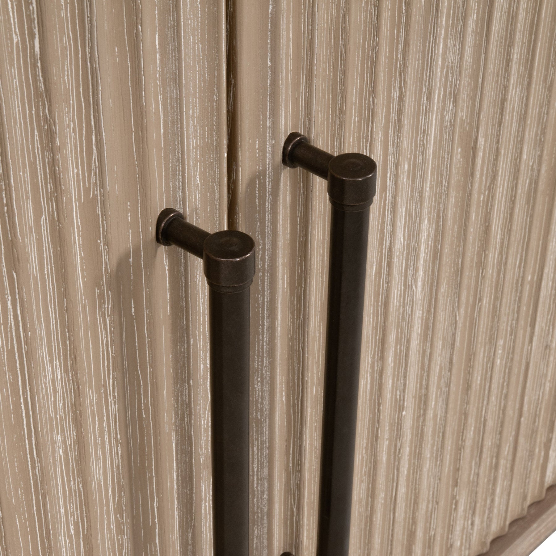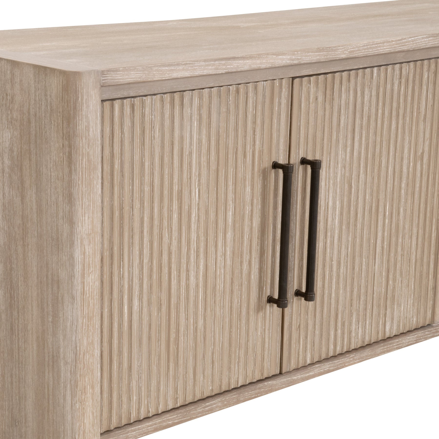 With its transitional design and natural gray finish, this Helena Media Sideboard  offers a stylish storage solution that blends seamlessly into both classic and modern interiors. Constructed from solid acacia wood with acacia veneer detailing, it features four reeded door panels that conceal two spacious storage cabinets. Inside, removable and adjustable shelves provide flexible organization for electronics, dishes, and other items you wish to neatly store away. Dual cord management holes keep cables tucked away, while a center support leg adds stability to the 74" wide, 18.5" deep, and 32" high frame, ensuring both form and function. Antique bronze handles finish the look with their timeless charm.