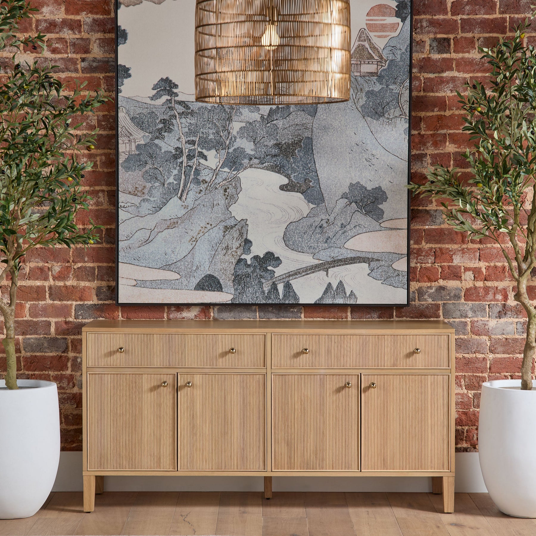 The Highland Media Sideboard blends timeless transitional design with functional storage solutions. It features a sturdy solid oak wood and oak veneer frame in a natural oak finish. The fluted wood drawer and cabinet fronts add dimension and texture for a unique design. Each drawer and door are equipped with solid polished brass iron knobs. The felt-lined drawers glide smoothly on soft-close metal tracks, while two spacious cabinets, each with adjustable shelves and cord management holes, provide versatile storage for media or other essentials. Dovetail joinery and KD leg construction ensure lasting durability and stability, making this sideboard both stylish and practical.