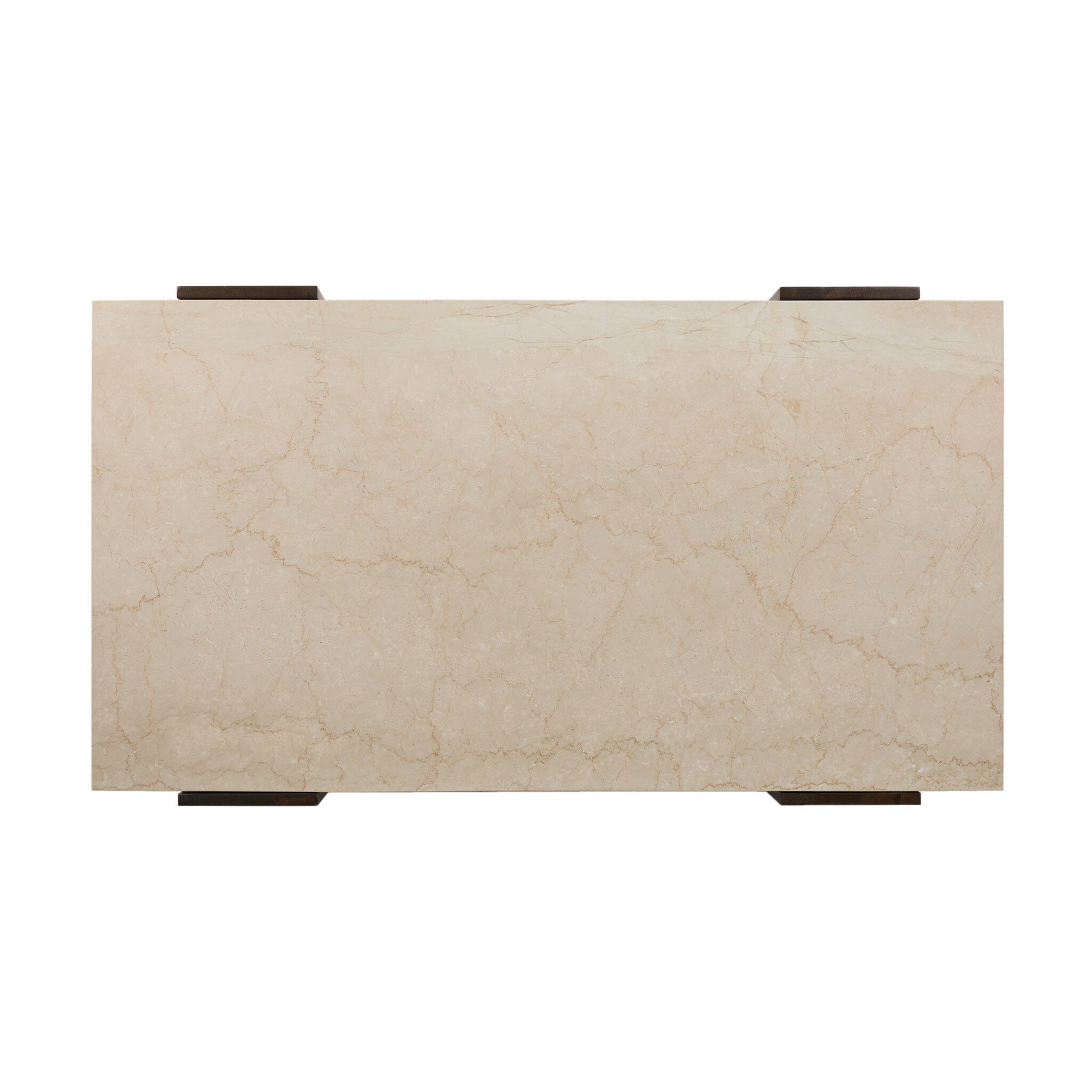 Clean lines and mixed materials pair up to craft an eye-catching coffee table. A wide cradle base of tobacco-finished oak supports a rectangular top of cream marble with beautiful natural veining.