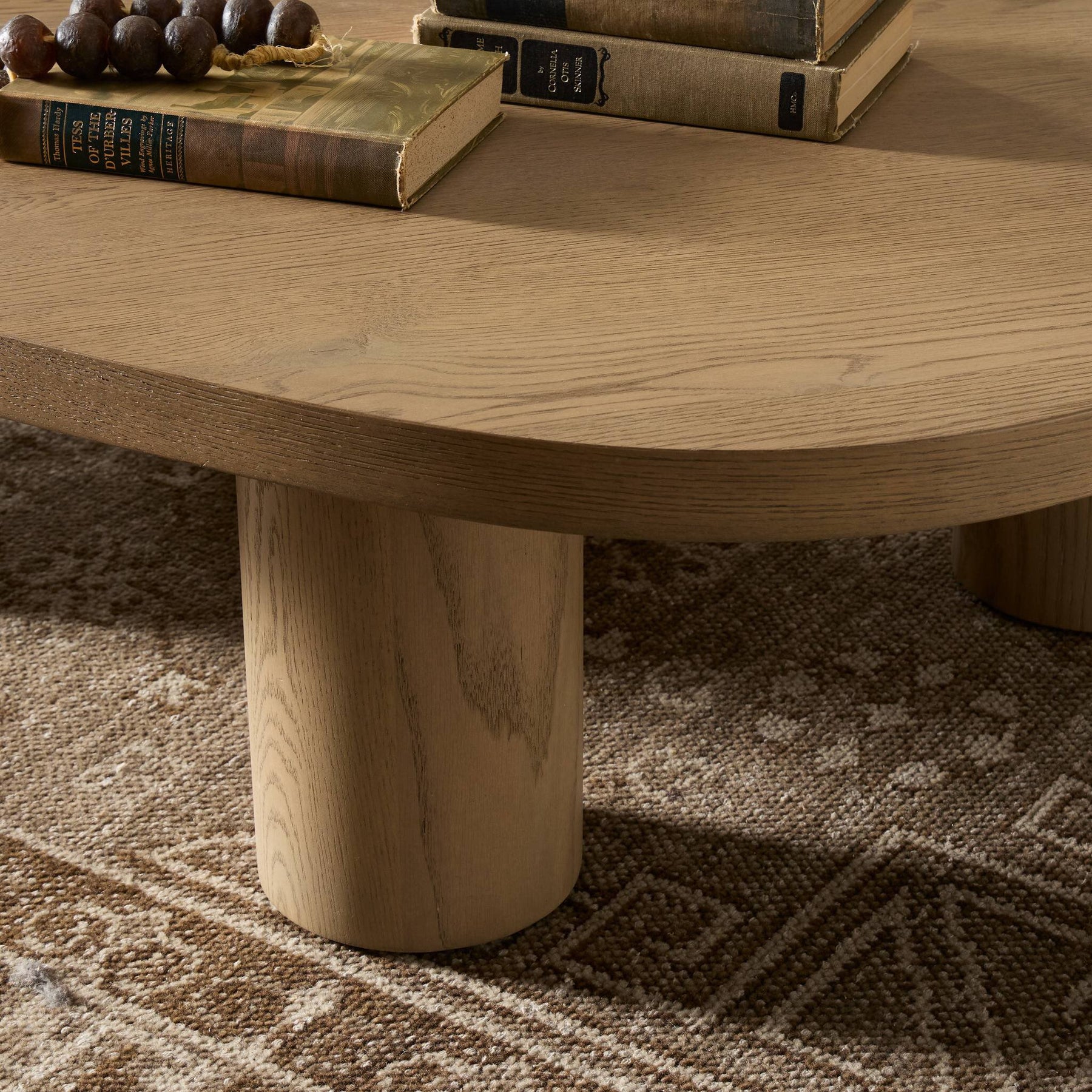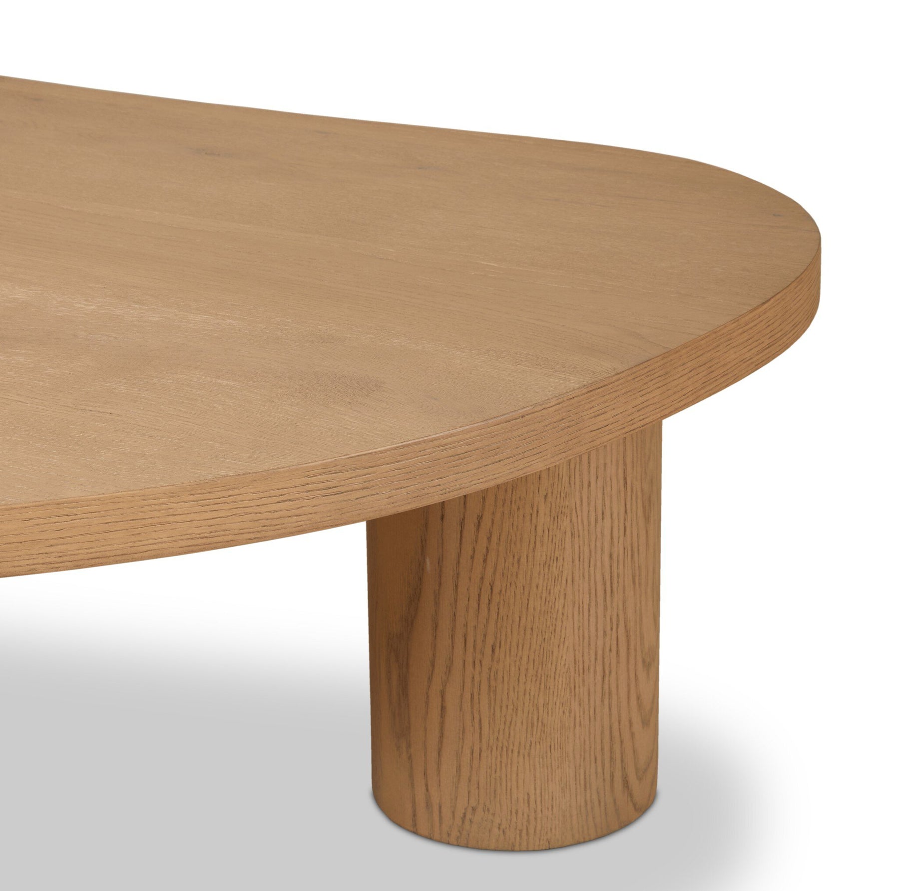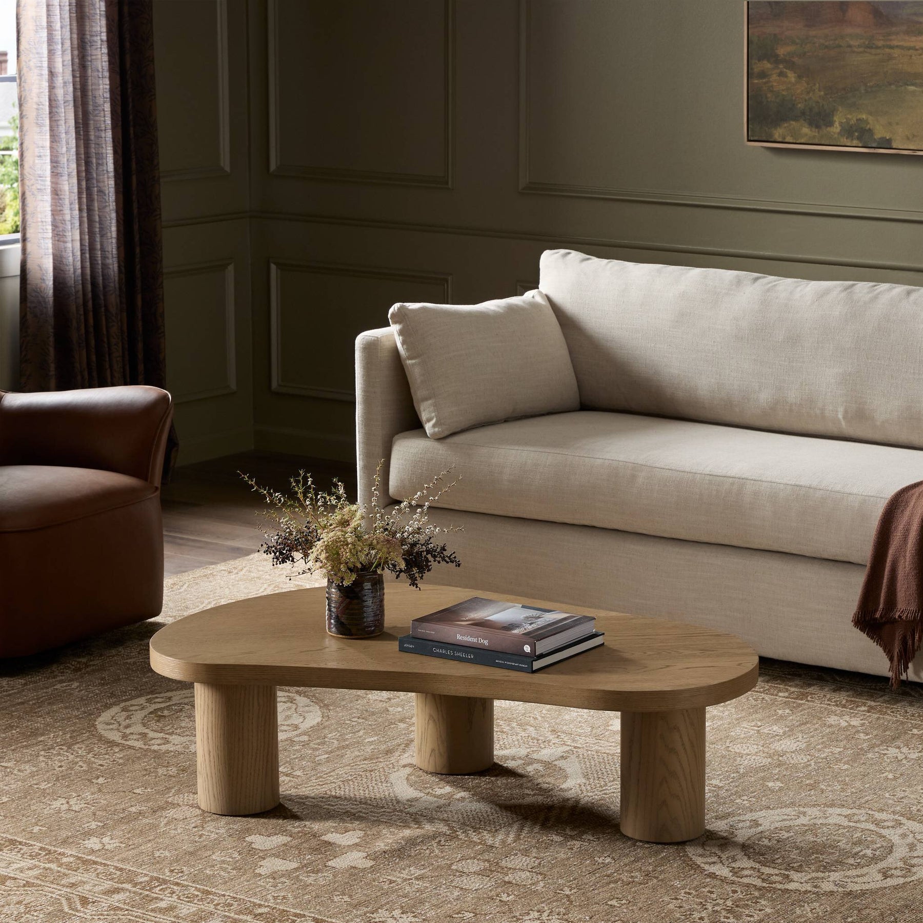 A beautifully contoured coffee table of light, natural oak features organic shaping for a fluid look. Style solo in smaller spaces or with matching larger table for a nested look.