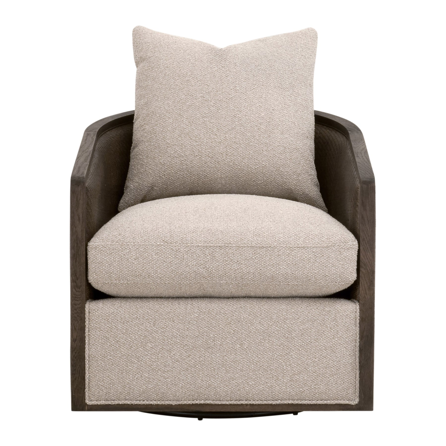 The Macie Swivel Club Chair blends matte brown cane and oak with jute upholstery for a refined look. Its stain-resistant fabric and durable construction ensure lasting style and easy care. The chair features a 360° swivel base, a reversible seat cushion, and a plush throw pillow filled with a polyester and down blend for comfort. Ideal for enhancing transitional spaces with effortless elegance.
