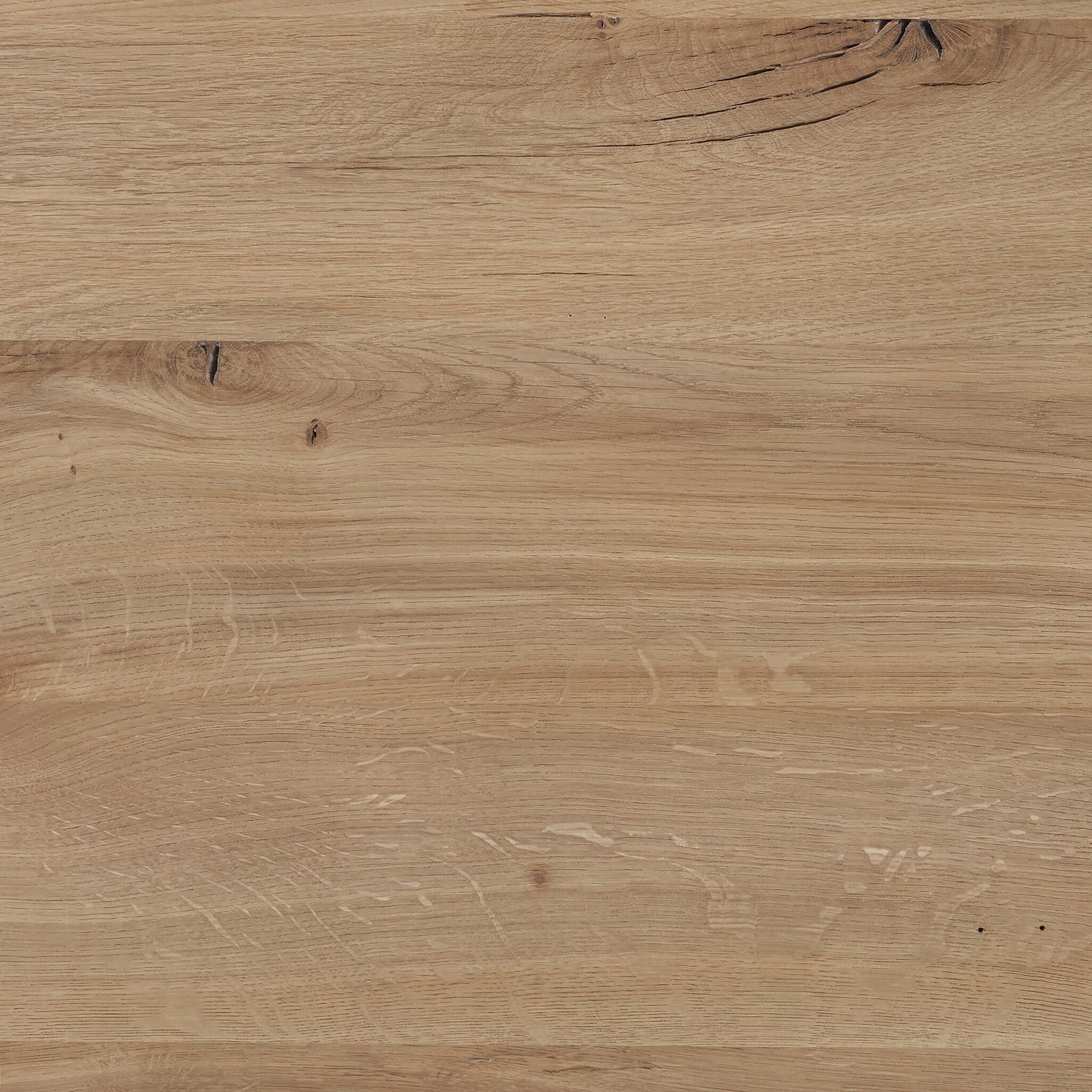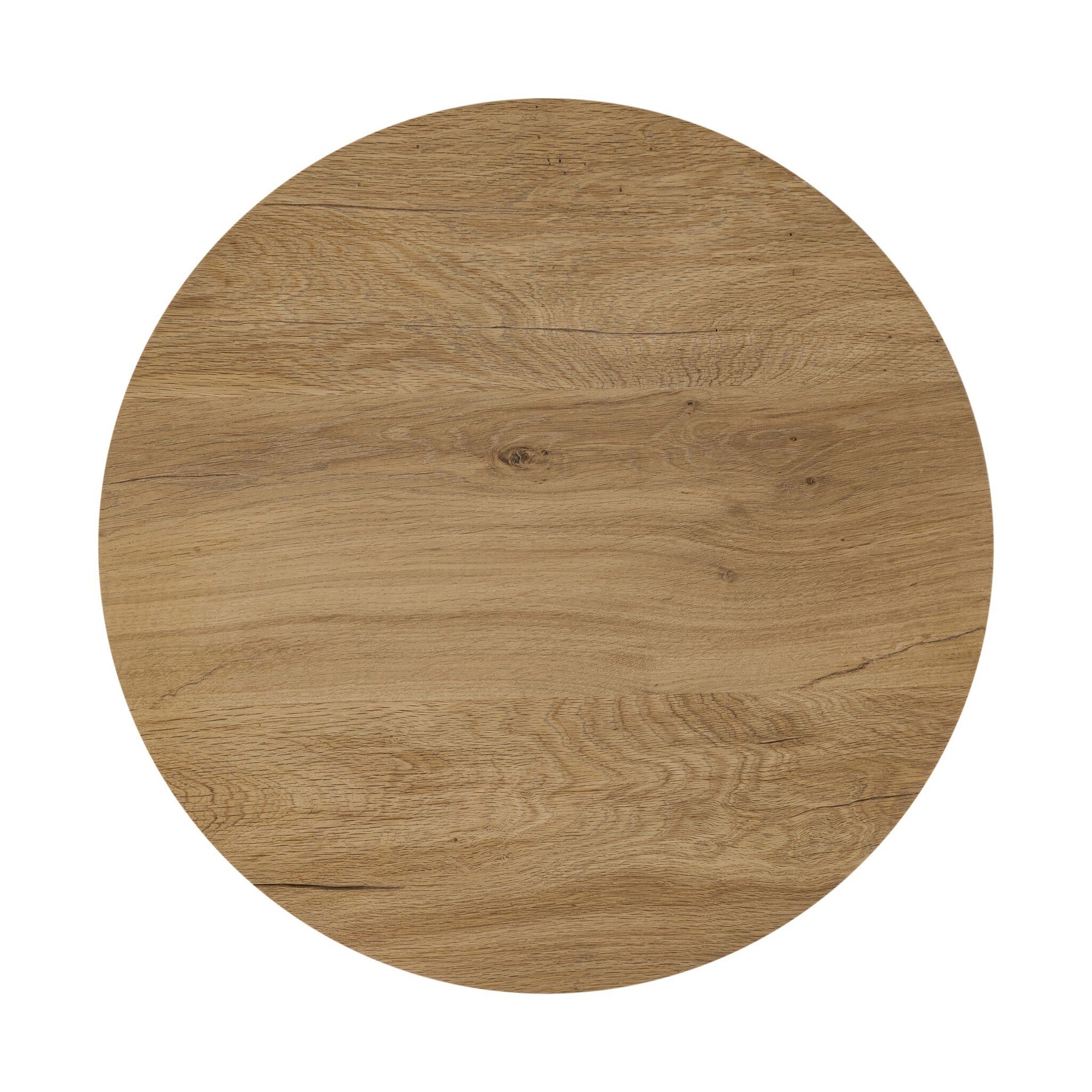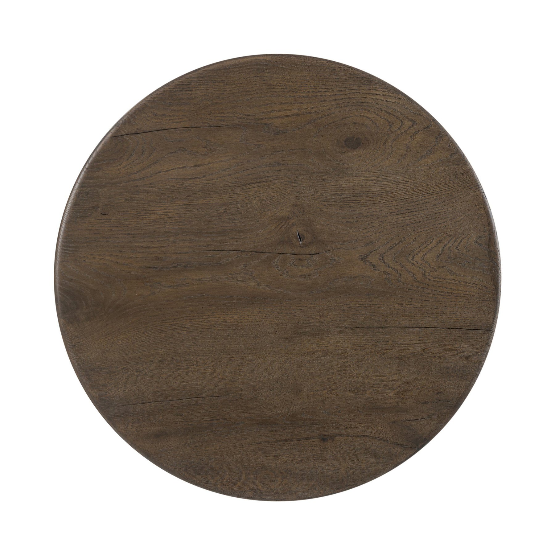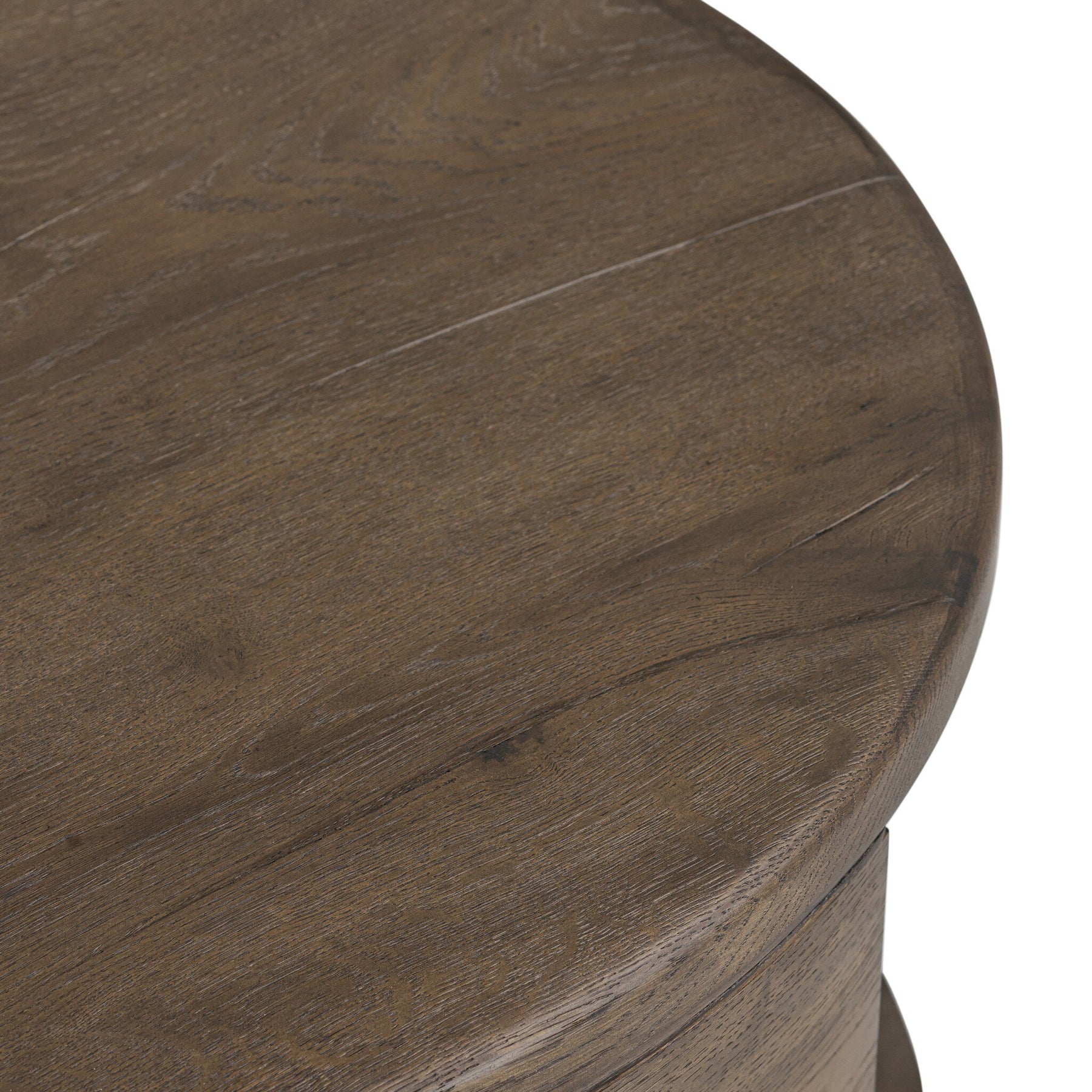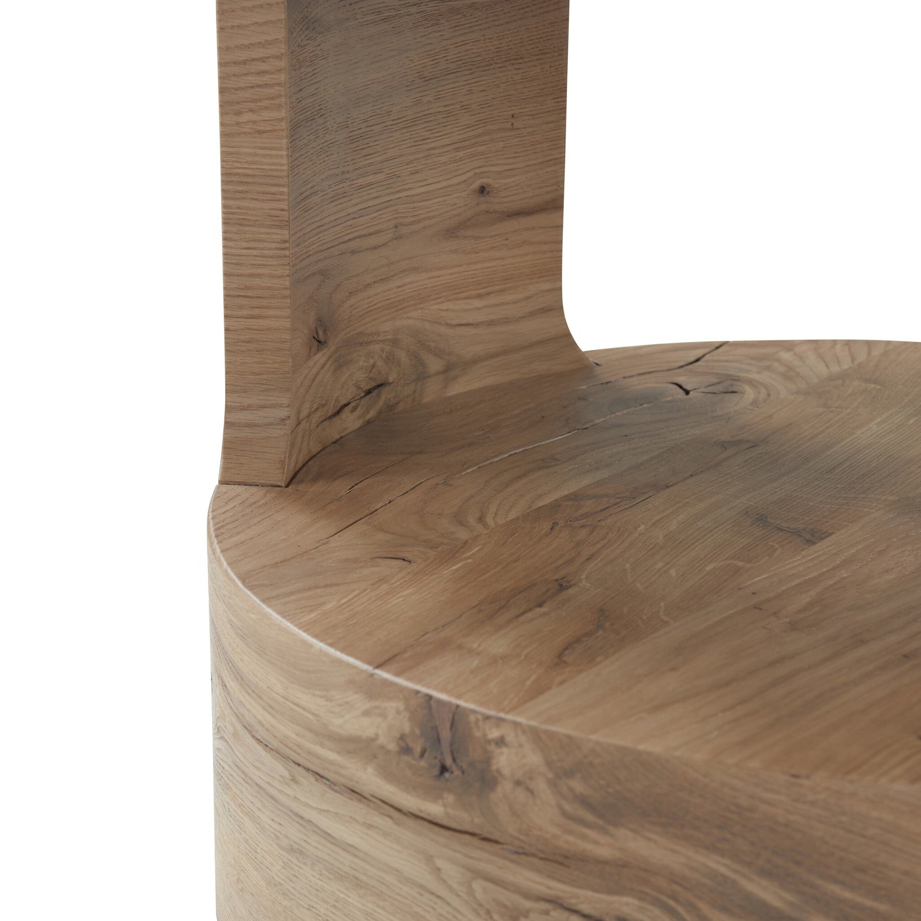 A rounded end table made from solid reclaimed oak features a cutout for lightness.