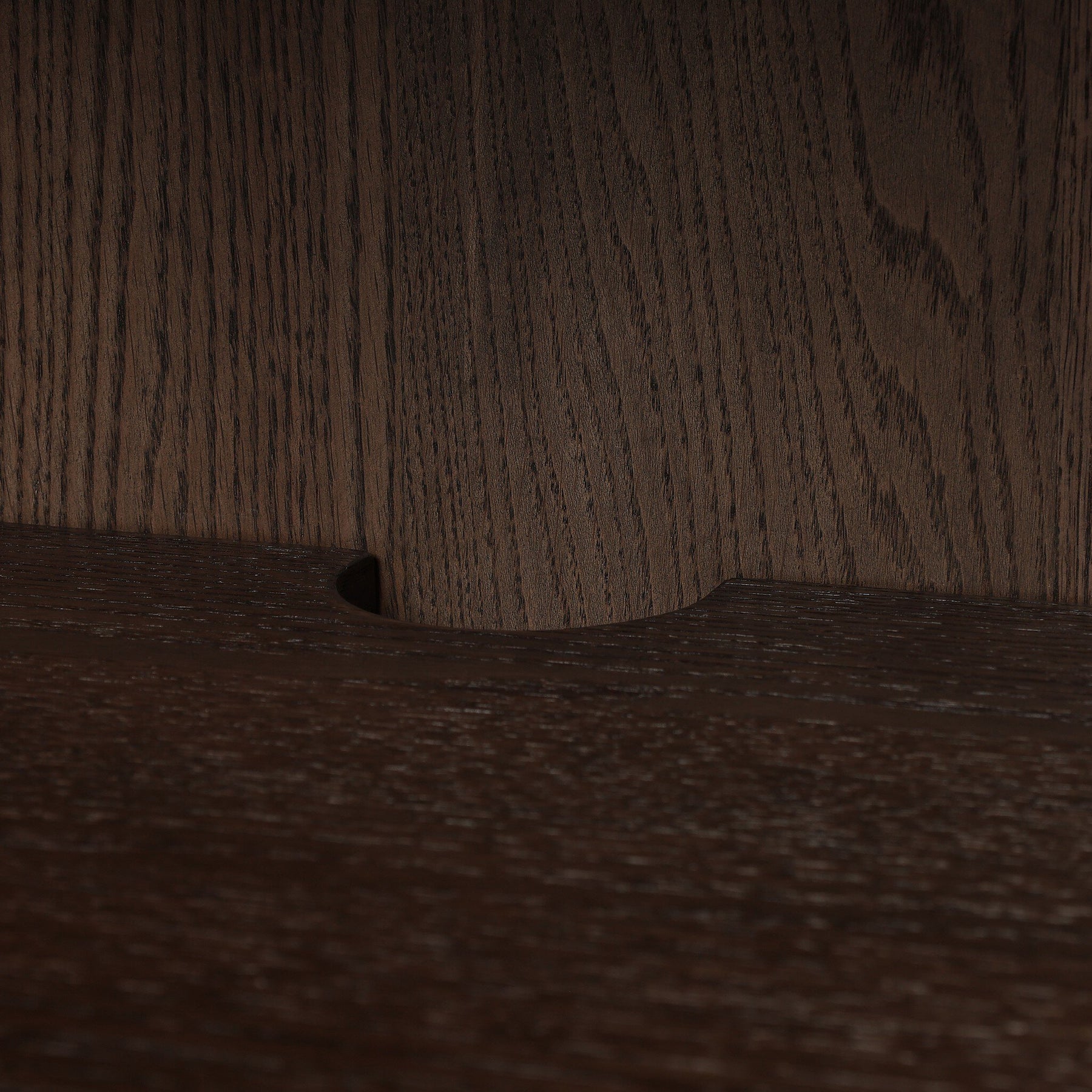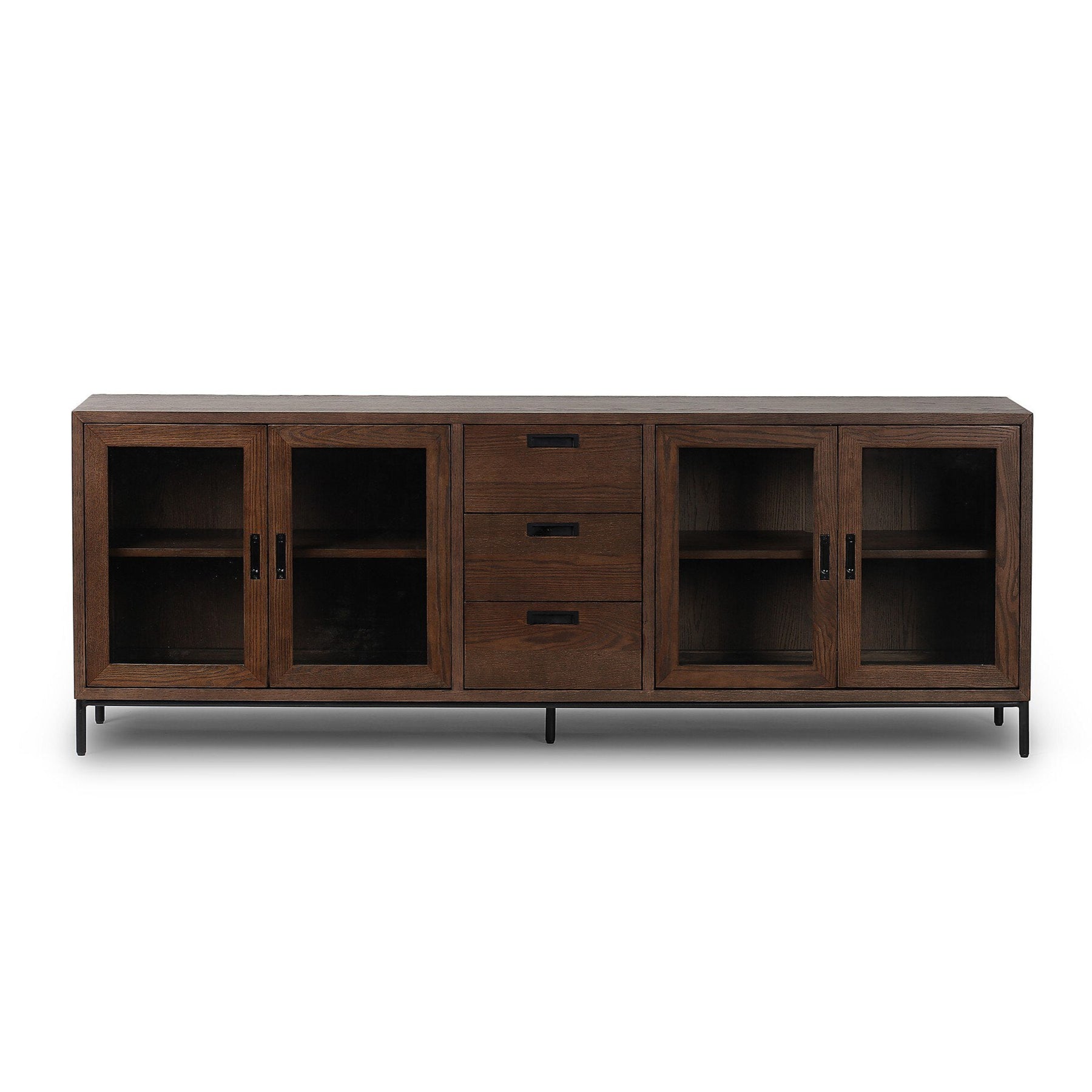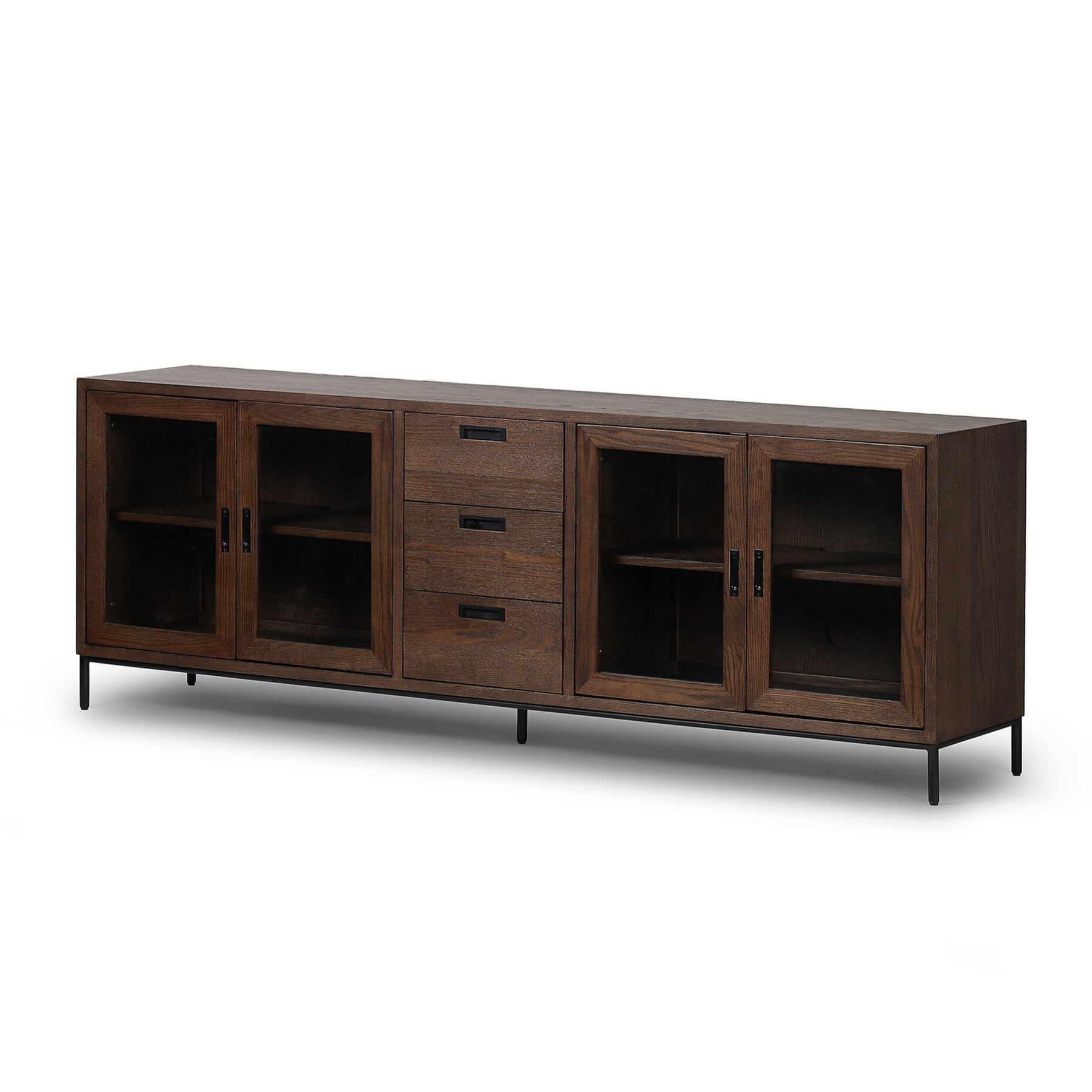 For a more traditional take on industrial design, an oak frame pairs with a metal base and simple hardware. Interior shelving and drawers bring generous storage space to the media room and beyond, while glass doors add lightness.