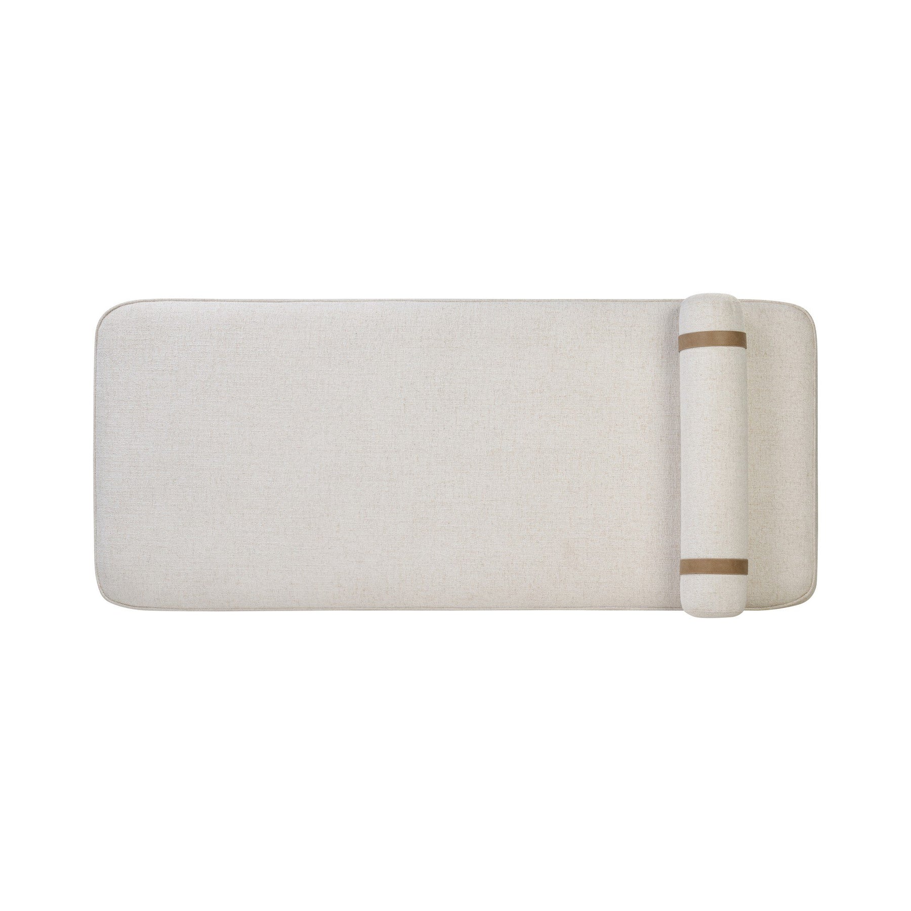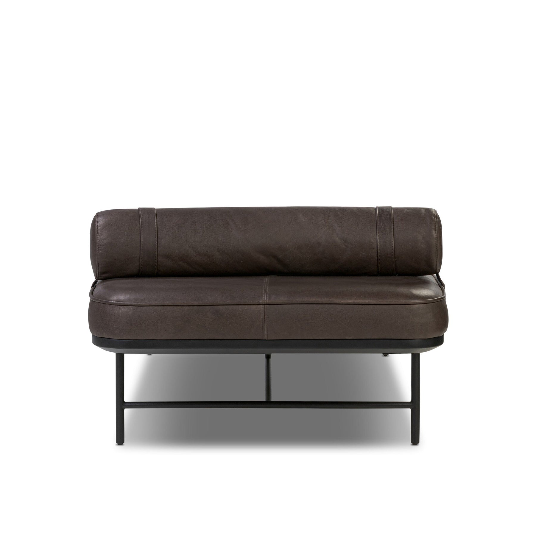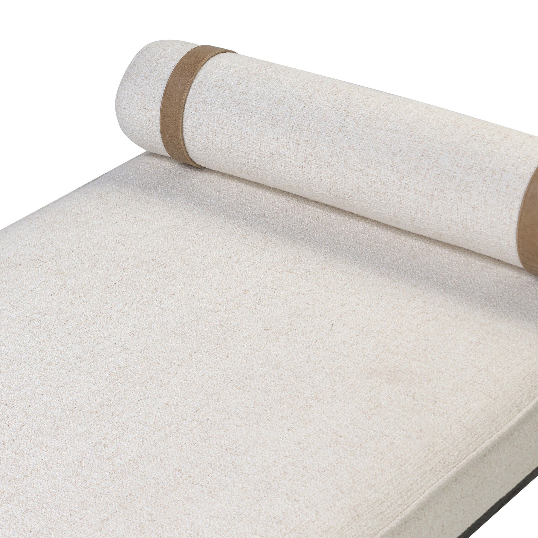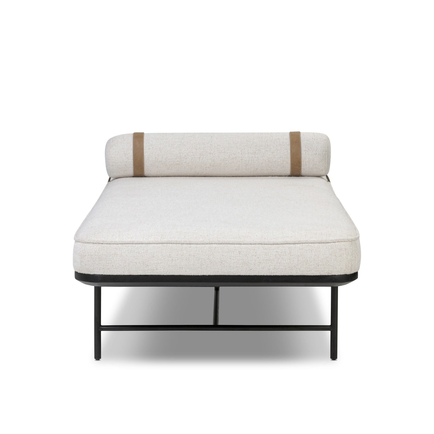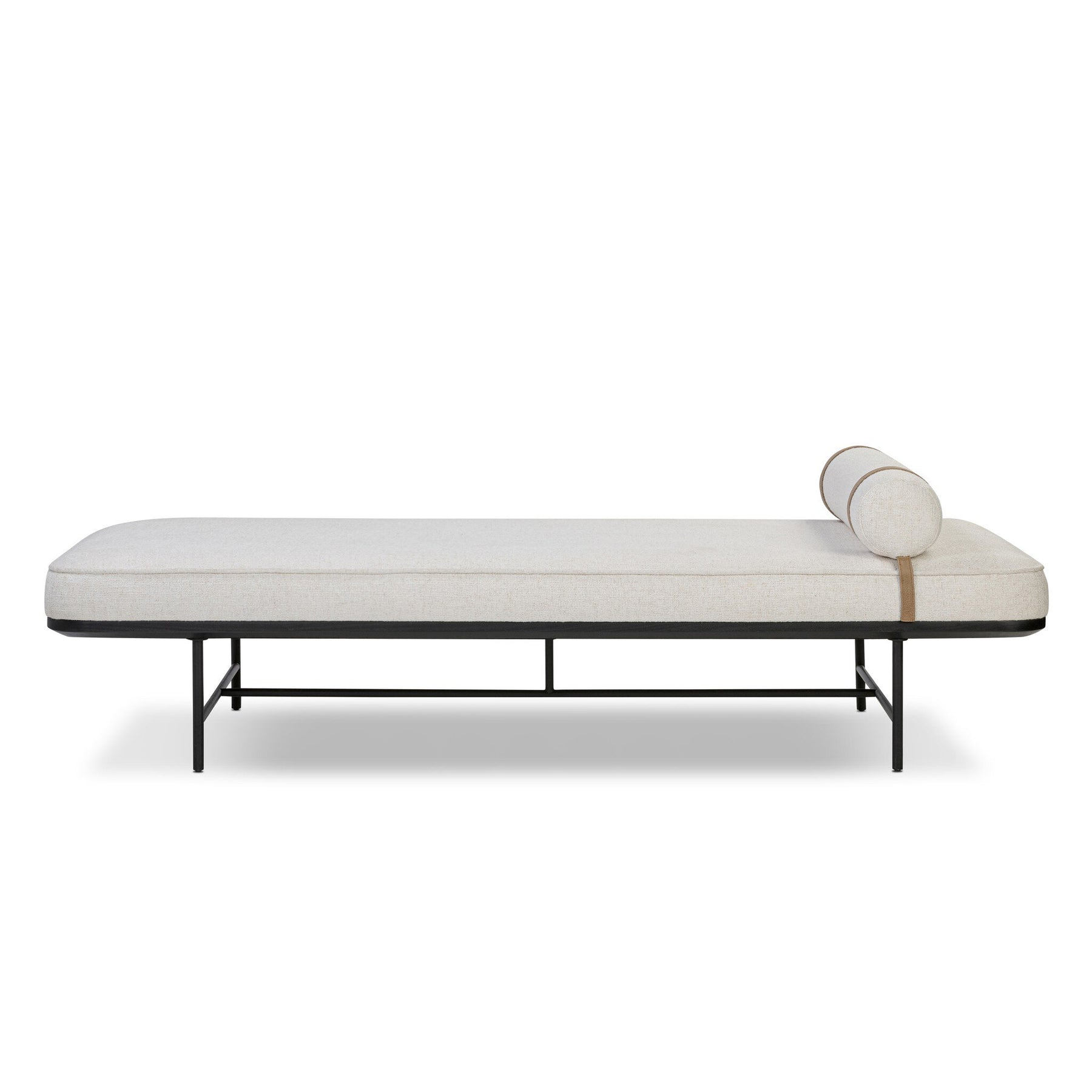 Elevate any room with this timeless chaise, featuring a bench seat, angled apron, and a strap-secured bolster headrest for both comfort and style. Upholstered in your choice of top-grain leather, velvety cotton blend, or neutral performance fabric, it offers versatile elegance for any space. Slim steel legs complete the look with a light, airy feel.