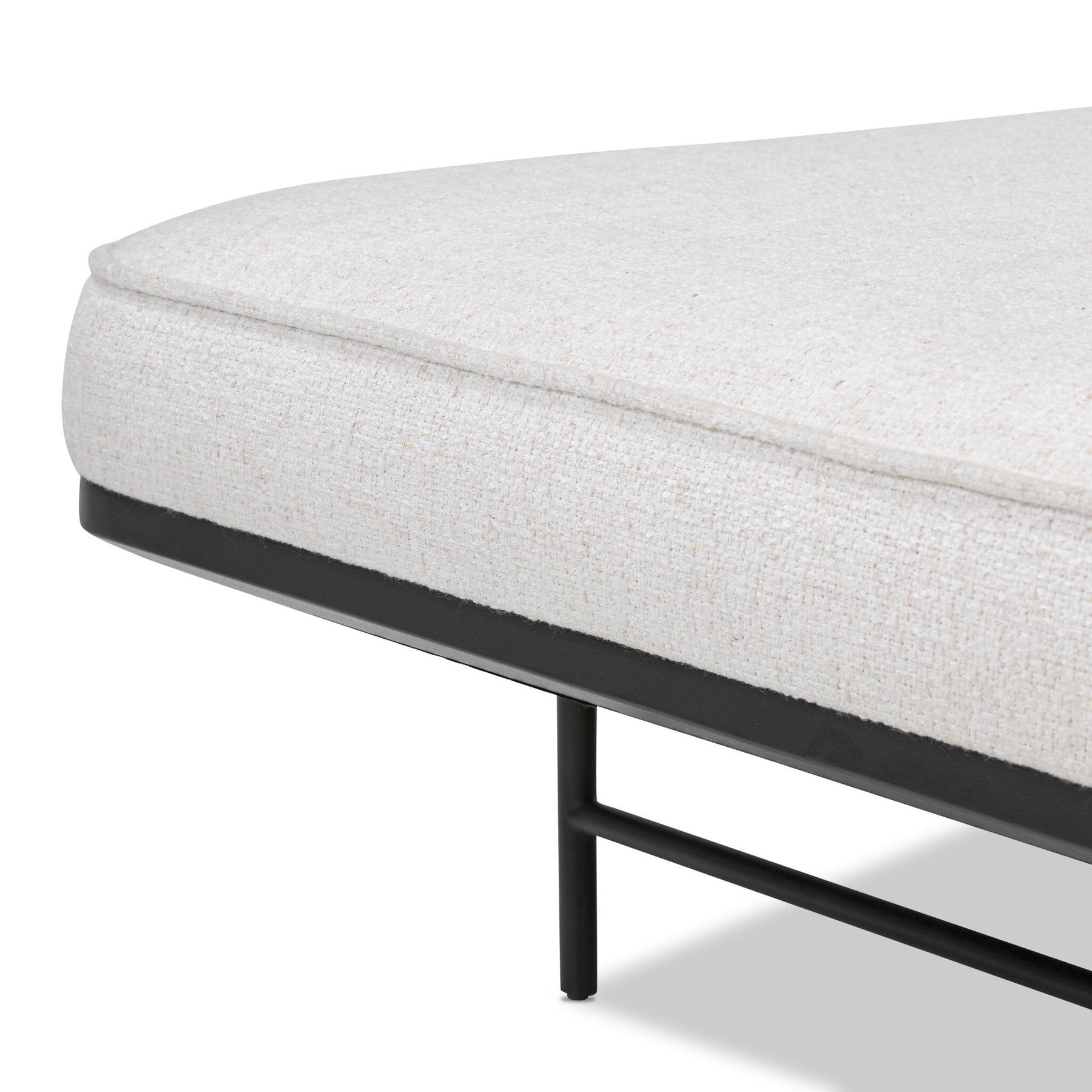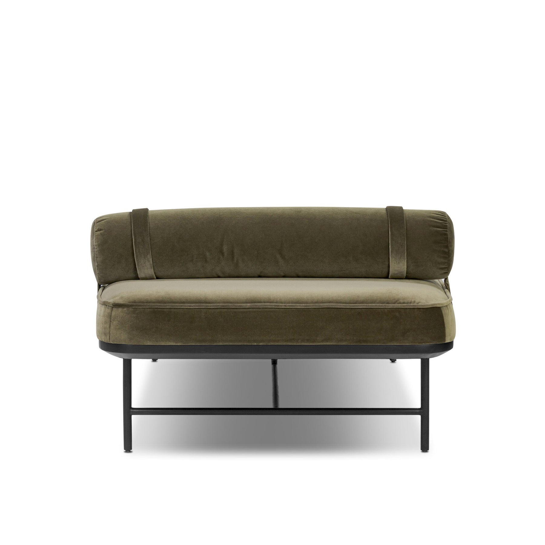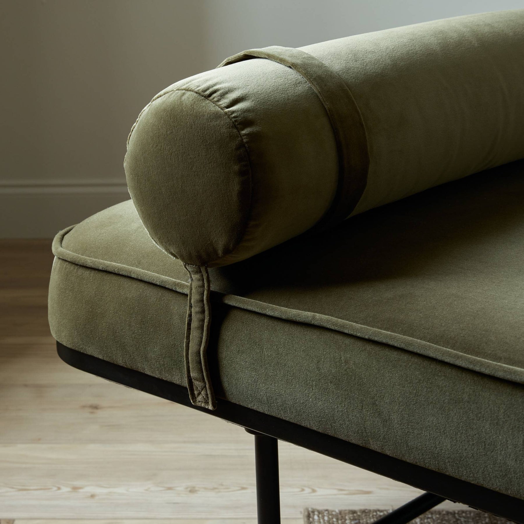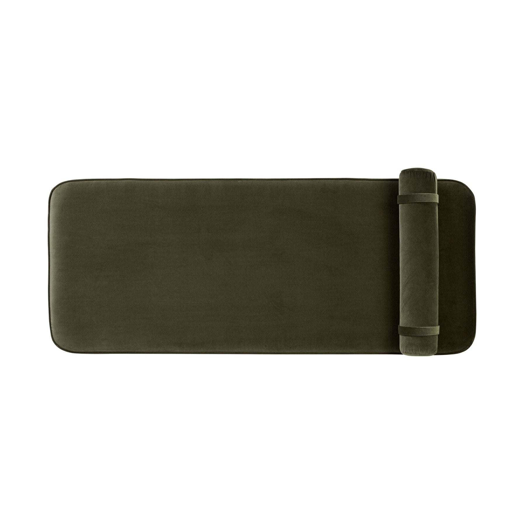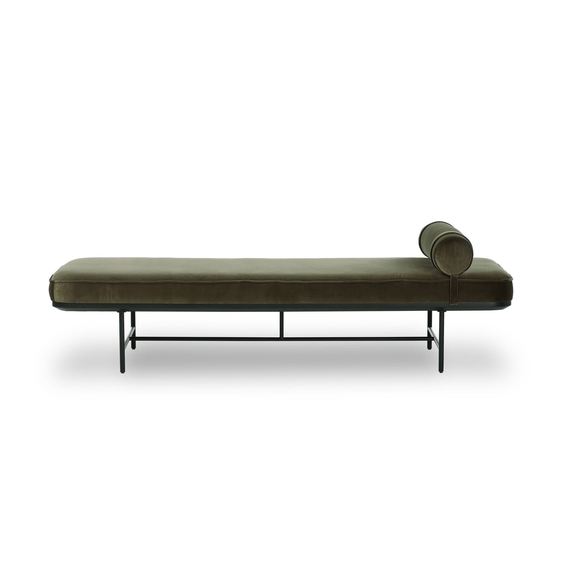 Elevate any room with this timeless chaise, featuring a bench seat, angled apron, and a strap-secured bolster headrest for both comfort and style. Upholstered in your choice of top-grain leather, velvety cotton blend, or neutral performance fabric, it offers versatile elegance for any space. Slim steel legs complete the look with a light, airy feel.