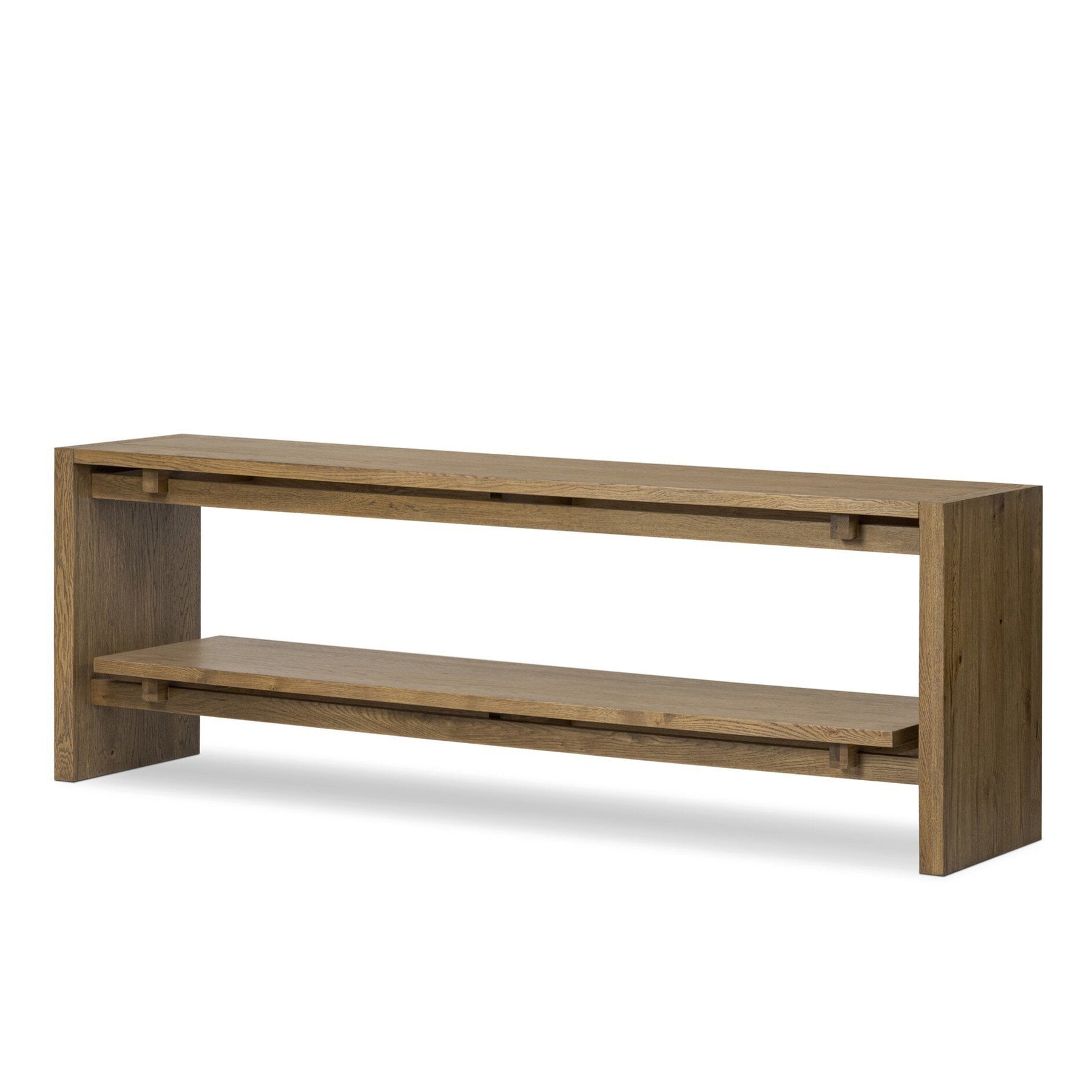 A truly versatile design made from rustic amber oak, wide tiers of float-style shelves bring storage and display to any room. Layered cross supports add an architectural touch.