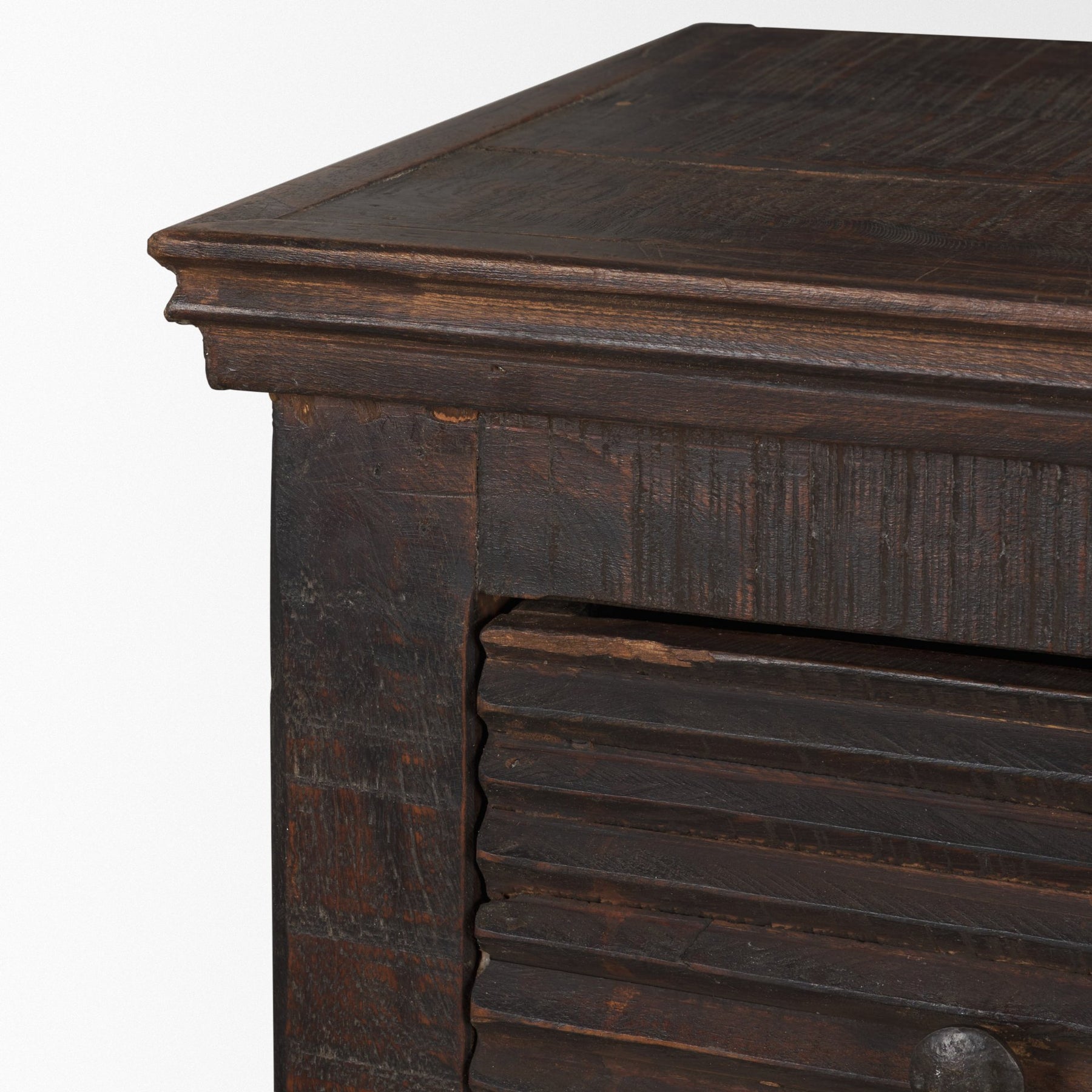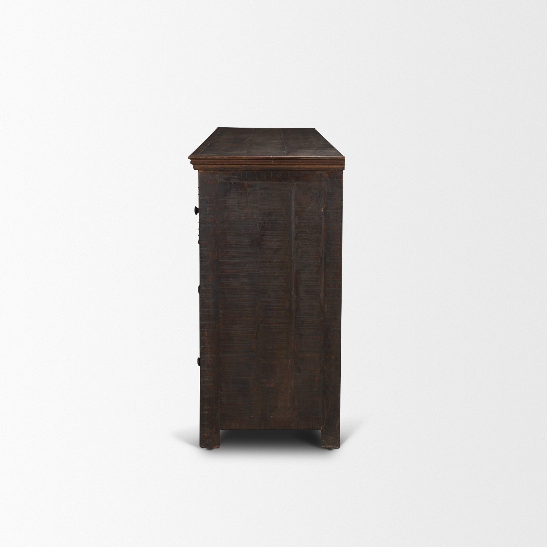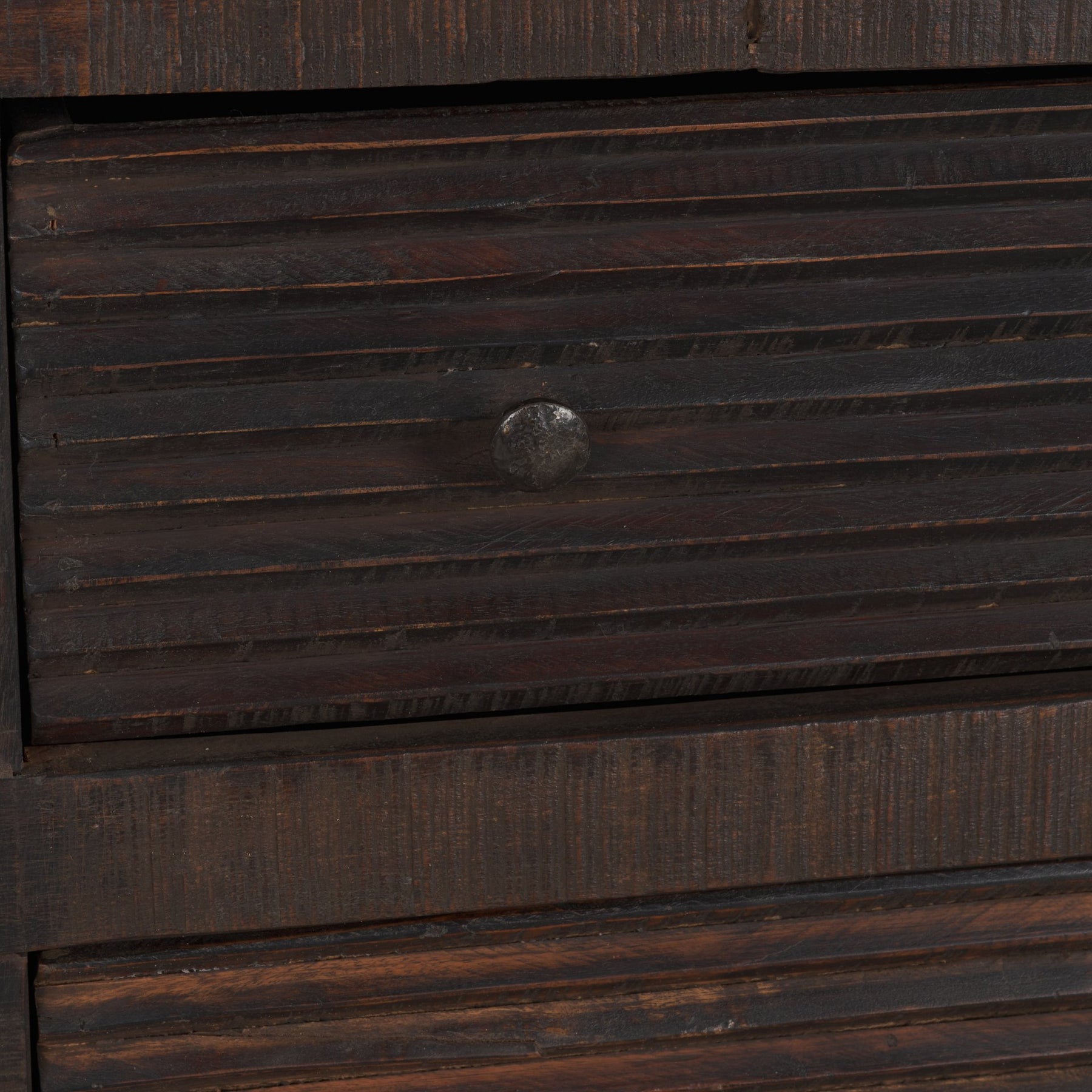 The Rita 6-drawer cabinet is crafted entirely from reclaimed wood in a mid-dark brown finish with red undertones, highlighting its natural imperfections and rich character. Sharp-ridge carved fronts and rustic iron knobs bring added texture and a timeworn, handcrafted appeal.