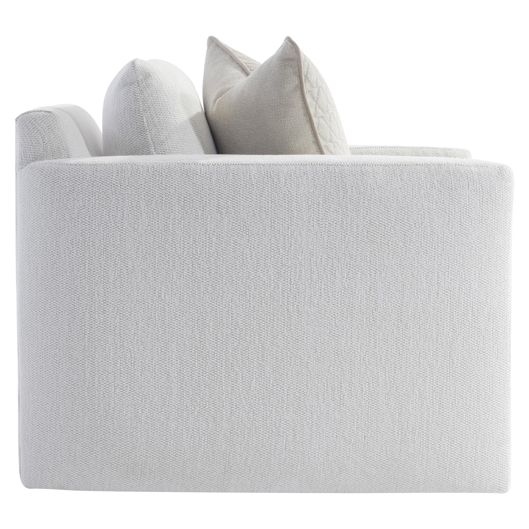 The Ronin swivel chair showcases modern comfort in a pared-down style. Lightly padded and angled arm panels act as a stylish connector to the back and arms. A deep cushion, knife-edge back pillow and curated throw pillow offer a relaxing seat, while a smooth swivel base gives a 360-degree turn.