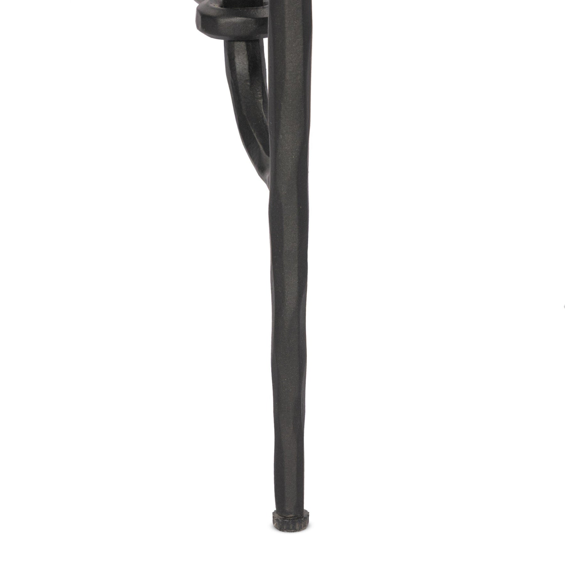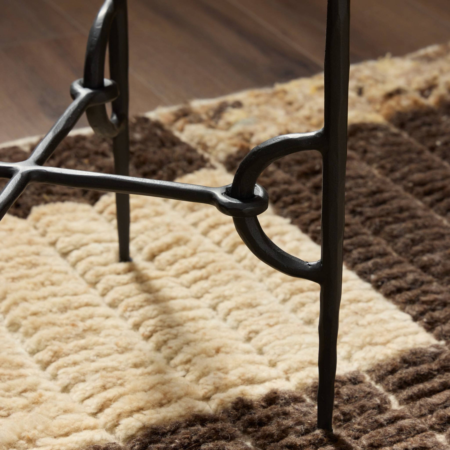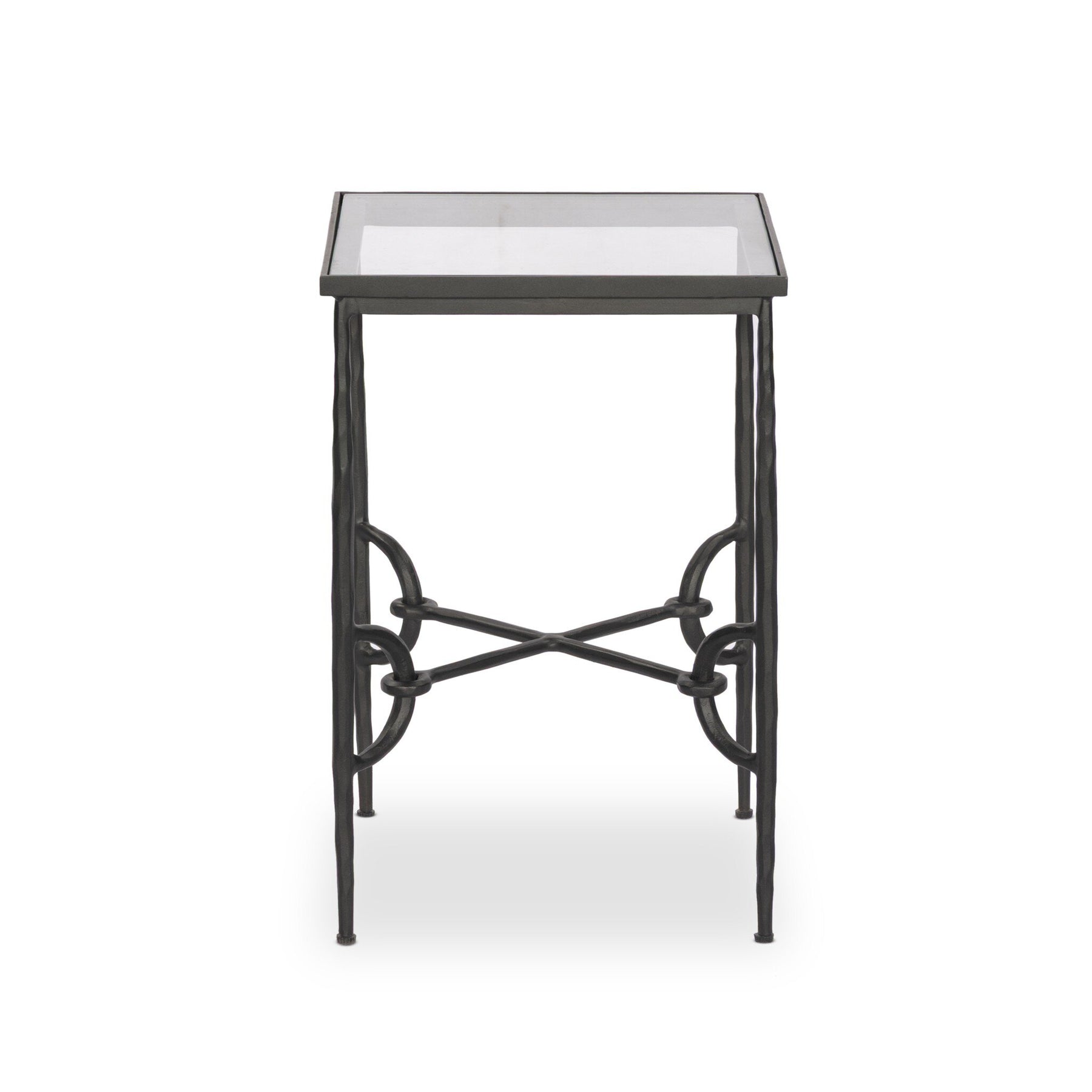 A slim, spare frame of hammered gunmetal pairs with tempered glass, for a clean and timeless end table look. Stretchers attach to metal loops for an elevated design detail.