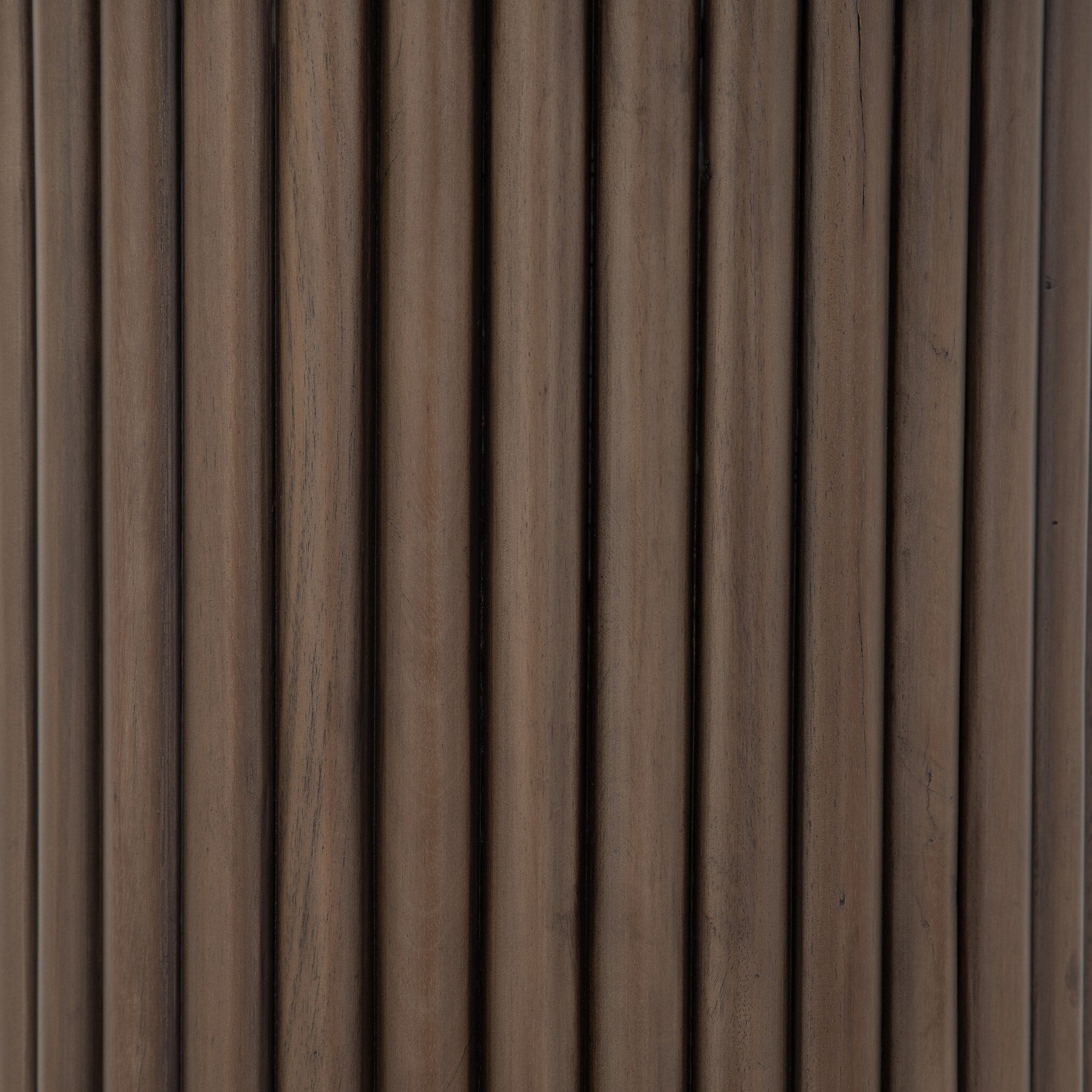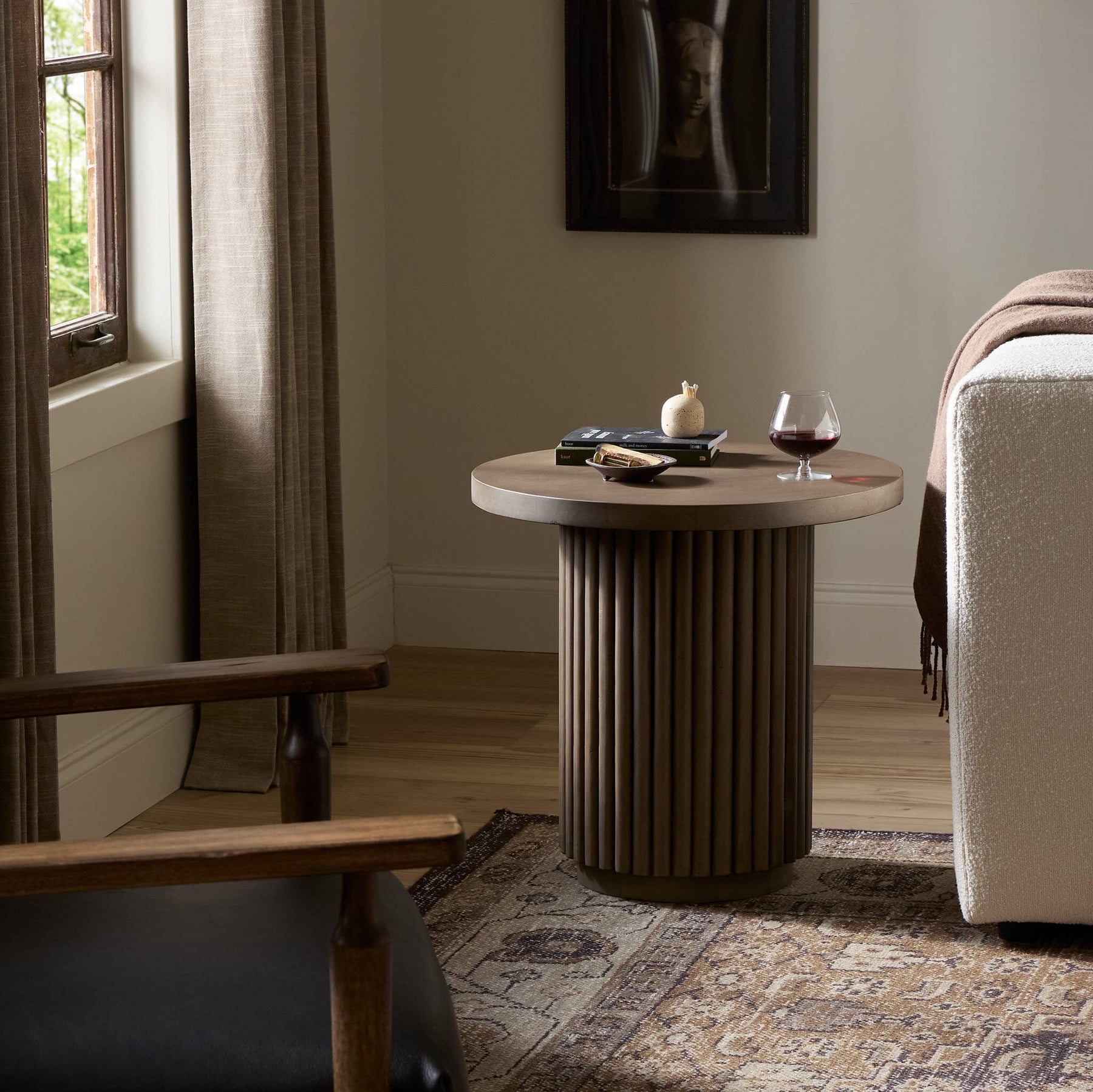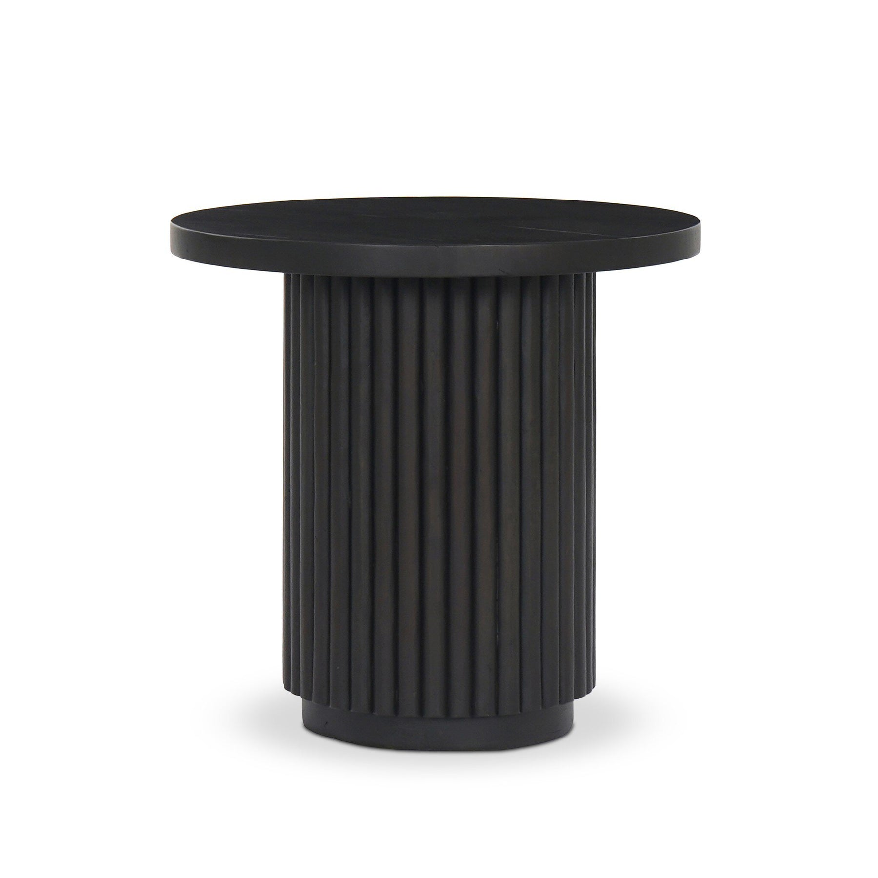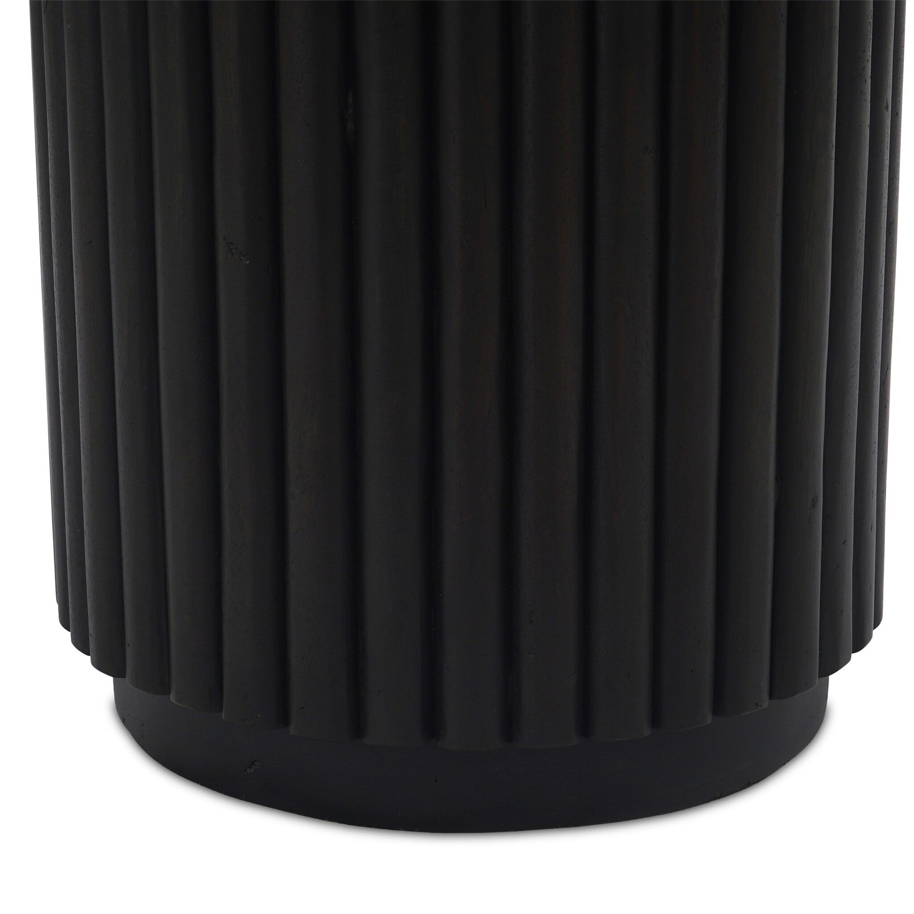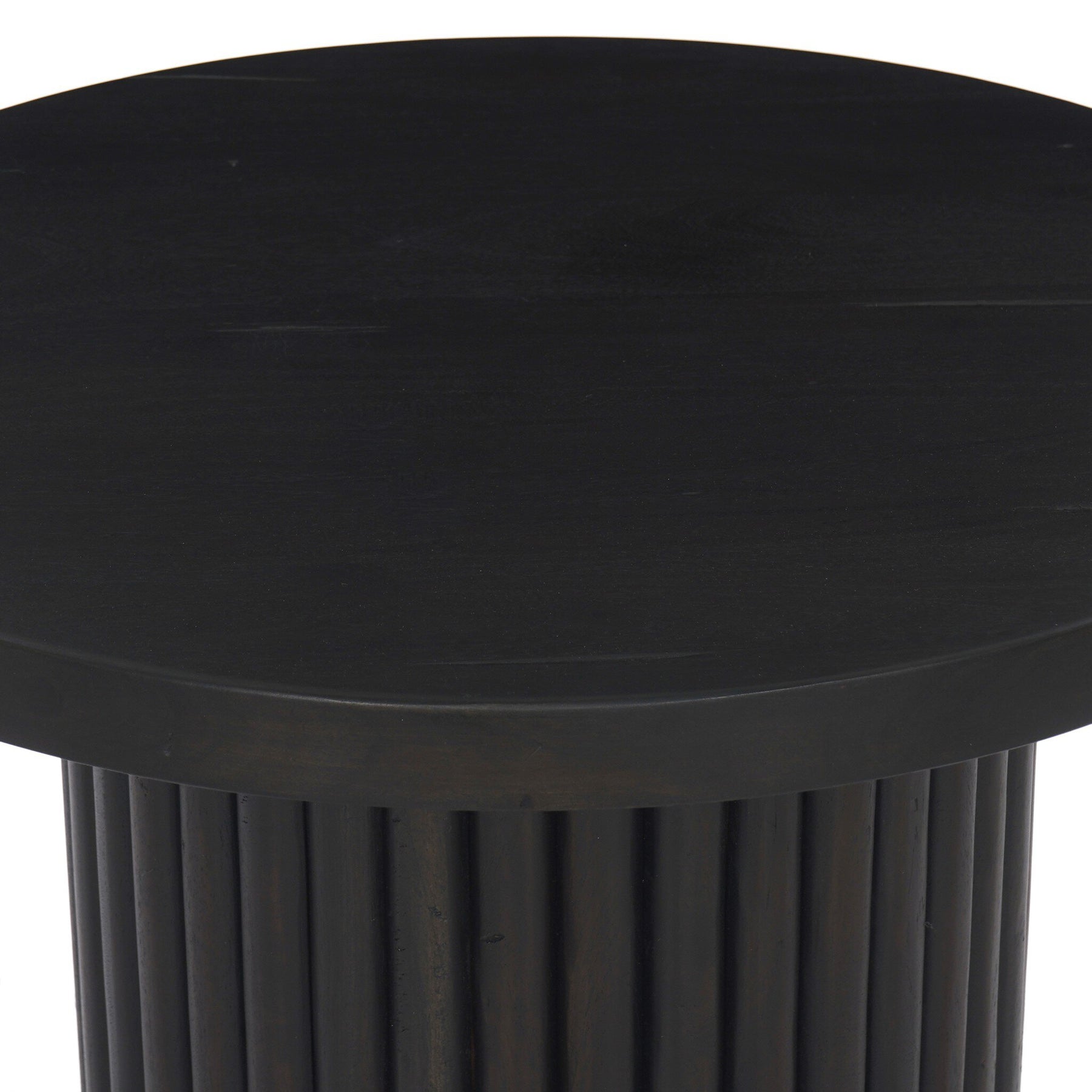 Inspired by décor in the majestic palaces of Jaipur, a conversation-starting end table is made from mixed reclaimed woods, with a rounded top and base with vertical reeding.