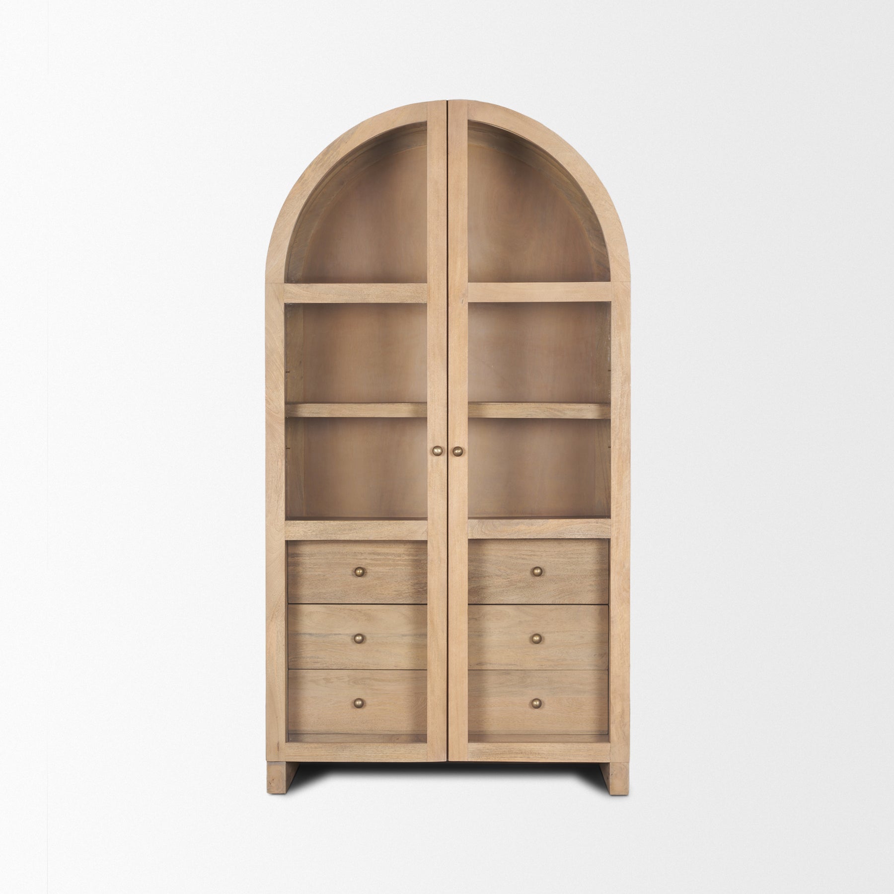 Serena is a premium curio cabinet constructed from solid light brown mango wood and adorned with handmade, solid brass knobs. Featuring two removable, and adjustable, shelves with three spacious drawers, it offers customizable storage for your cherished belongings. Serena's soothing neutral hues, sandblasted textured finish, and elegant arched design make it a sophisticated addition to any space.