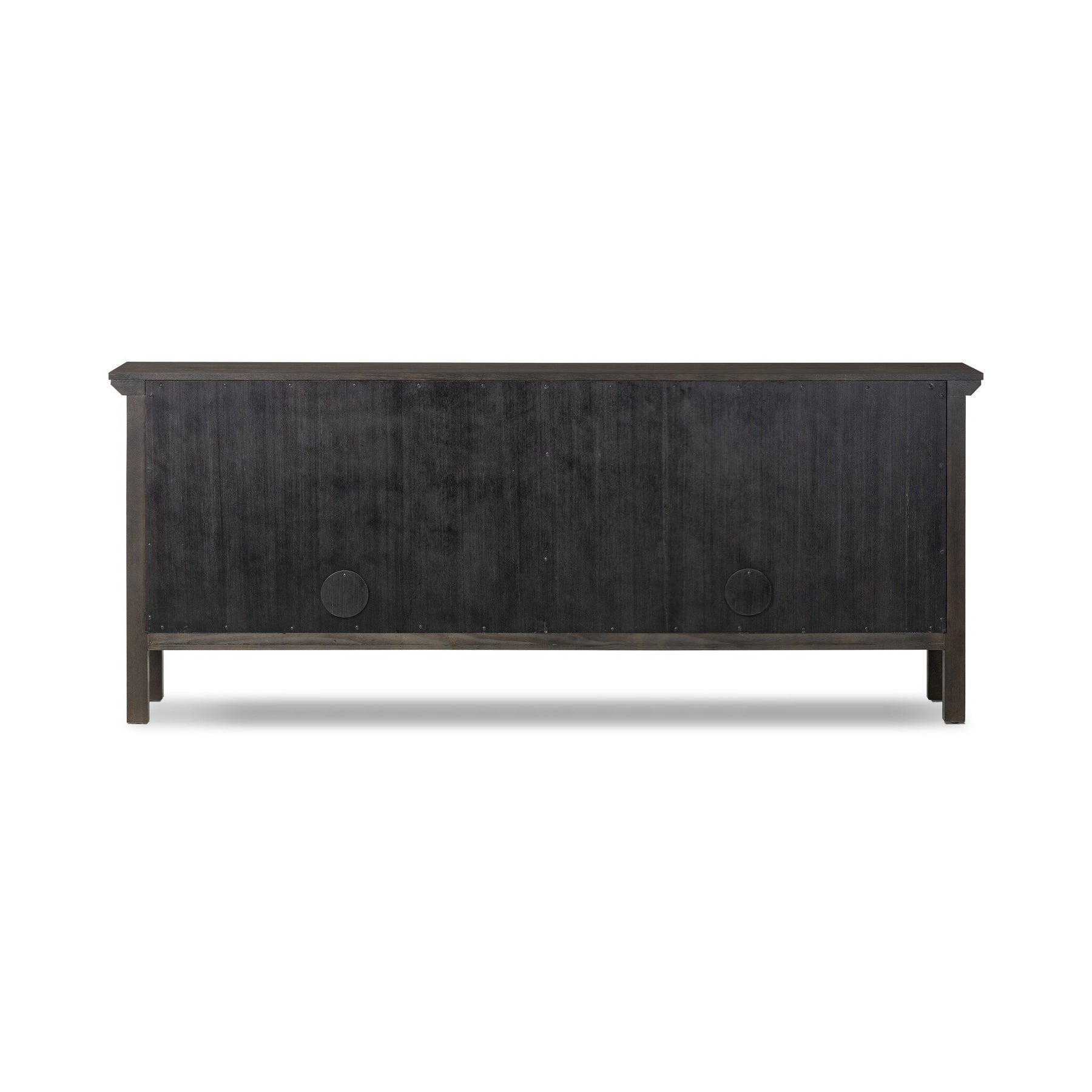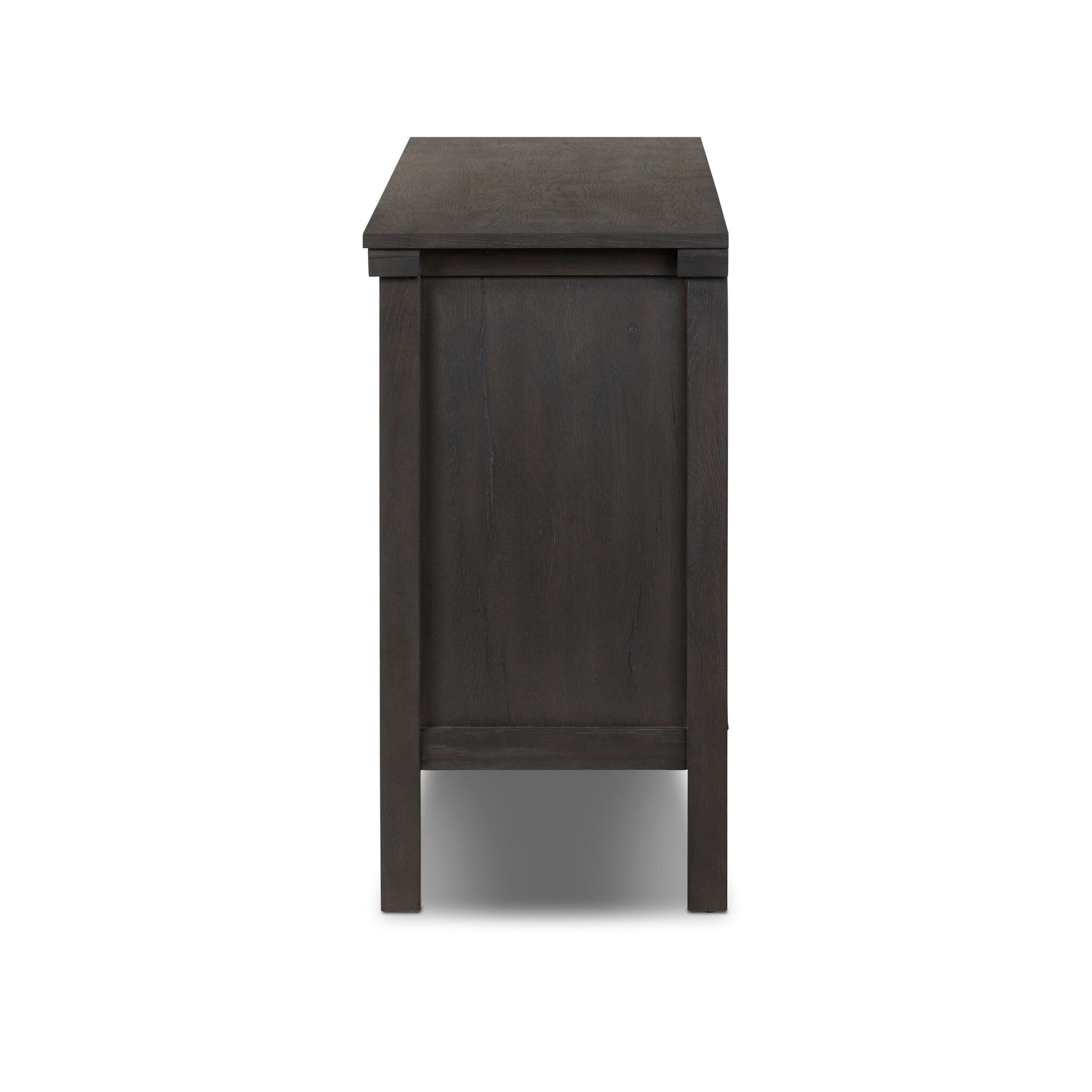 Long sliding doors with paper cord stripes inspired by Japanese teahouses bring a traditional look to this spacious sideboard. Made from oak in a smoked black finish, with a slightly oversized top.
