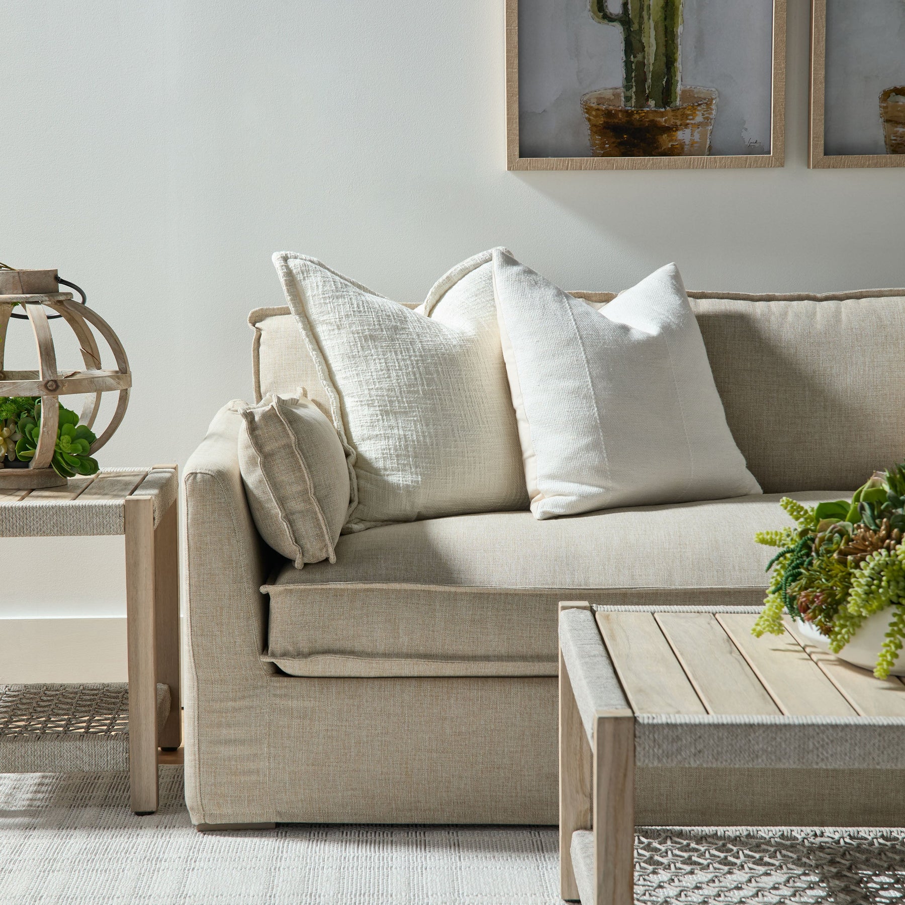 The Teo Slipcover Sofa blends elegant design with lasting durability. Built with a marine-grade plywood and solid Accoya wood frame, it withstands outdoor conditions effortlessly. Its 100% UV polyester slipcover is removable for easy care, while reversible cushions and plush fiber-filled seats offer both comfort and versatility. Perfect for stylish outdoor living.