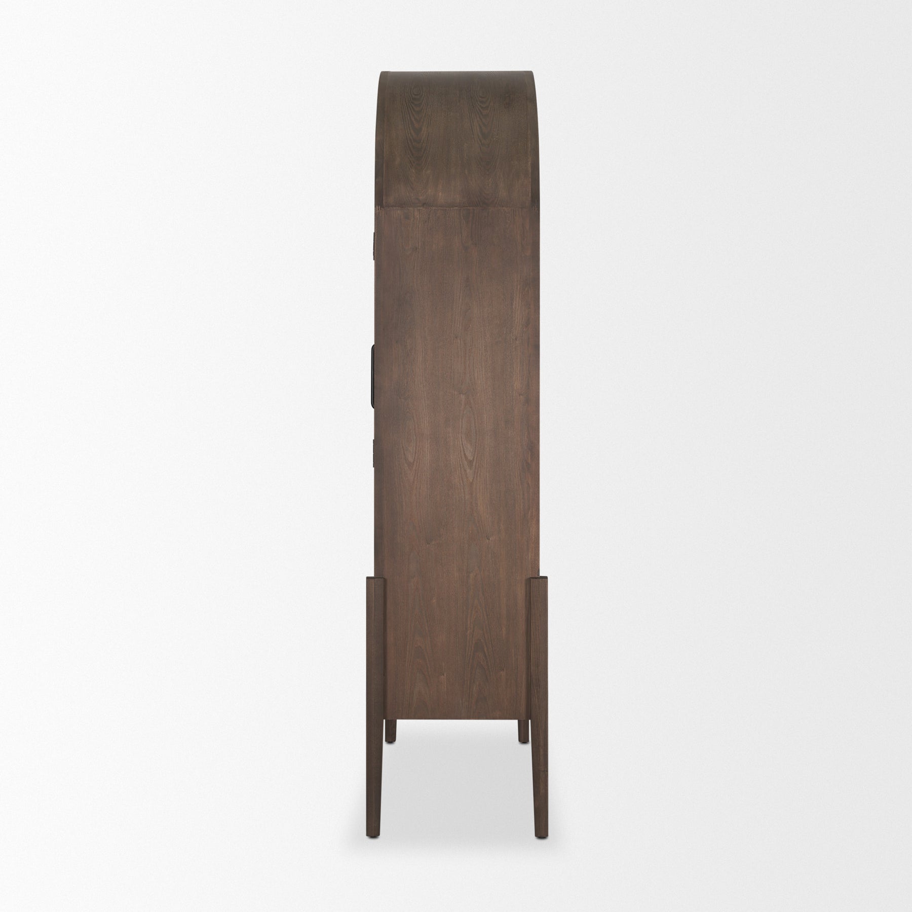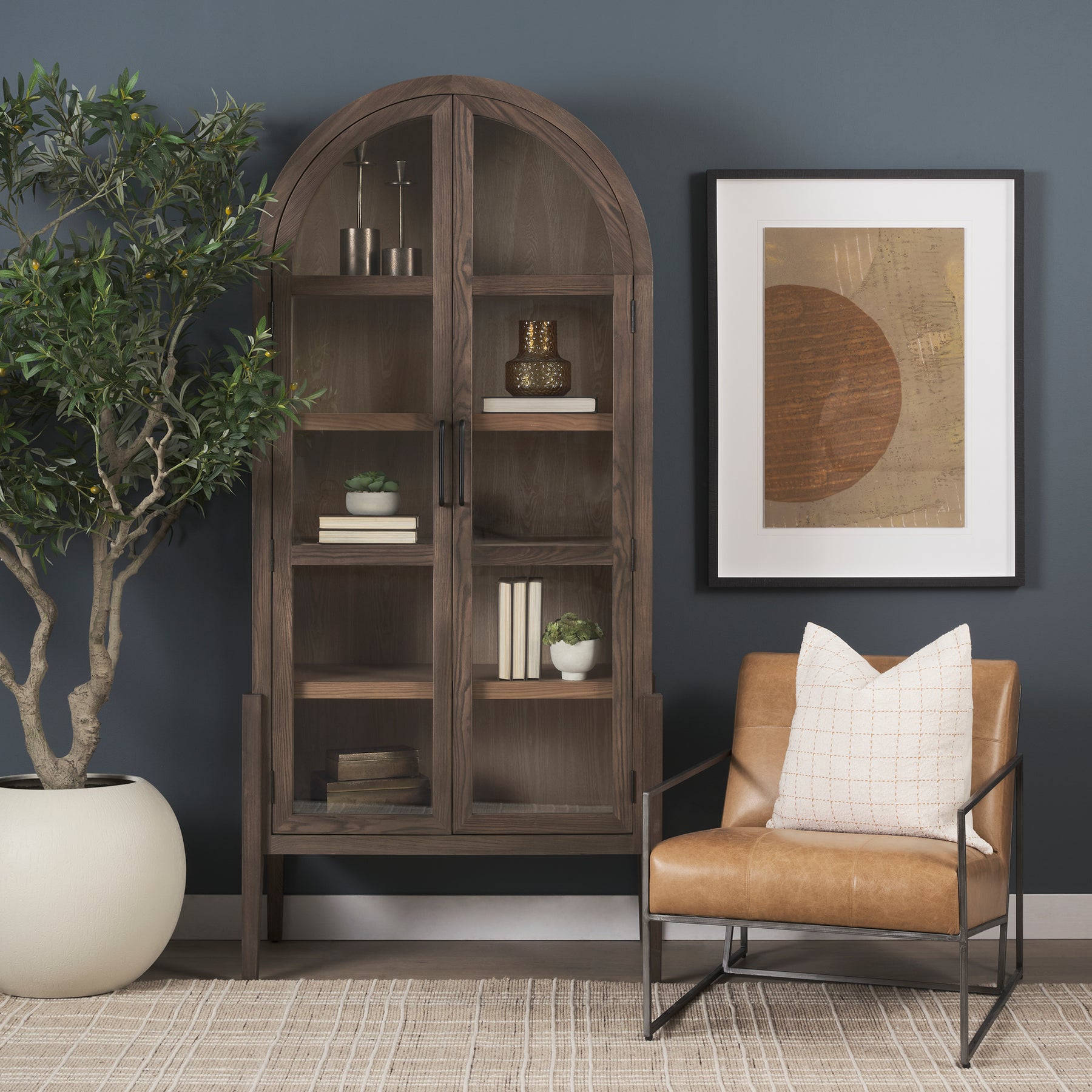 Trava is an arched curio cabinet showcasing a two-toned finish and two full-length, clear glass doors. Its dark exterior juxtaposed with a medium-light interior offers a striking yet harmonious contrast, providing the ideal canvas for showcasing your cherished decorative pieces, books, and other curated treasures.