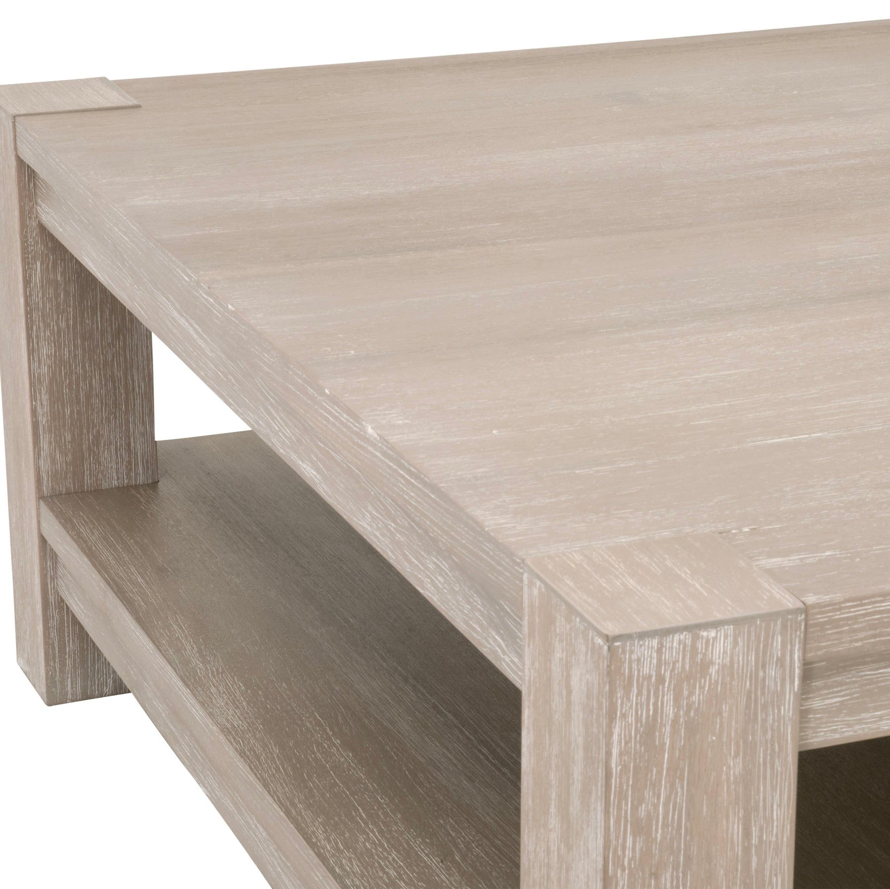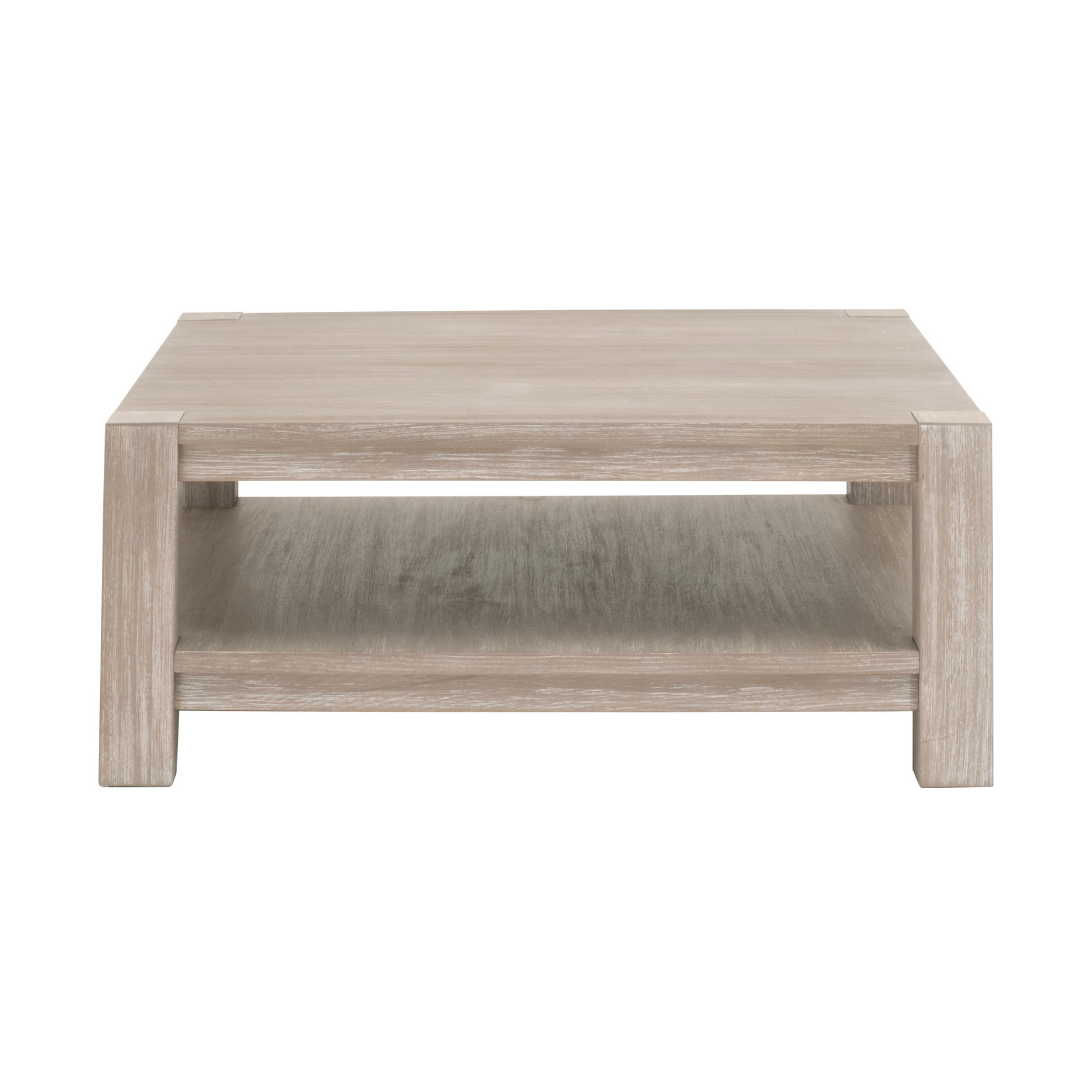 The Wade Square Coffee Table features a blend of solid beech wood and acacia veneer finished in natural gray, offering a warm yet contemporary appeal. Designed with a sturdy veneer top, legs, and solid wood apron, it ensures lasting quality. The added lower shelf provides functional storage while preserving its refined aesthetic, making it an enduring focal point in your living room.