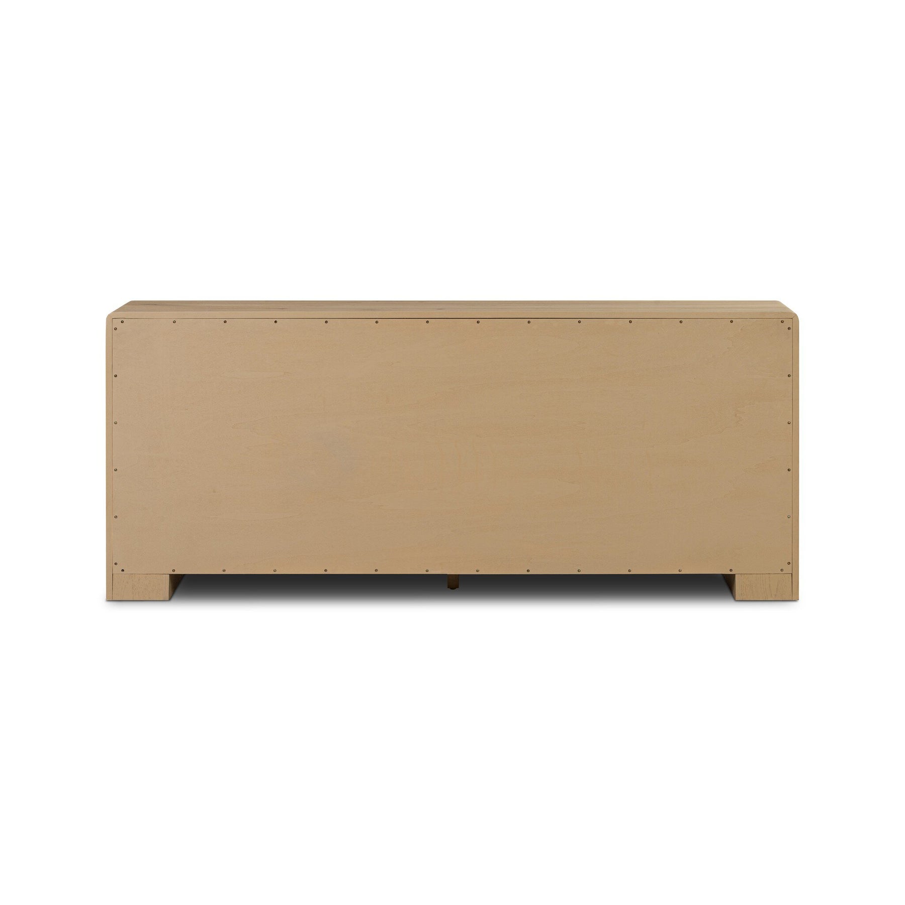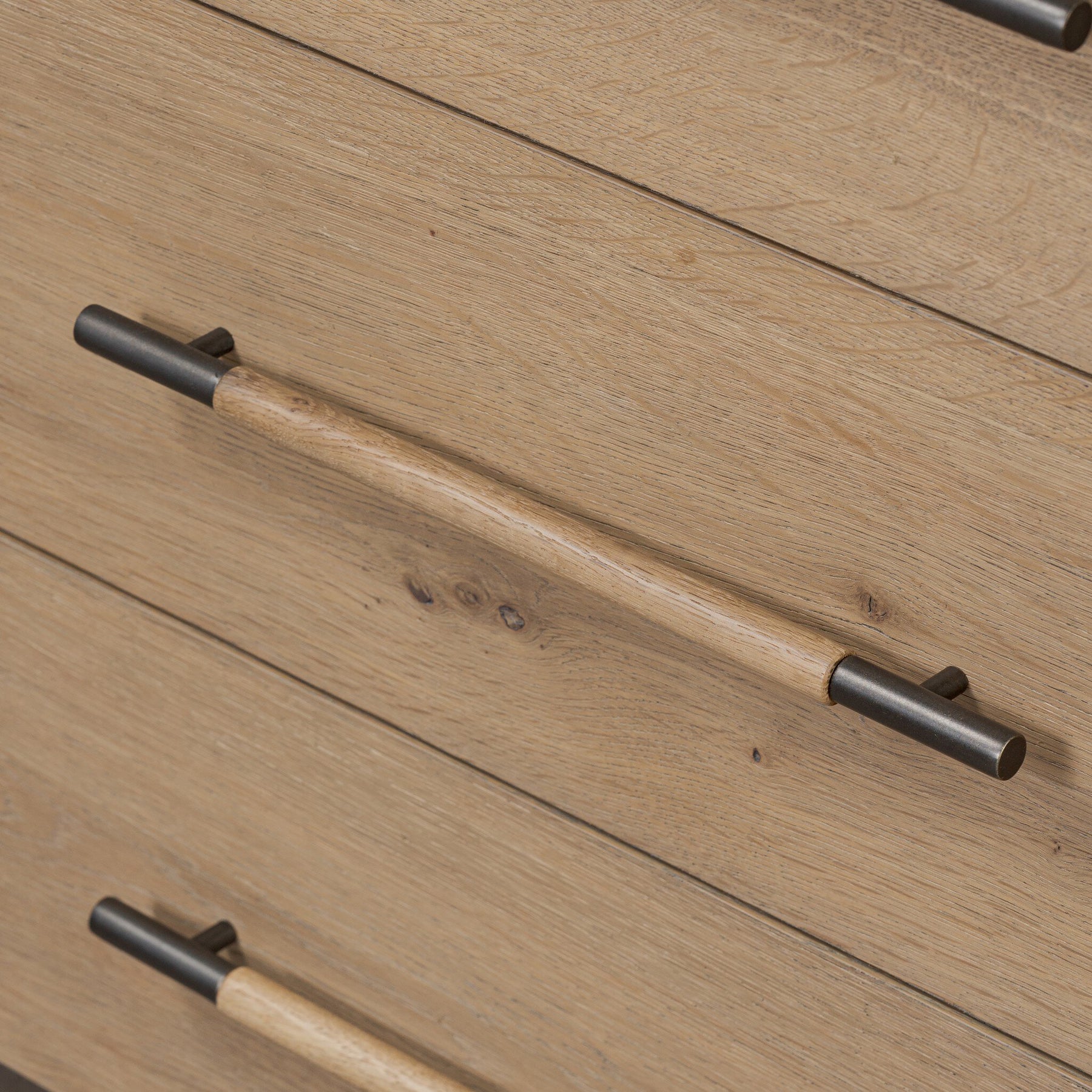 Simple and spacious, this oak dresser has six drawers paired with aged bronze and wood hardware. Waterfall shaping and soft-close undermount glides give a smooth finish.