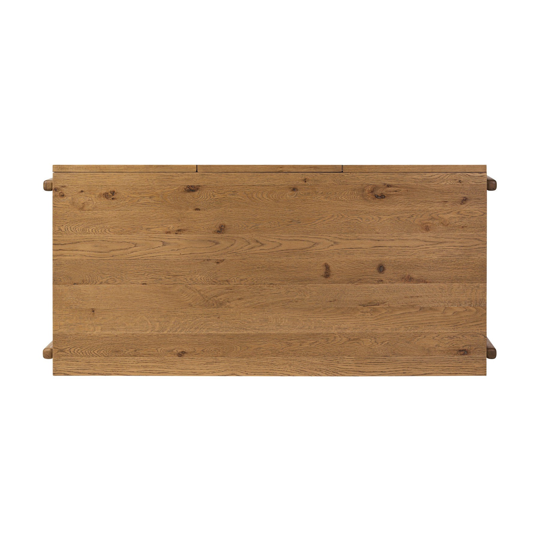 With a slim profile and light, worn finish, this oak desk works effortlessly into a range of spaces and styles. Contour-driven, with radius legs and cradle casing, plus three drawers finished with simple iron hardware in an oil-rubbed bronze.