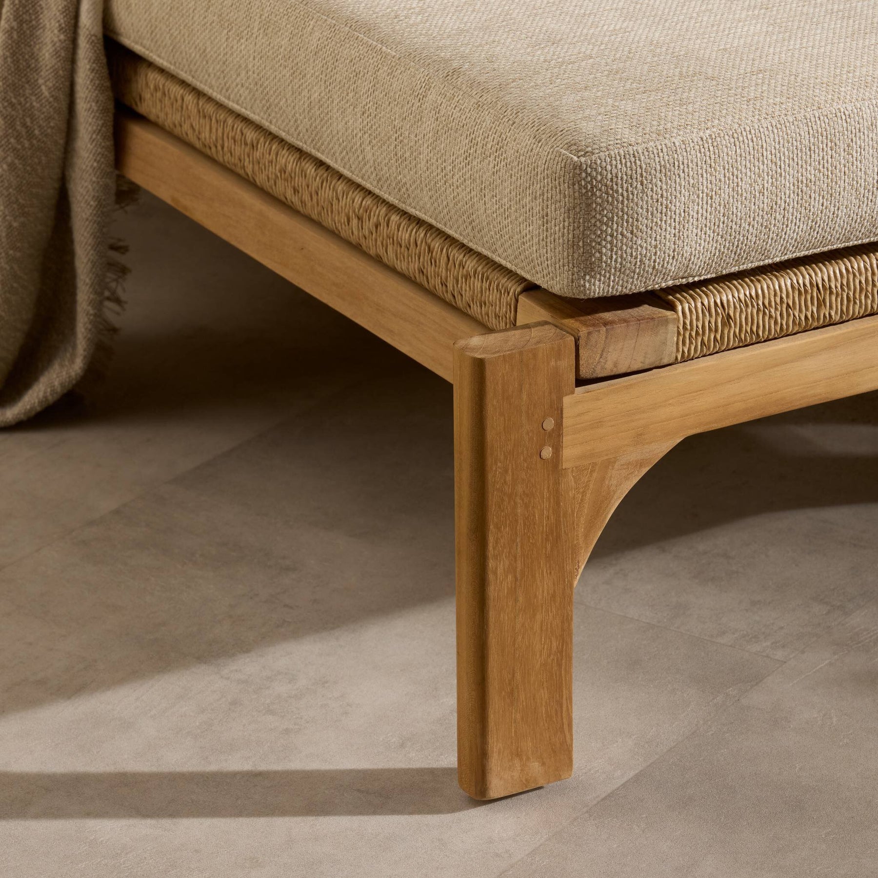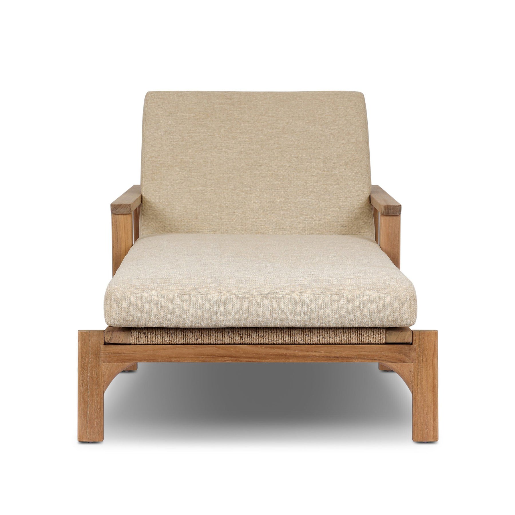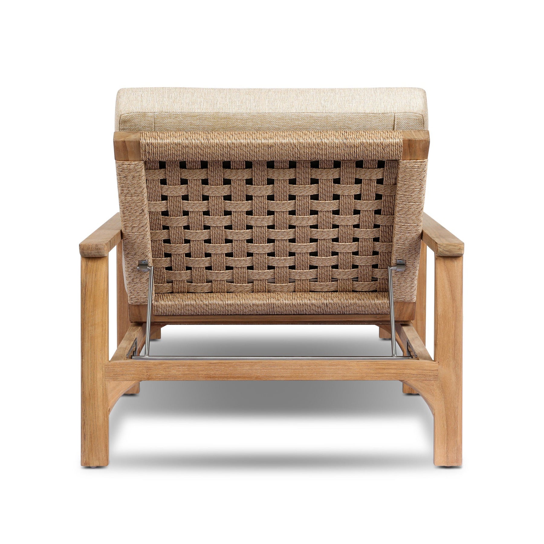 Classically shaped with a woven seat and adjustable back, this outdoor chaise lounge is framed by fine-sanded, grade A teak with no additional finish, allowing the natural grain to shine. Cover or store indoors during inclement weather and when not in use.