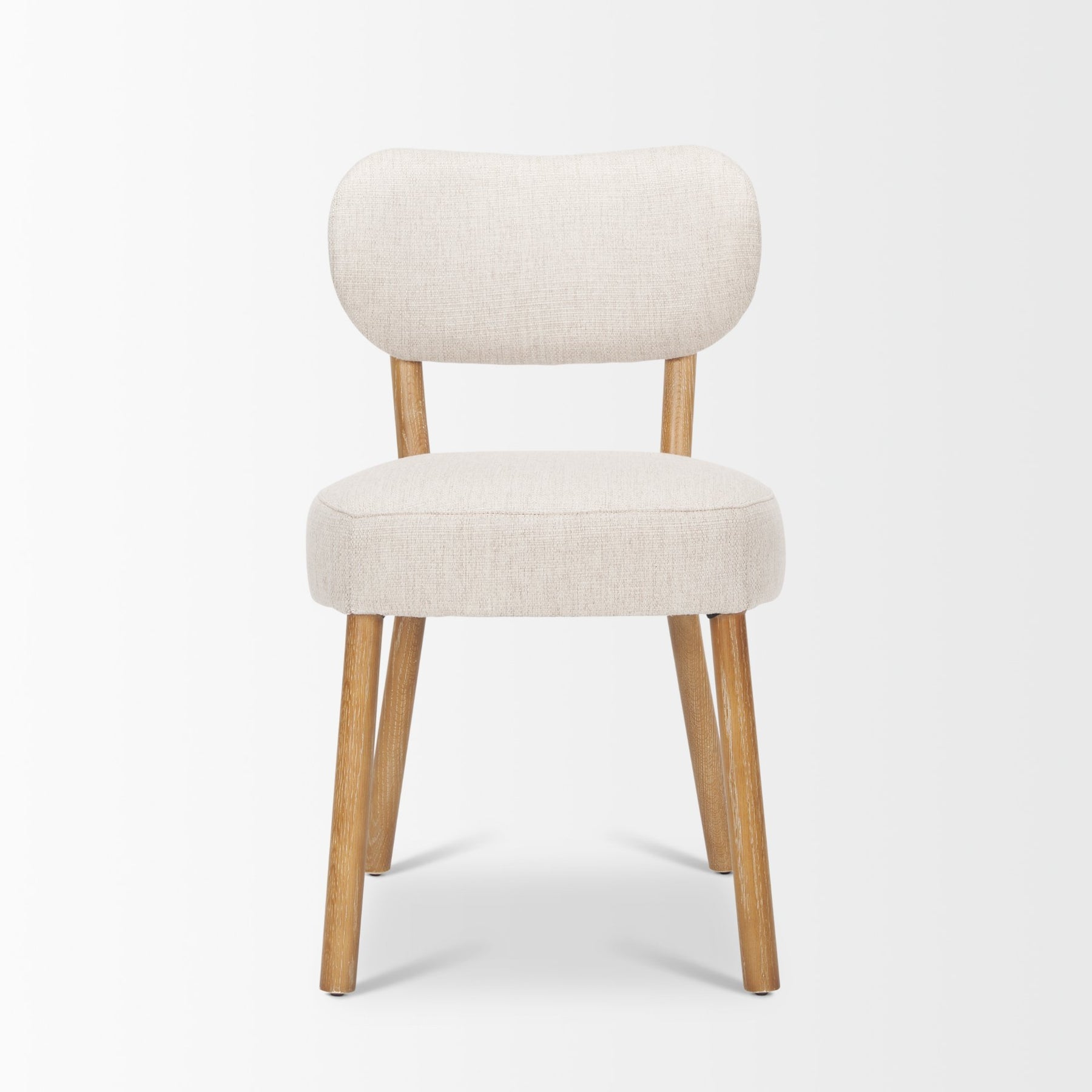 The Rouen Dining Chair has a medium brown wooden frame with white pickling and cushions upholstered in a luxe beige fabric.
