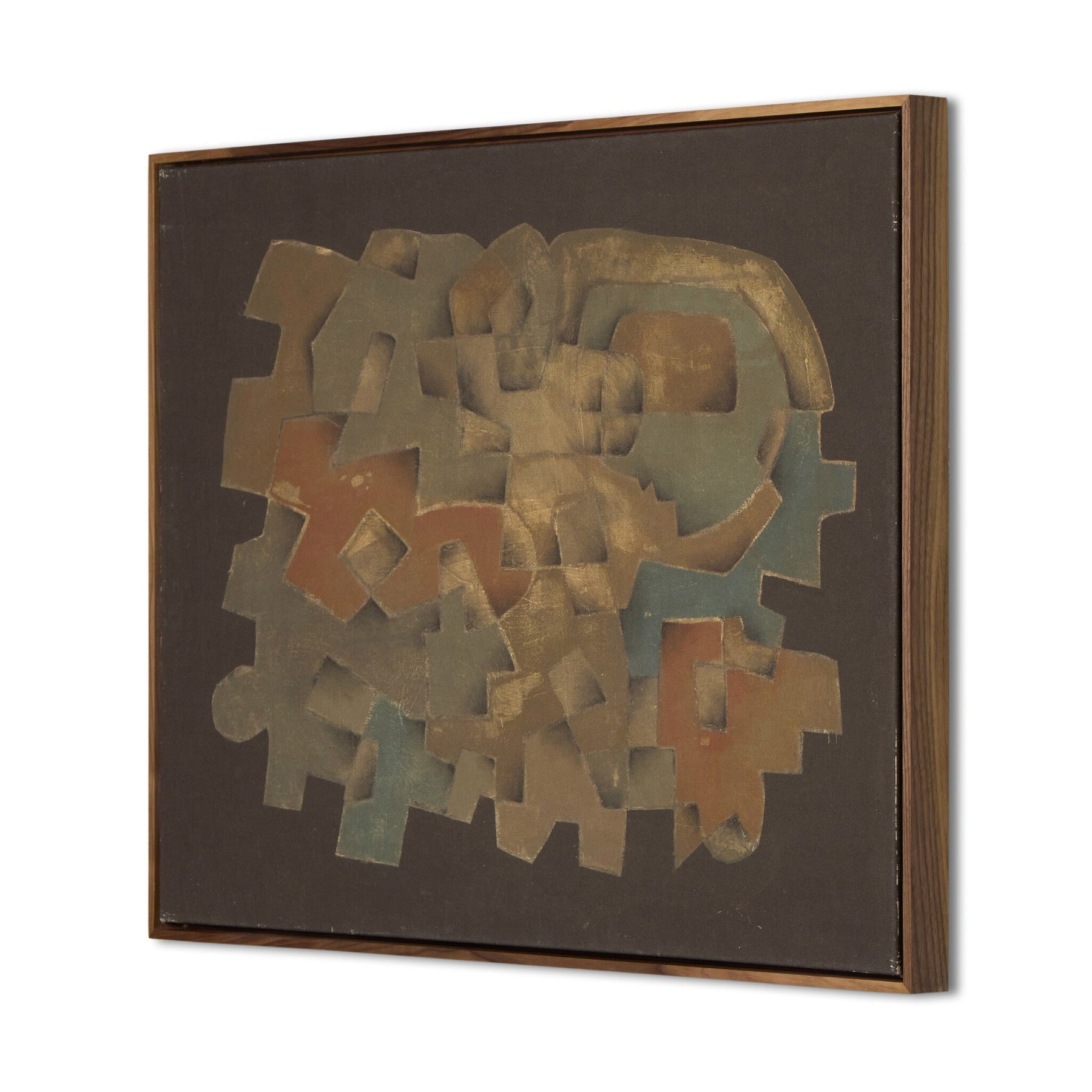 Self-taught artist Benjamin Galvan balances structure and cubist inspiration with organic sensibilities, enlisting various types of paint and materials like canvas scraps to create his uniquely patinaed works. Handmade in Austin, Texas.