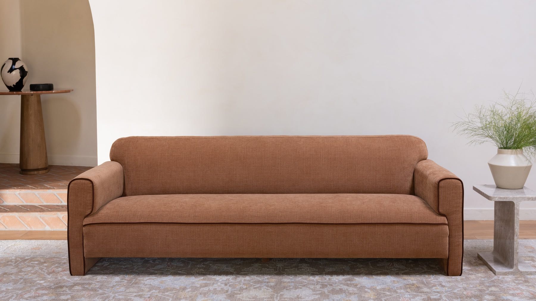 Striking from every angle, Leo reinvents the classic roll arm with a bold, modern edge—turning tradition inside out and creating the perfect place to kick back, relax, and hit ‘next episode’. Its squared side profile contrasts with inward-rolled arms and a sculptural curved back, creating a striking balance of form and function. With tonal contrast piping and fully upholstered legs, Lev blends sophistication with personality—proof design is all about the details.