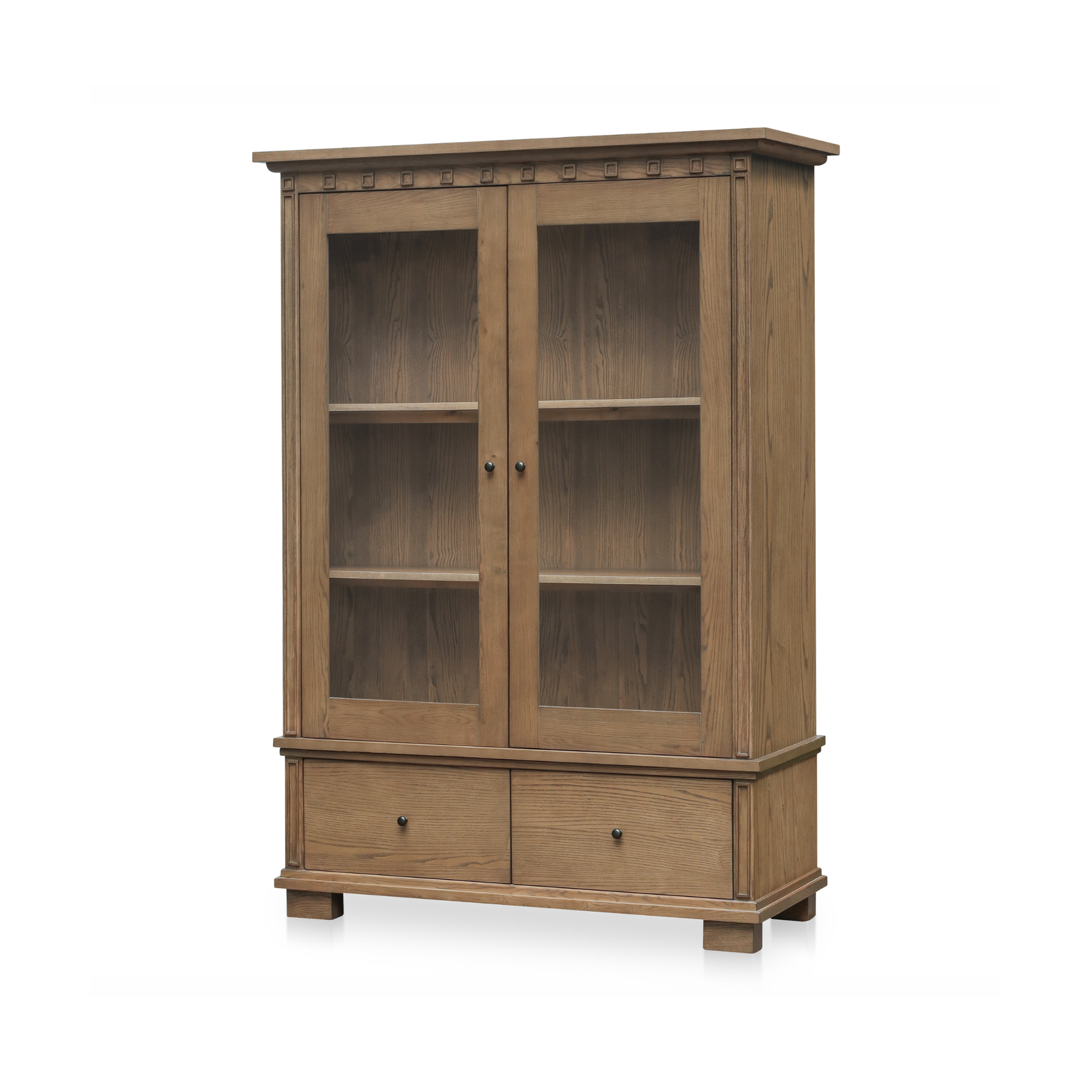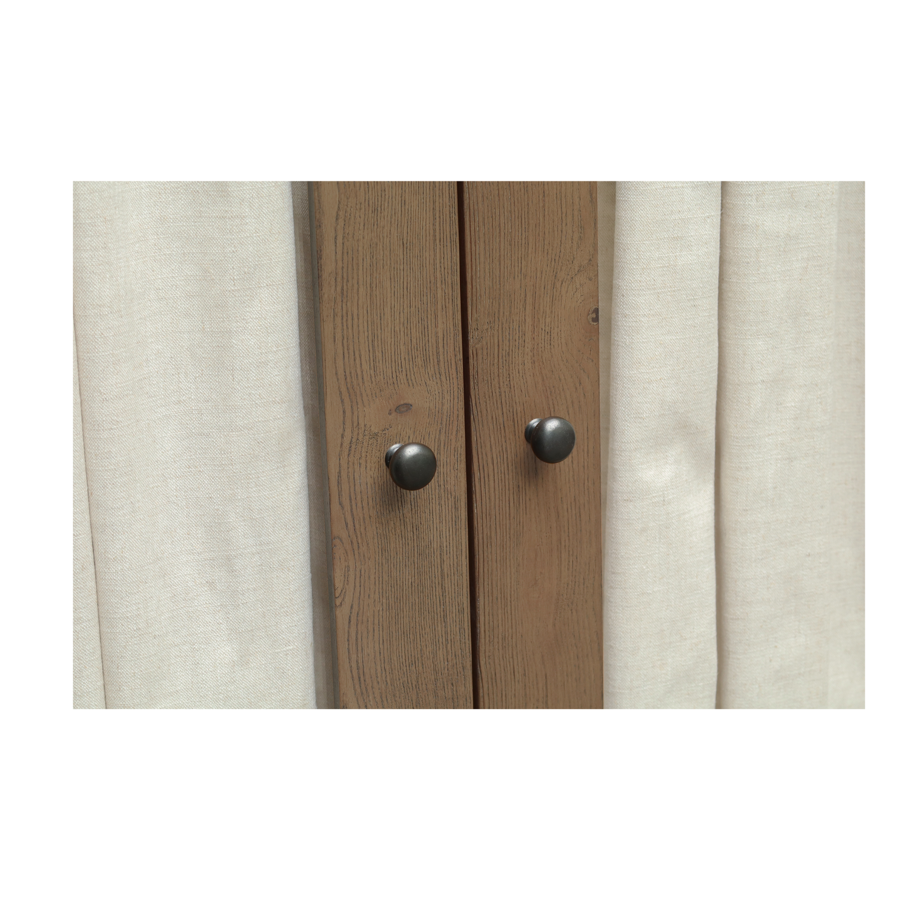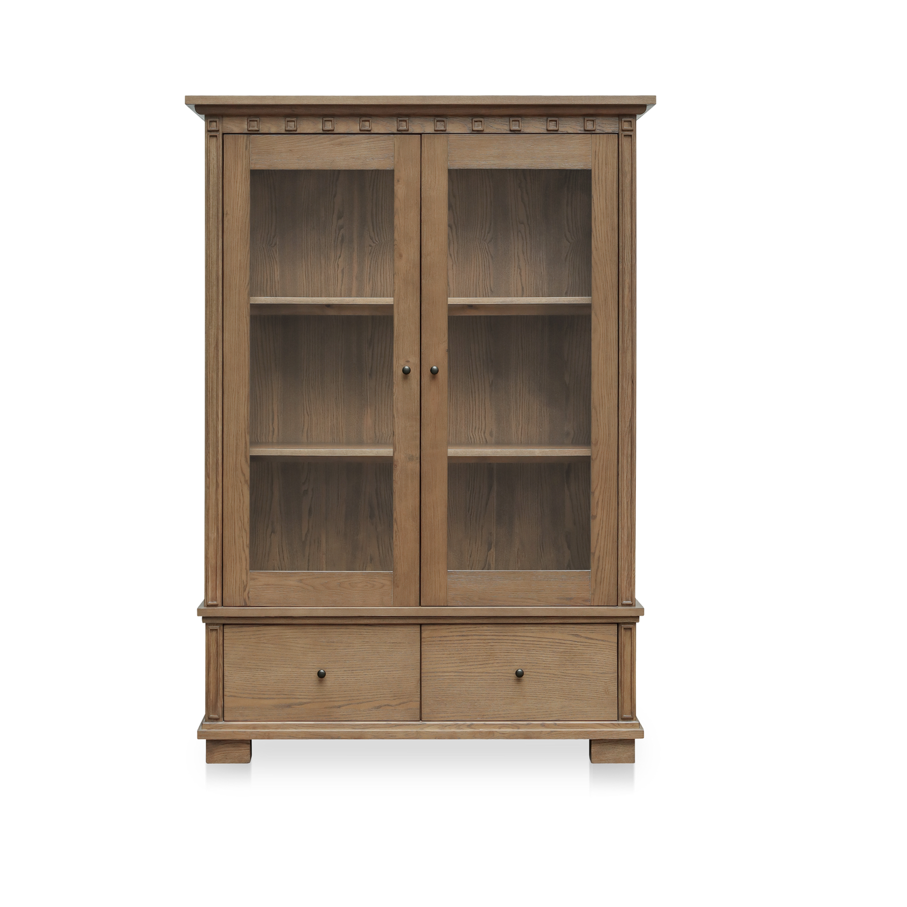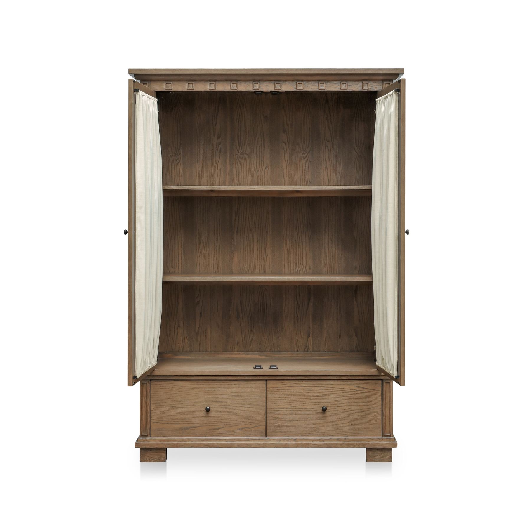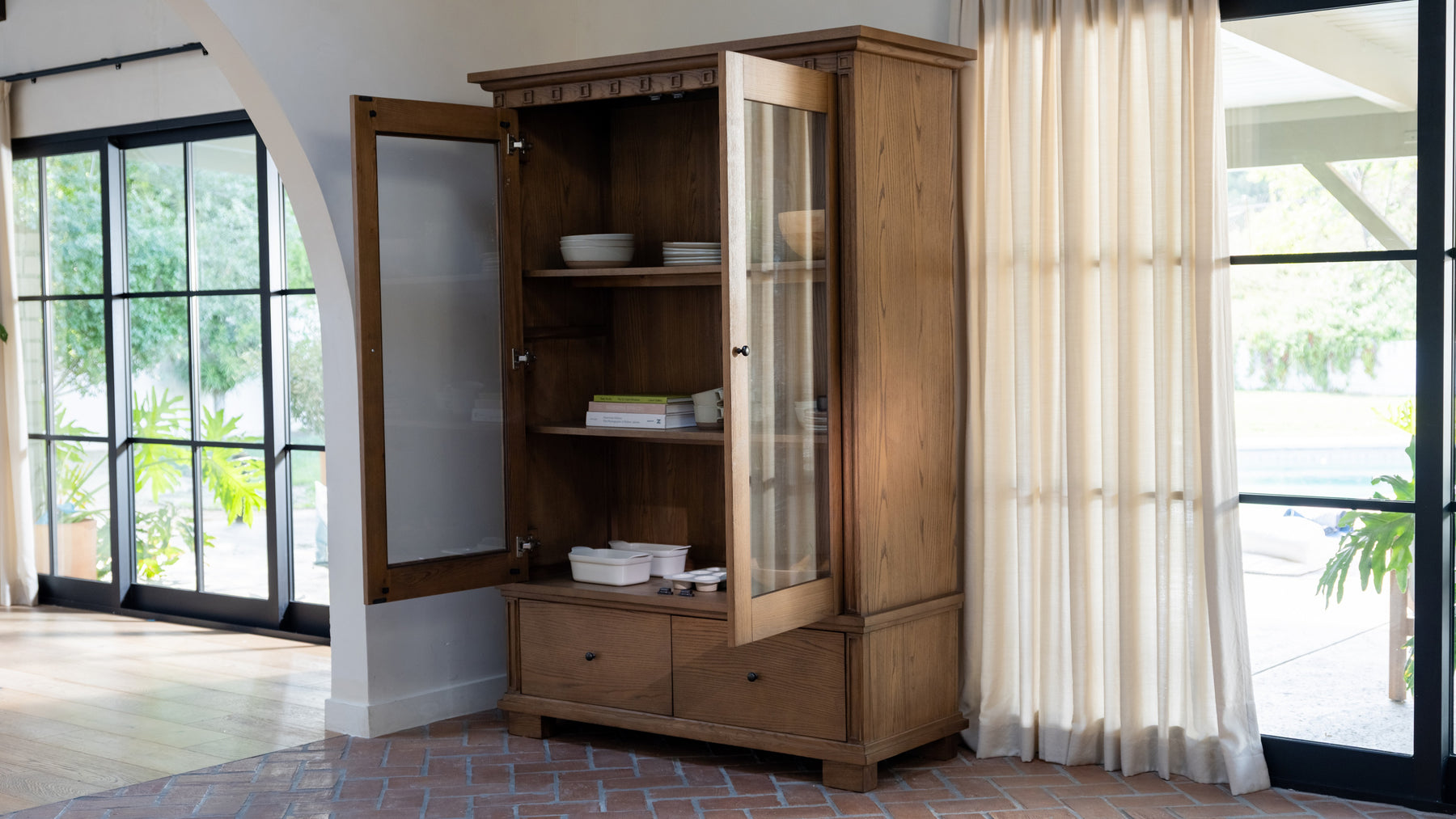 The Lila makes storage feel elevated. Framed in solid ash with glass doors, its tall silhouette pairs traditional molding with a warm brown finish. Inside, removable linen-textured drapery softens the display or can be taken out for a crisper look. Blackened bronze handles open to three shelves above and two deep drawers below—showcase up top, hideaway down low. A timeless piece designed to balance form and function.