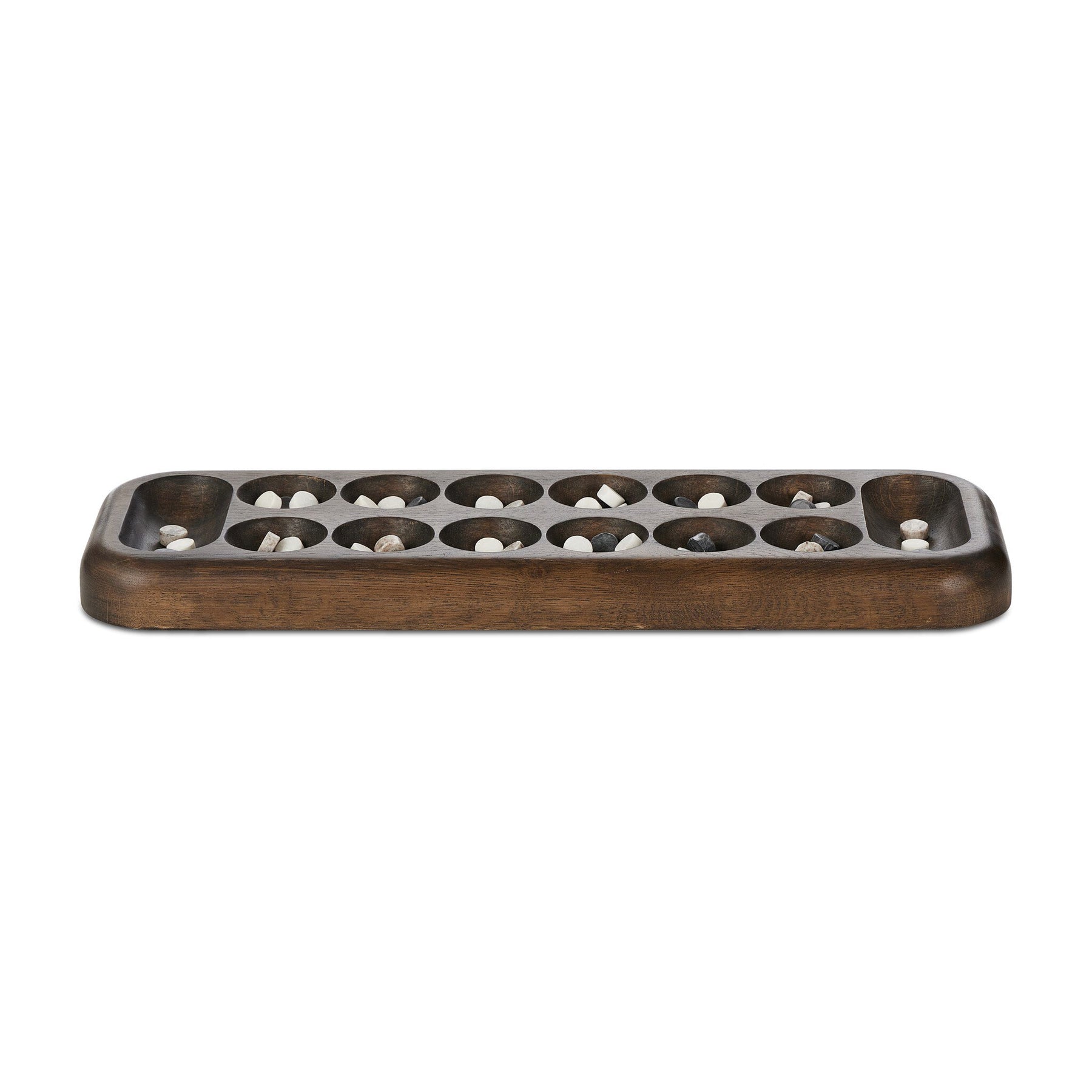 Crafted from deep brown oak with a smooth bullnose edge, this mancala board is precision CNC cut as a seamless single piece. The game pieces are elegantly fashioned from upcycled factory marble offcuts, sculpted into sleek, flattened cylinders.