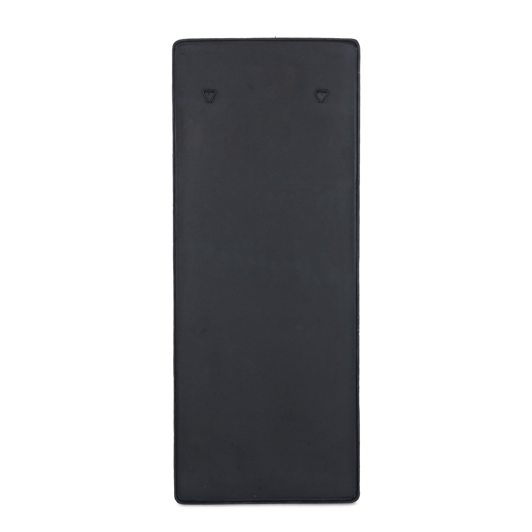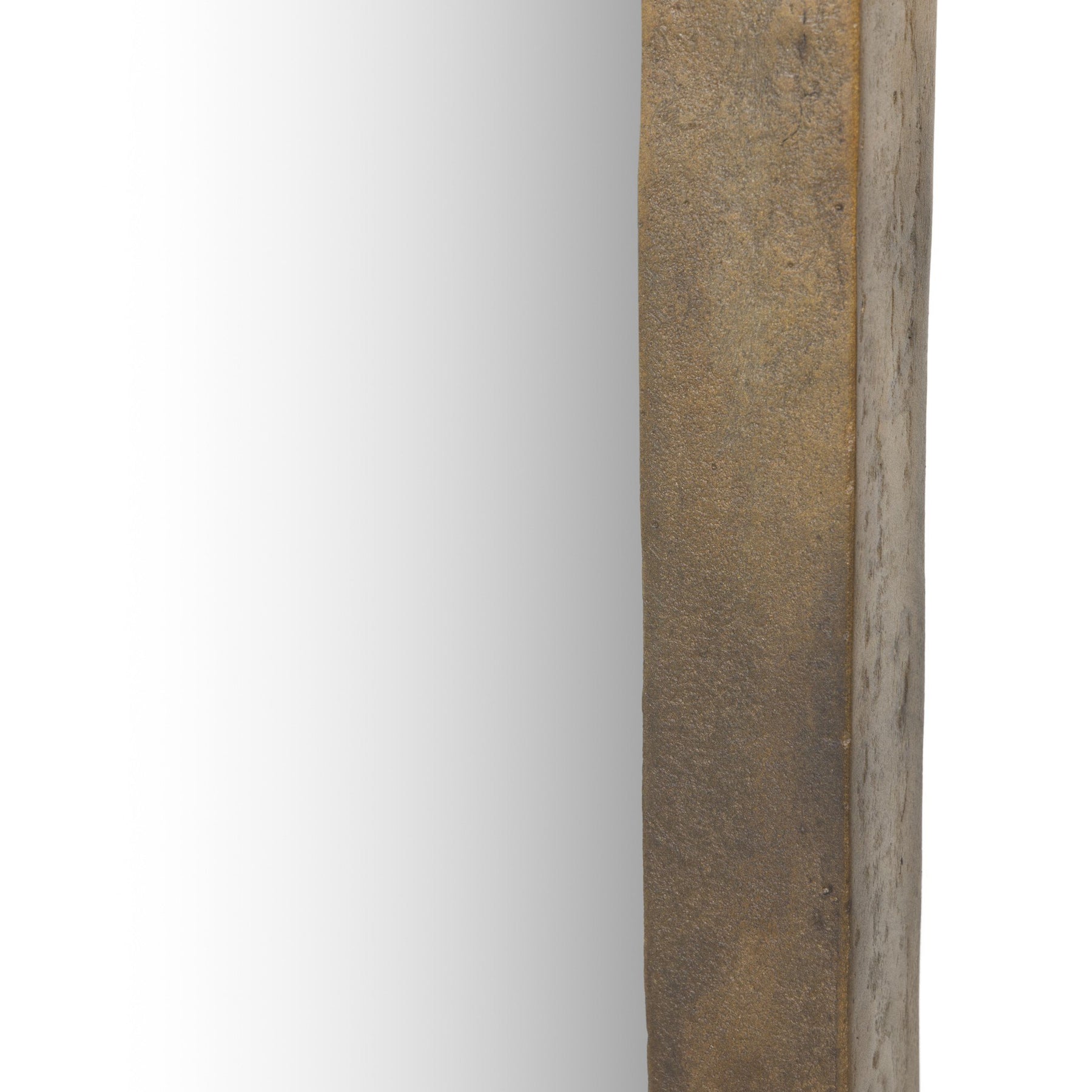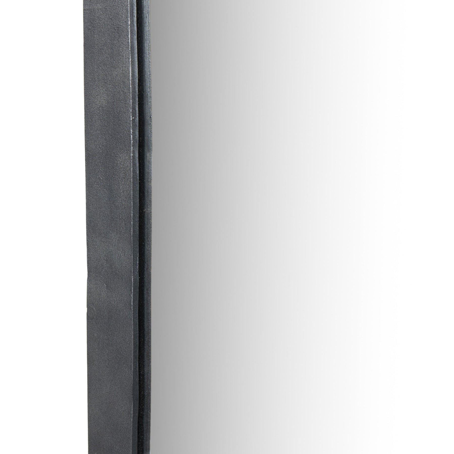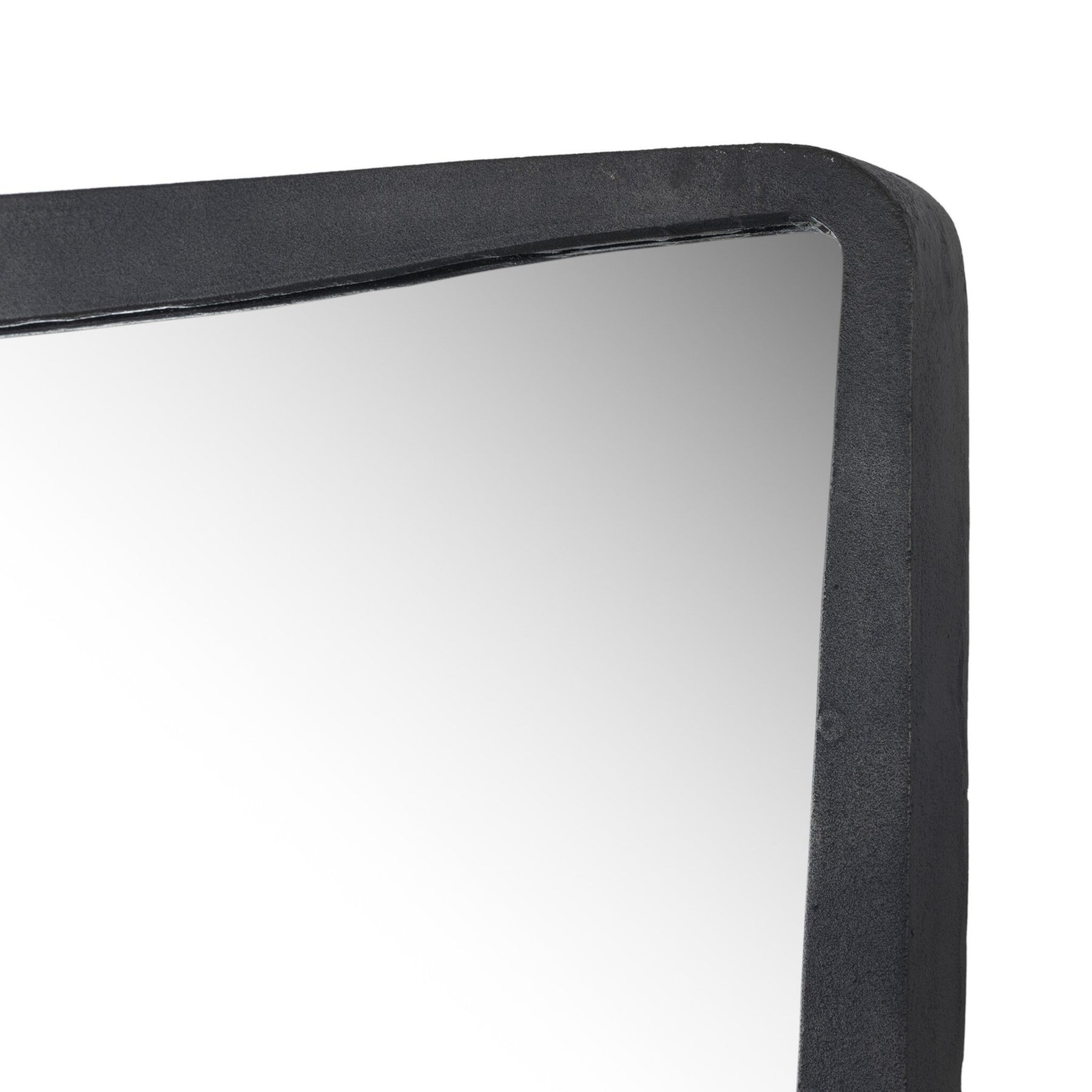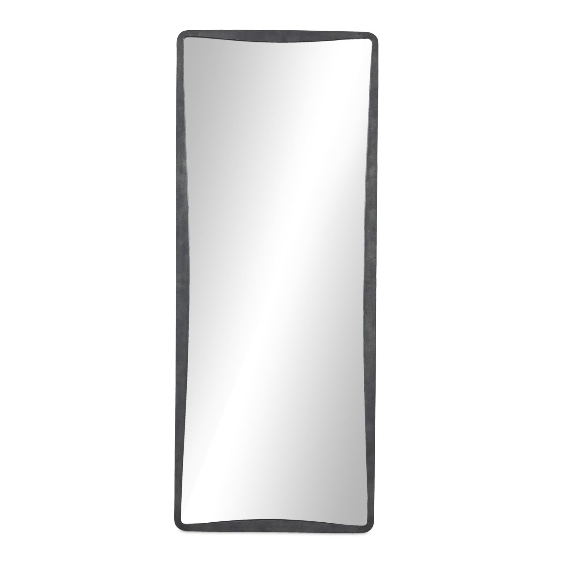 A classic floor mirror shape with a subtle hourglass bow takes inspiration from elegant calligraphy. Finished in an antique brass or hammered grey, substantial cast aluminum framing is balanced by tapered corners.