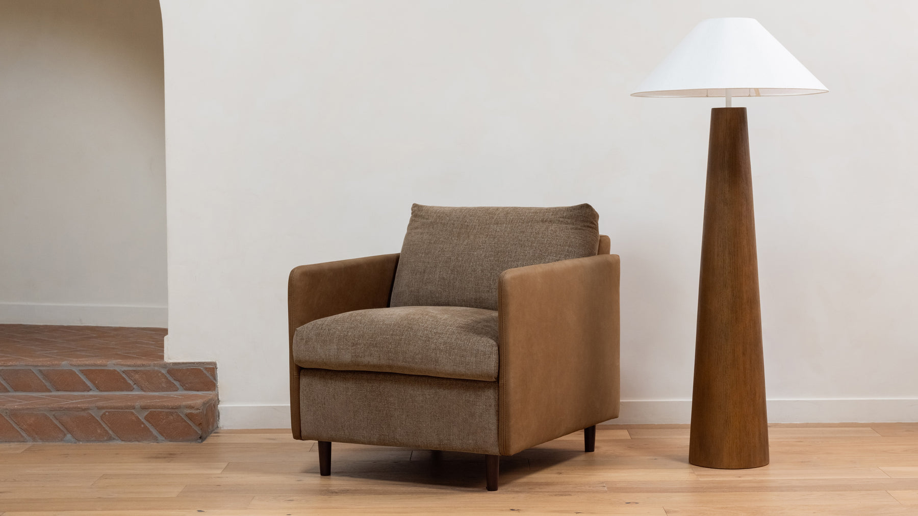 A little retro, a lot modern. The Tella Chair layers flecked fabric with top grain leather wrapping the arms and back for a tonal brown contrast. Cushioned with foam, fiber, and faux feather fill, the seat is soft yet supportive. Slim rubberwood legs lift the look with mid-century ease. A study in balance, Teller shows how mixed materials can be both vintage-inspired and refreshingly new.