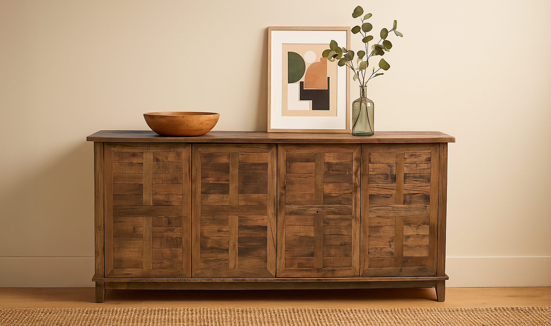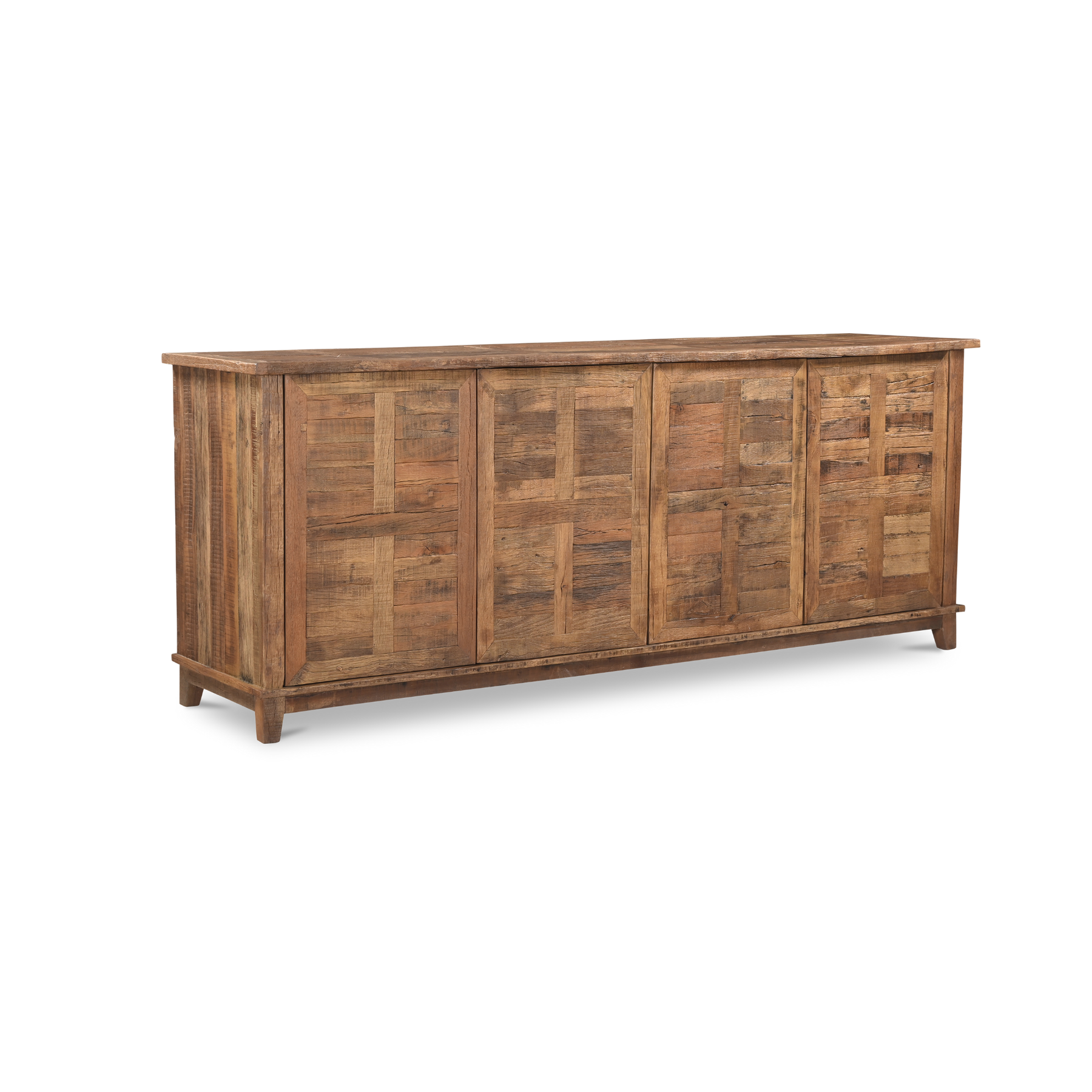 History in every panel. August brings a heritage character to a classic silhouette. Crafted from reclaimed wood once used in India’s railway system, each strip has been naturally seasoned over time—giving the piece its rich tonal variation and weathered charm. Vertical and horizontal panels create a quiet rhythm across the front, while subtle overhangs on the top and base nod to tradition. Rustic in material, refined in shape—this one tells a story without saying a word.
