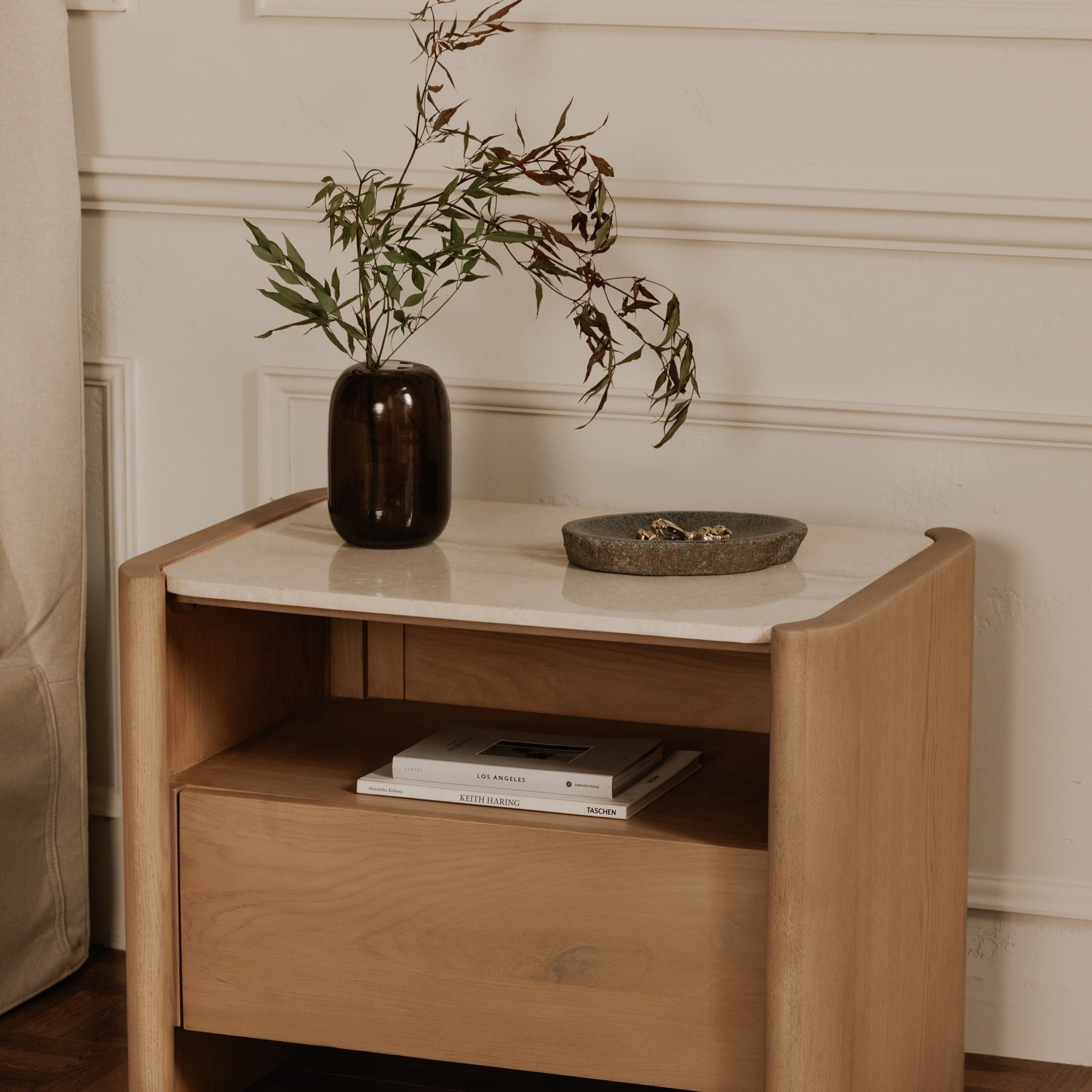 The Leni nightstand captures the essence of Scandinavian modern design. Its sleek, solid oak frame is accented by thick, curved elements that soften its silhouette, allowing its inset Italian Botticino marble top to take centerstage as its rounded overhang gracefully complements its open and closed storage that features under-mounted glides.